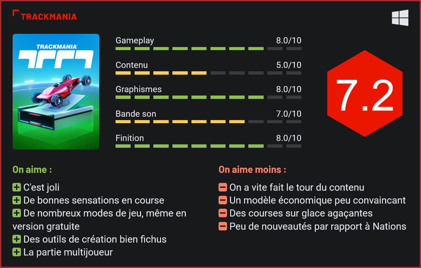 15 ans après le désormais culte Nations, Trackmania nous revient avec une réédition de cet épisode grandement apprécié des fans. Mise à jour du moteur graphique et du modèle économique mais aussi des outils de création, le programme des nouveautés est alléchant. Célèbre pour le côté décalé de ses courses automobiles, la série des Trackmania rayonne grâce à la nervosité de ses courses et la quasi-verticalité de celles-ci. Le principe est pourtant très simple : des circuits déjantés sur lesquels un chronomètre pousse le joueur dans ses ultimes retranchements tout en étant toujours “seul” sur circuit. En 2006, les développeurs de Nadeo nous proposaient Trackmania Nations, une version gratuite de leur jeu de courses. Celle-ci ne révolutionnait pas le genre, mais était suffisamment complète et appréciable pour finir par comptabiliser plus de 6 millions de téléchargements en seulement deux mois. Nadeo nous propose ainsi de revenir sur ce titre désormais culte, en ne changeant pas énormément la formule. D’ailleurs, le jeu conserve exactement les mêmes mécaniques de gameplay que son ancêtre. Le die & retry reste l’essence-même du jeu, comme le prouve la possibilité de recommencer à tout moment la course depuis le menu pause ou même avec une simple touche. Un système de jeu qui peut probablement rebuter les amateurs de simulations automobiles pures et dures, mais qui a fait, et qui fait toujours, le succès de la franchise d’Ubisoft. Peu de place à l’erreur en course donc, il est primordial de calculer chaque dérapage en virage, au risque de vite se retrouver dans la rambarde de sécurité au volant de l’unique voiture du jeu. Trackmania 2020 est exigeant, et chacun des 4 types de circuits le fait bien comprendre au joueur. Si les courses sur terre ou métal sont appréciables, on regrettera la quasi impossibilité à rouler sur la piste de glace. Piloter un véhicule sur une flaque d’huile n’est pas une partie de plaisir, et les joueurs qui apprécieront cette configuration risquent de se faire rares. En revanche, mention spéciale pour la route bombée. Elle oblige une concentration et une maîtrise parfaite du bolide, celui-ci pouvant vite se retrouver éjecter hors du circuit. Si le gameplay reste sensiblement le même dans ce remake, force est de constater que le travail sur l’aspect global du jeu vaut le détour. Là où Trackmania Nations améliorait fortement les graphismes et affinait les textures par rapport à son prédécesseur, cette version 2020 est, il faut bien l’avouer, encore plus belle. Les voitures ont été retravaillées, tout comme les circuits, le stade et les différents éléments du décor qui, sans être éblouissants, restent très convaincants. Les effets de lumière sont impressionnants, notamment sur la piste et les voitures. Le jeu s’avère très joli et la patte colorée de la saga est reconnaissable. La franchise Trackmania est également reconnaissable de par sa patte fun et colorée. Sans tomber dans le côté cartoonesque, le titre parvient sans peine à allier la nervosité et la rapidité des parties à la touche ludique de l’environnement. Le jeu est d’ailleurs connu pour être plus arcade que simulation, d’où ce choix artistique. Comme son ancêtre Nations, Trackmania cuvée 2020 voit son intérêt principal dans sa gratuité. Les développeurs ont pensé le titre autour de sa gratuité et l’absence de DLC agrémentant le contenu déjà présent était un réel plus. Si ce système était la pierre angulaire de Nations, ce nouvel épisode voit sa formule réinventée, et de manière peu avantageuse pour le joueur. Les développeurs misent toujours sur une version de base gratuite, comme dans le jeu original. Afin d’éviter de permettre l’achat d’une version complète et onéreuse, ceux-ci ont opté pour un service d’abonnement en plusieurs formules, dont le prix passe vite du simple au double. La version de base, gratuite, se voit malheureusement amputée de plusieurs fonctionnalités du jeu originel, mais intègre toutefois un contenu généreux puisqu’on y retrouve: Les 25 niveaux d’entraînements La campagne trimestrielle de 25 niveaux Le multijoueur local La possibilité de joindre un serveur local Le créateur simplifié de niveaux Le mode entraînement propose 25 circuits initiant le joueur aux mécaniques du jeu et aux différentes complications en courses. Il fait d’ailleurs partie de la version de base gratuite. Si cela peut s’avérer suffisant pour un jeu purement gratuit, le tour de piste est vite fait et la lassitude peut vite pointer le bout de son nez. Trackmania propose une offre Standard et une offre Club. L’abonnement Standard (10€/an) embarque le contenu de l’offre gratuite, auquel s’ajoutent : La piste du jour L’accès aux anciennes campagnes et aux pistes du jour passées Les campagnes publiques des clubs La création d’un serveur local Le créateur avancé de niveaux Enfin, une souscription premium, appelée Club (30€/an ou 60€/3 ans), propose l’accès à toutes les fonctionnalités liées aux clubs. Elle permet ainsi de créer et de customiser son propre club et d’accéder à de multiples options liées au mode multijoueur. Si l’intérêt du titre réside principalement dans la confrontation entre le joueur et la communauté, le joueur qui joue purement solo ou en multi basique devrait trouver son bonheur dans la version gratuite du titre. S’il souhaite se lancer dans la création de contenus (circuits, vidéos, …), la facture s’alourdira légèrement, sans toutefois atteindre des sommes mirobolantes. On regrettera par ailleurs la possibilité d’acheter le jeu complet d’une traite, sans avoir à passer par un abonnement récurrent et qui peut vite paraître démesuré au fil des années. Les modes multijoueurs sont quant à eux nombreux, que ce soit dans l’offre gratuite ou payante. Il est, comme dans la