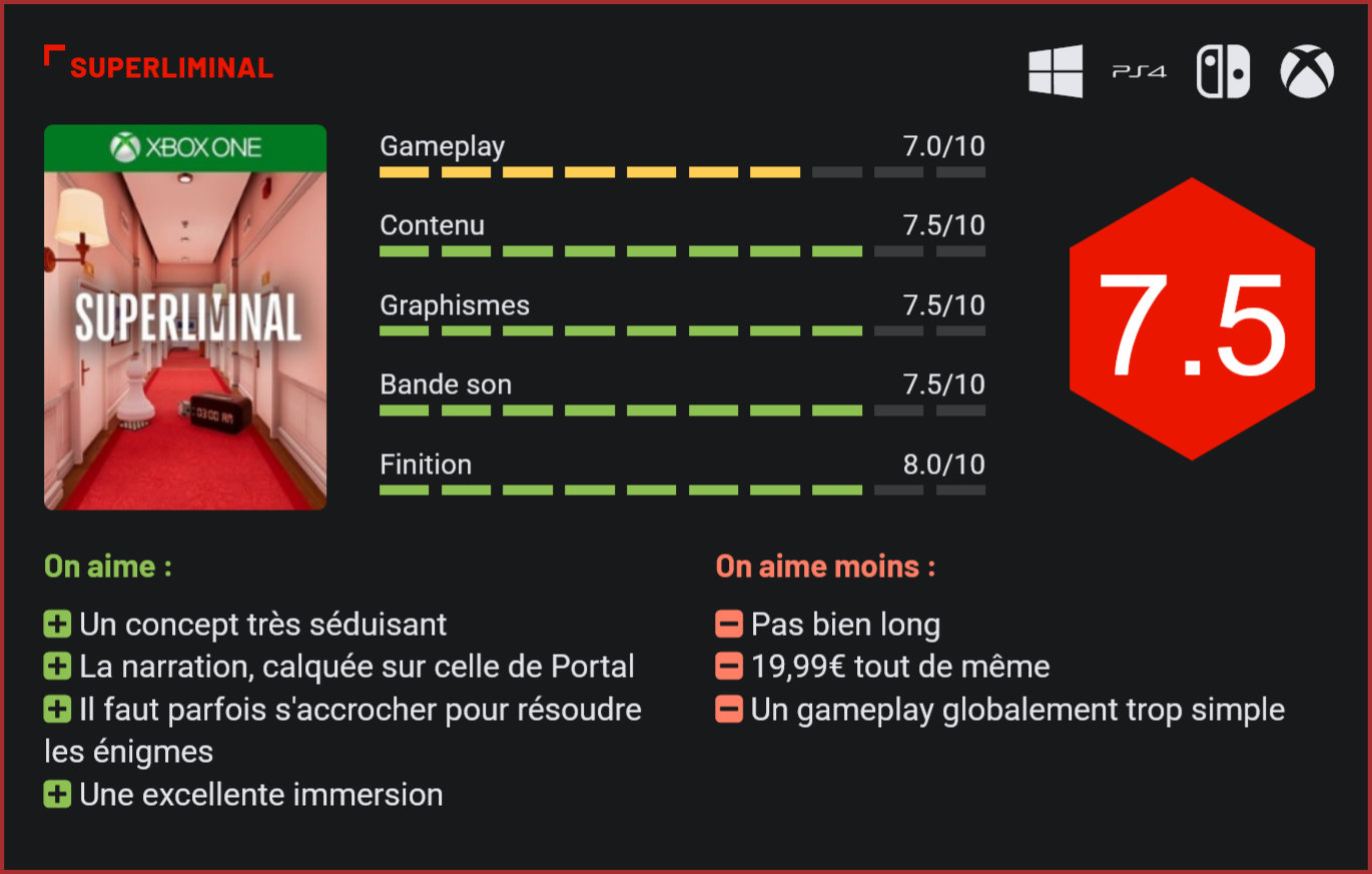 Sorti en 2019 sur PC, le très sympathique Superliminal a aujourd’hui droit à un portage sur consoles. L’occasion de découvrir l’une des bonnes surprises indé de 2019. Passé relativement inaperçu au moment de sa sortie sur PC en 2019, Superliminal aura attendu sa sortie sur consoles en ce mois de juillet 2020 pour finalement faire parler de lui. Ce puzzle-game atypique qui s’inspire très ouvertement de l’excellent Portal joue la carte de la perspective pour sortir du lot. Toutes les énigmes devront être résolues en jouant avec la perspective du joueur. Un concept très ludique. Les niveaux se montrent parfois très créatifs. Superliminal s’inspire assez ouvertement de Portal, tant au niveau de sa narration (une voix féminine donne le déroulé des épreuves au joueur entre chaque salle) que de son déroulement (les niveaux étant découpés en salles, dans lesquels les joueurs doivent généralement résoudre un à plusieurs puzzles en jouant avec non pas les lois de la physique mais la perspective). Dans Superliminal, le joueur se retrouve en effet embarqué dans une drôle d’expérience dans un centre fermé, pour laquelle il s’est porté volontaire. On ne vas pas vous le cacher, le scénario n’est pas forcément très passionnant. En revanche, les développeurs sont parvenus à brillamment immerger le joueur dans cet univers. Très accessible, le jeu joue la carte de la sobriété, tant des environnements que dans sa prise en main. Les commandes restent très simples : on utilise le stick gauche pour se déplacer, un bouton pour sauter et un bouton pour soulever des objets / les lâcher ou appuyer sur un bouton. La difficulté vient ici des “énigmes” à résoudre. Artistiquement, le jeu est plutôt réussi. Comme nous l’avons dit plus haut, tout le concept du jeu repose sur ces “perspectives” : un minuscule pion posé sur une table peut se transformer en un gigantesque pion si vous le prenez entre vos mains et le reposez à distance. En vous en rapprochant de nouveau, vous verrez que sa taille a changé. Et cela vaut pour tous les types d’objets rencontrés dans le jeu : des meules de fromage aux cônes en passant par les cubes ou les horloges. Les puzzles rencontrés ne se contenteront pas de jouer avec la taille des objets mais aussi plusieurs autres facteurs, comme l’alignement de plusieurs objets par exemple. Les premières énigmes sont faciles à résoudre, les suivantes beaucoup moins. Globalement, le jeu séduit surtout par l’originalité de son concept et l’immersion qu’il propose. L’intégralité du jeu se jouant à la première personne, le joueur se sent totalement immergé dans cet univers. Les premières énigmes font partie des plus simples. Superliminal marche très clairement sur les traces d’un Portal, tant au niveau de sa construction des niveaux, très dirigistes, que de son ton – brillamment sarcastique. Alors certes, on pourra lui reprocher d’être un peu court (comptez 2h de jeu pour le parcourir en ligne droite lors de votre premier run), de ne pas forcément offrir une bonne replay-value (pas de coop ni de contenu endgame) et sans doute de ne pas être suffisamment ambitieux. Pour un tout petit jeu indépendant, le titre s’impose toutefois comme une vraie bonne surprise. D’autant plus que techniquement, le titre est plutôt réussi. Sans nous en mettre plein les yeux au niveau de sa réalisation, le jeu est soigné. Il propose de jolis environnements à l’atmosphère travaillée, quelques effets visuels agrémentent la progression et la bande sonore du titre immerge parfaitement le joueur dans cet univers. A 19,99€, le tarif du jeu est toutefois peut-être un peu élevé pour un titre que l’on bouclera d’une traite en une soirée… Les joueurs qui avaient apprécié Portal auraient toutefois tort de se priver d’un aussi bon divertissement car Superliminal est véritablement une bonne surprise, et très certainement le seul jeu à être parvenu à brillamment reproduire la recette de Portal depuis la sortie du second volet de la série de Valve en… 2011! Conclusion Clone assumé de Portal, Superliminal parvient à se distinguer de son modèle par son univers coloré et son gameplay, qui propose au joueur de jouer non pas avec les lois de la physique mais la perspective. Avec son concept très ludique, qui consiste à donner des proportions gigantesques à des objets de taille minimaliste pour progresser dans les niveaux, Superliminal s’impose comme un titre très fun à parcourir, mais malheureusement aussi très court. Il ne faudra pas plus de 2 à 3h pour en voir le bout. Reste que même si le divertissement est de courte durée, l’expérience mérite le détour ne serait-ce que le sentiment d’immersion que le jeu parvient à distiller et l’univers plein de charme de Superliminal. On notera au passage que le jeu de Pillow Castle Games est le seul à être parvenu à brillamment reproduire la formule d’un Portal en près de 10 années…