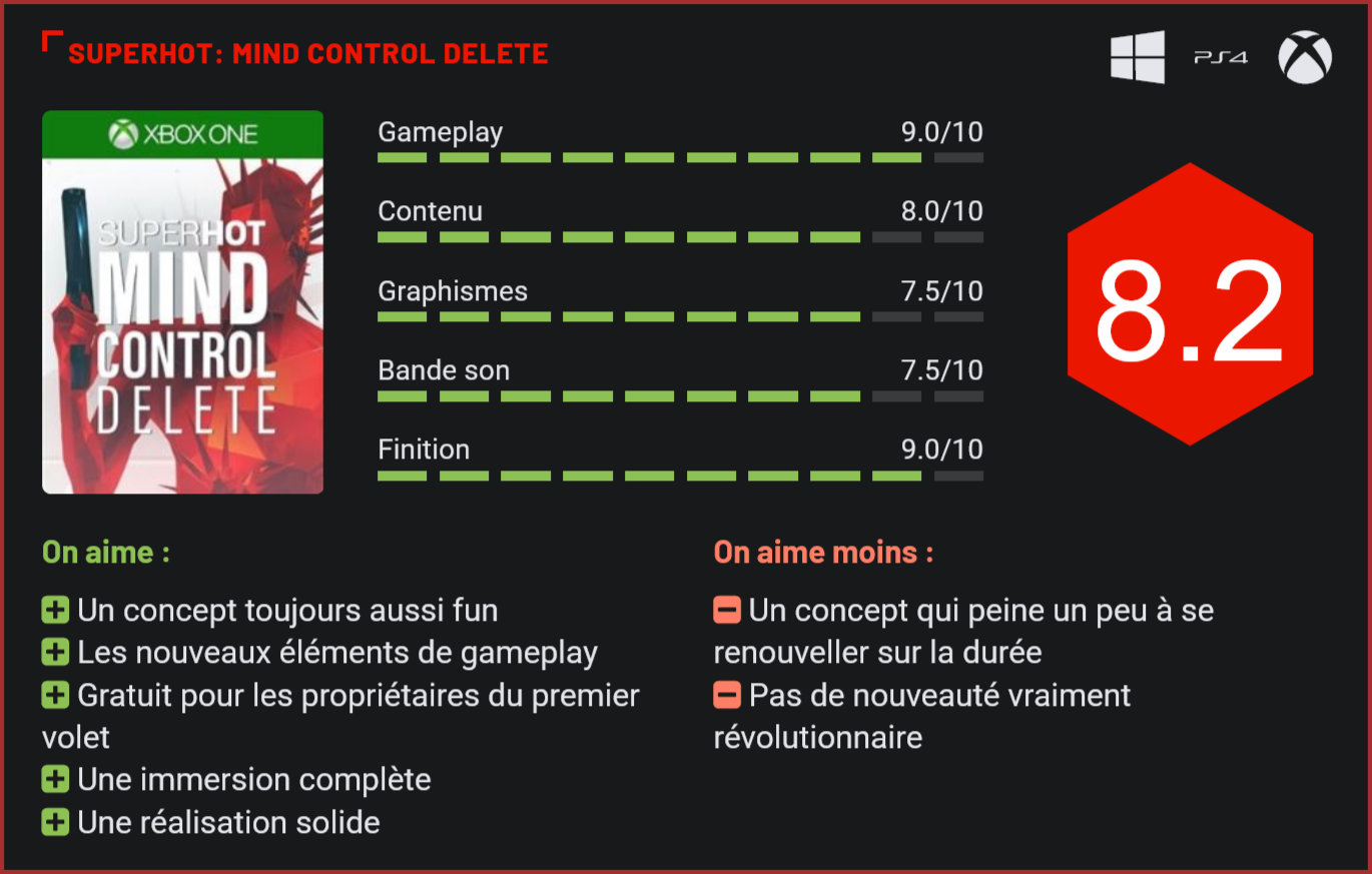 Quatre ans après SUPERHOT, les Polonais de la Superhot Team reviennent avec une suite – généreusement offerte aux propriétaires du premier volet. La démarche est atypique. Au lieu de surfer sur l’incroyable succès du premier volet, les créateurs du premier SUPERHOT ont choisi de rendre la suite de leur jeu gratuite pour tous les propriétaires du premier volet. Un choix surprenant que les développeurs justifient par leur volonté de “remercier” les joueurs pour leur soutien. Le premier épisode se serait ainsi écoulé à plus de deux millions d’exemplaires depuis sa sortie. Des performances impressionnantes qui s’expliquent en grande partie par la sortie d’une déclinaison VR du jeu, qui était parvenue à brillamment exploiter le concept. De nouveaux pouvoirs, armes, ennemis et niveaux sont au programme de cette suite. Les développeurs polonais ont continué dans leur coin leur travail et ont planché sur une suite qui débarque aujourd’hui un peu à l’improviste – le jeu ayant été présenté il y a quelques semaines seulement. Une sortie-surprise qui s’accompagne d’une gratuité complète pour les propriétaires du premier volet. On ne vous pouvait pas rêver mieux! Seconde bonne nouvelle : même si le jeu est gratuit, cela ne vaut pas dire pour autant que les développeurs se sont contentés du minimum syndical. Certes, le concept évolue finalement assez peu, mais les nouveautés sont suffisamment nombreuses pour justifier que l’on se replonge dans l’univers de Superhot. Le shotgun reste l’une des armes les plus efficaces pour faire le ménage. On retrouve donc dans ce Mind Control Delete les mêmes idées que dans le premier volet. Le jeu propose de prendre part à une succession de défis dans des zones fermées au look minimaliste. Les décors sont entièrement blancs, les ennemis s’affichent eux en rouge. Particularité de la série : l’action se déroule au ralenti. Lorsque le joueur ne se déplace pas, ses ennemis progressent à une vitesse excessivement lente, de quoi lui permettre de mieux jauger l’action pour s’emparer d’un objet, lui envoyer à la figure, lui dérober son arme et l’envoyer dans l’au-delà en déchargeant son chargeur. Lorsqu’il tire, se déplace ou s’empare d’un objet, le temps s’accélère. Toute la difficulté vient ici de jauger l’effort et d’éviter d’être pris dans un piège, les ennemis ayant tendance à être nombreux et surtout très bien armés. Mind Control Delete fait légèrement évoluer la recette en ajoutant des vies – symbolisées à l’écran par des cœurs -, qui représentent les seules options de replay pour une série de quelques niveaux. En d’autres termes, l’erreur sera permise, mais uniquement un nombre limité de fois. Différents bonus pourront également être activés, pour obtenir un cœur supplémentaire, remplir les cœurs perdus, commencer le niveau avec un katana, etc… Autre nouveauté majeure de ce volet : l’ajout de nouveaux niveaux, ennemis mais aussi et surtout armes. On retrouve un large panel de nouveaux objets et armes, qui vont du disque de lancer à l’uzi en passant par diverses nouvelles armes futuristes. Une jolie panoplie du parfait meurtrier qui permettra de varier les plaisirs à travers la nouvelle campagne de jeu. Le katana permet toujours de repousser les balles. Alors oui, on pourra d’une certaine façon reprocher aux développeurs de ne pas franchement nous surprendre. Si vous avez bouclé le premier volet, vous n’aurez guère de vraie surprise en parcourant cette suite. Le contenu du jeu, les petites nouveautés et la diversité des séquences de jeu rendent toutefois l’expérience très fun. Mind Control Delete s’inscrit dans la continuité de son ancêtre et joue à fond la carte du Bigger, better, faster. Techniquement, le jeu repose d’ailleurs sur le même moteur de jeu, l’univers reste le même, certains niveaux sont même recyclés. Et puis, bien sûr, on retrouve le même humour caractéristique de la franchise, sur fond d’échange de messages dans la matrice. C’est fun, mais forcément l’effet de surprise n’est plus vraiment là. A ce titre, on comprend mieux pourquoi les développeurs ont opté pour cette formule “gratuite” pour les propriétaires du premier volet, qui auraient potentiellement pu être déçus du manque d’imagination des créateurs de Superhot. L’approche est intelligente, car avec un jeu solo “gratuit”, difficile d’être déçu. Inversément, ceux qui n’avaient jamais touché à Superhot auront toujours droit à l’effet de surprise. Tout le monde y trouve donc d’une certaine façon son compte. Si Mind Control Delete n’est pas une suite transcendante, elle n’en reste pas moins une suite solide, qui reproduit brillamment la formule du premier volet, tout en allant plus loin dans le concept. Si vous étiez passé à côté de cet OVNI, Mind Control Delete vous permettra donc de jouer les séances de rattrapage. Conclusion En plus d’être gratuite – pour les propriétaires du premier volet -, cette suite de Superhot a le mérite de pousser plus loin encore le concept complètement barré du premier épisode en nous proposant cette fois de gérer l’effort sur une série de niveaux tout en découvrant de nouvelles armes, ennemis et environnements. S’il n’apporte finalement que des petites retouches au gameplay de l’original, Mind Control Delete peaufine davantage une recette qui était déjà très efficace. Eliminer des dizaines d’ennemis au ralenti en leur envoyant une brique à la figure n’a jamais été aussi fun. Jouant à fond la carte du “bigger, faster, stronger”, les développeurs polonais nous livre un nouveau shooter intense et terriblement fun, auquel il manque toutefois toujours une composante de scoring. Pas de doute toutefois : Mind Control Delete est l’une des bonnes surprises de cet été 2020!