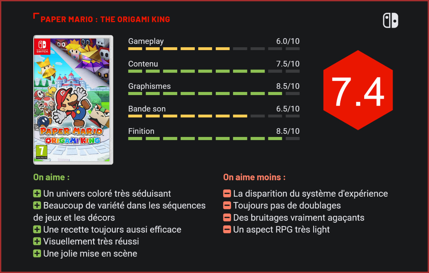 Quatre ans après Paper Mario : Color Splash, Nintendo offre un nouvel épisode à sa série de RPG. The Origami King est le premier opus de la franchise à sortir sur Switch. Et pour cette entrée en la matière, Nintendo a choisi de revoir presqu’intégralement les mécanismes de jeu de sa série. C’est bien connu, on ne change pas une recette qui fonctionne. Nintendo a pourtant choisi de repartir d’une feuille blanche pour ce nouveau Paper Mario, le premier à voir le jour sur Switch – et déjà le sixième de la série. Souvent reléguée au second plan, la série des Paper Mario est née sur Nintendo 64. Les créateurs du jeu se sont très ouvertement inspirés d’une précédente création de Nintendo sortie sur Super NES, le sympathique Super Mario RPG. Exit la plate-forme ici puisque l’on a en réalité affaire à un RPG light. Le monde de Paper Mario est très coloré. Et n’ayons pas peur de le dire d’entrée de jeu : malgré ses couleurs chatoyantes et son accessibilité élargie, Paper Mario : the Origami King ne se destine pas forcément à une audience très jeune. Certains mécanismes de jeu seront difficiles à saisir pour les plus petits et les dialogues sont nombreux. Pour autant, il ne faut pas s’attendre ici à un RPG hardcore. Paper Mario reste un RPG très “light” dans sa formule. Ce nouvel épisode tire même un trait sur certaines caractéristiques de ses ainés. Exit par exemple le système d’XP qui fonctionnait pourtant plutôt bien. Plusieurs mécanismes de jeu ont été fortement simplifiés. En ce compris les combats, qui se déroulent désormais sur une sorte de ring circulaire et intègre certains éléments inspirés des puzzle-games. Car avant d’affronter ses ennemis, le joueur devra les aligner en faisant pivoter les différents cercles qui composent l’aire de jeu. Il n’a que quelques secondes pour procéder. Une certaine tension se faire donc ressentir, dans la mesure où cette phase de jeu qui se déroule avant le combat aura un très gros impact sur l’affrontement. Aligner correctement tous les ennemis sur une seule rangée permet en effet de les éliminer plus rapidement et donc de réduire les chances d’échec. Le concept est sympathique, mais on finit toutefois assez vite par s’en lasser. Passé les 3h de jeu, on regrette même ce choix finalement assez douteux, qui force le joueur à rester vigilant à tout moment. Autre abandon : celui de la structure par niveaux. Le jeu est beaucoup moins linéaire que ses ancêtres. On se retrouve ici face à une sorte de monde-ouvert, qu’on devra toutefois explorer dans un ordre bien structuré. Un peu de modernisation dans le concept, qui se révèle plutôt bénéfique. Un gros travail a été réalisé au niveau de la mise en scène. Pour le reste, on retrouve précisément tout ce qui a fait le succès de la série : des affrontements au tour par tour, de nombreux dialogues, une touche d’humour, quelques jolis combats de boss et voilà! Le mélange de genres fonctionne plutôt bien, mais difficile de ne pas être déçu tout de même par le nouveau système de combats. Paper Mario : the Origami King va trop loin dans la simplification du gameplay et manque cruellement de customisation dans l’expérience de jeu. Le “RPG-light” de Nintendo se montre également tristement répétitif. Par chance, les situations cocasses, les dialogues savoureux et les combats de boss permettent de relever de quelques crans le niveau. A travers ses combats de boss, Nintendo réinvente complètement la recette. On retrouve le même concept de ring circulaire que dans les combats classiques. Il ne toutefois plus faire tourner les anneaux pour positionner son adversaire ici, mais aligner des flèches pour créer un chemin pour Mario jusqu’au centre du ring. Différents power-ups sont au programme et le côté très labyrinthique de ces séquences de jeu ajoute un peu de piquant à l’expérience de jeu. Le challenge est là, et c’est tant mieux tant les combats classiques manquent de piquant. Les séquences de jeu sont assez variées. On retrouve dans Paper Mario une belle diversité de séquences de jeu et de décors, et c’est finalement ce qui fait le charme de cet épisode, très coloré, plus accessible que ses ancêtres mais également peut-être un peu plus fun aussi dans ses à côtés. Chaque monde de Paper Mario parvient à se démarquer avec une atmosphère unique. L’humour fait également partie intégrante de l’expérience puisque les situations loufoques sont nombreuses, les dialogues parfois savoureux et surtout, la chasse aux Toads est l’un des temps forts de cet épisode puisqu’il faudra ici tenter de retrouver tous les Toads cachés dans les niveaux – et croyez-nous, il faudra s’accrocher! Techniquement, Nintendo réalise presqu’un sans faute. L’éditeur nippon prouve qu’il maitrise parfaitement sa console. Visuellement, Paper Mario : the Origami King est une jolie réussite. Les décors sont colorés et très vivants, les animations sont superbes et l’univers est plein de charme. On regrette que la bande son ne soit pas du même niveau. Comme à son habitude, Nintendo n’offre aucun doublage à ses personnages. Il faudra se contenter de ruminements. Sauf que si cette approche était compréhensible dans un Luigi’s Mansion, cela passe forcément beaucoup moins bien ici vu l’abondance de textes à l’écran. Très vite, on finit par s’agacer des bruitages irritants du jeu et par couper tout simplement le son. Dommage, dans la mesure où les musiques sont plutôt sympas. L’immersion en prend forcément un très grand coup. L’humour est toujours de la partie. Côté scénario enfin, il ne faudra pas s’attendre non plus à du grandiose. Le scénario de Paper Mario : the origami King reste globalement très prévisible. Invité à l’Origamifest par la princesse Peach, le joueur se retrouve malgré lui emprisonné. Mario se lancera a