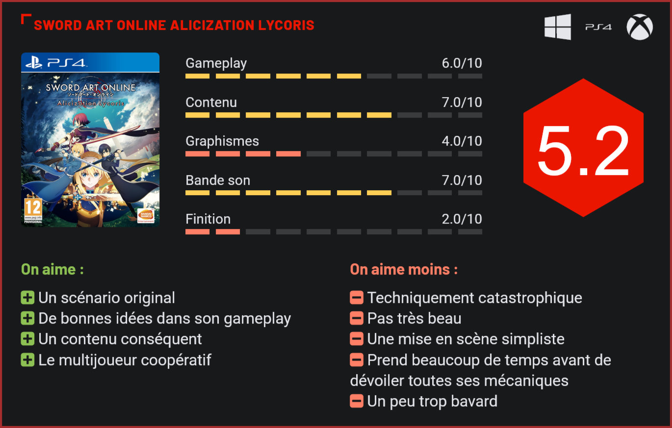 Cela fait maintenant quelques années que les adaptations vidéoludiques de Sword Art Online arrivent en abondances sur consoles et PC. Si les précédents jeux ont eu du mal à convaincre, en est-il de même avec Alicization Lycoris ? Sword Art Online est une série de romans japonais écrit par Reki Kawahara. Si c’est rapidement devenu un succès dans l’archipel, il a fallu attendre son adaptation en animé dès 2012 pour que la série devienne populaire dans le monde entier. Sword Art Online: Alicization Lycoris en est une nouvelle adaptation, un titre signé de nouveau par Aquria et édité par Bandai Namco. C’est le début de l’arc Alicization qui est cette fois décliné en jeu vidéo. Sword Art Online raconte l’histoire de Kirito, un joueur expérimenté de VR-MMORPG. Les arcs scénaristiques du roman se déroulent dans différents mondes de jeux vidéo en réalité virtuelle, c’est également le cas du scénario de Alicization Lycoris. Le jeu débute alors que Kirito se réveille dans un monde virtuel qu’il ne connaît pas, et il ne semble pas pouvoir accéder à un menu ou à une interface pour se déconnecter. Il va rapidement rencontrer Eugeo, un personnage non-joueur avec qui il va se lier d’amitié. Ils vont tous deux partir à la recherche d’Alice, une amie d’enfance de Eugeo enlevée il y a plusieurs années dont Kirito semble mystérieusement se souvenir. Durant une bonne partie du jeu, le scénario suit l’histoire originale de l’arc Alicization mais y ajoute quelques nouveaux personnages et nouvelles intrigues. Ce n’est qu’à un stade avancé que le jeu va totalement se détacher du scénario du roman pour proposer quelque chose de nouveau. Cette première partie a le mérite de bien résumer les événements du début de l’arc, même si elle se montre parfois un peu pressée en passant de nombreux évènements. Sans pour autant être brillant, le scénario reste sympathique à suivre même si le jeu se montre trop bavard à certains moments. Le scénario prend une place importante du jeu. Alicization Lycoris est un Action-RPG aux possibilités plutôt classiques. Le gameplay se déroule en temps réel dans des environnements ouverts. Ceux-ci seront remplis d’ennemis à battre pour gagner de l’expérience et des objets. Pour s’en sortir face aux créatures les plus résistantes, il sera nécessaire de maîtriser les nombreuses capacités et effets passifs (déblocables grâce à des arbres de compétences) ainsi que la garde et les esquives. Le jeu vous demandera cependant de bien gérer la coordination avec vos équipiers pour être le plus efficace possible. Vous pourrez avoir un maximum de quatre personnages en combat, avec la possibilité de contrôler celui de votre choix quand bon vous semble. Si les combats offrent de bons moments défouloirs, les sensations manette en main sont pourtant loin d’être irréprochables. La maniabilité s’avère rigide et les combats généralement assez lents. Ce qui est dommage puisque certains combos sont très plaisant à effectuer. Les combats brillent plutôt lors des duels contre d’autres personnages. Des combats un-contre-un où les attaques adverses sont plus lisibles et où le timing des esquives et des parades prennent bien plus d’importance. L’aspect ouvert des décors aurait pu amener un côté “exploration” agréable si le jeu n’était pas remplis de problèmes techniques. On passera sur les petits soucis pas très dérangeants comme la caméra un peu capricieuse ou encore le manque de collision de certains objets du décors ou de certains personnages non-joueurs. Mais par contre, impossible de passer à côté du clipping et du framerate du jeu qui chute très souvent sur PS4, dans les villes, dans les environnements ouverts et même en plein combat. Alors même que la qualité graphique du jeu est loin d’être impressionnante. Tout ça est aggravé par les temps de chargement horriblement longs qui surviennent assez souvent. Alicization Lycoris est techniquement très en retard. Il est visuellement peu impressionnant et sa direction artistique un peu terne n’aide pas à donner du charme à l’ensemble. La mise en scène est également assez pauvre. Si les scènes pré-calculées sont très belles, et qu’on a parfois droit à de jolies illustrations, la majorité des dialogues du jeu alternent sans trop de raisons entre des cinématiques in-game très statiques et des moments “visual novel” avec boîtes de dialogue et illustrations 2D des personnages. On peut sentir le petit budget alloué à un jeu peut-être un peu trop ambitieux pour son propre bien. Le gameplay est gâché par une technique qui laisse à désirer. C’est dans son contenu que le jeu est le plus généreux. Il faudra compter quelques dizaines d’heures pour en venir à bout et plus encore pour le finir à 100%. L’aventure est très longue, il y a également de nombreuses quêtes annexes et des DLC sont déjà prévus. Alicization Lycoris propose un mode multijoueur en coopération assez complet, vous permettant de parcourir le jeu avec vos amis. De nombreux personnages sont jouables, dont la majorité du casting habituel de Sword Art Online. Le jeu n’est pas avare en fan service et c’est peut-être son attrait principal. Les nouveaux arrivants seront sans doute un peu perdu puisque le jeu ne juge pas nécessaire de réintroduire les personnages et concepts récurrents de la série. Mais les habitués retrouveront des idées déjà utilisées dans les précédents jeux, comme le système de romance. Le jeu à la bonne idée de donner un peu plus de temps d’écran à certains personnages secondaires, de quoi caresser le fan dans le sens du poil. Malheureusement, Alicization Lycoris souffre de beaucoup trop de problèmes techniques pour que nous puissions le recommander. Beaucoup d’aspects du jeu sont sympathiques, comme ses musiques qui accompagnent bien l’action. Mais rien n