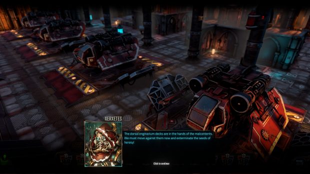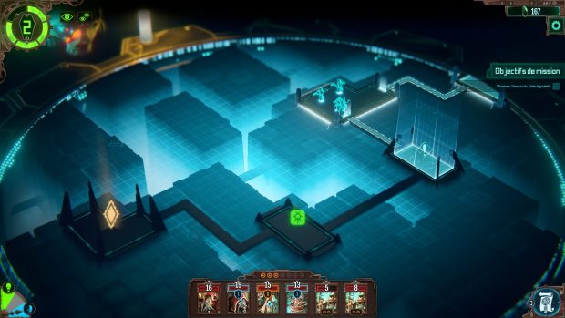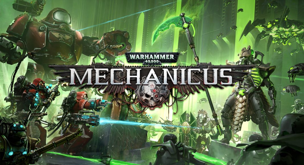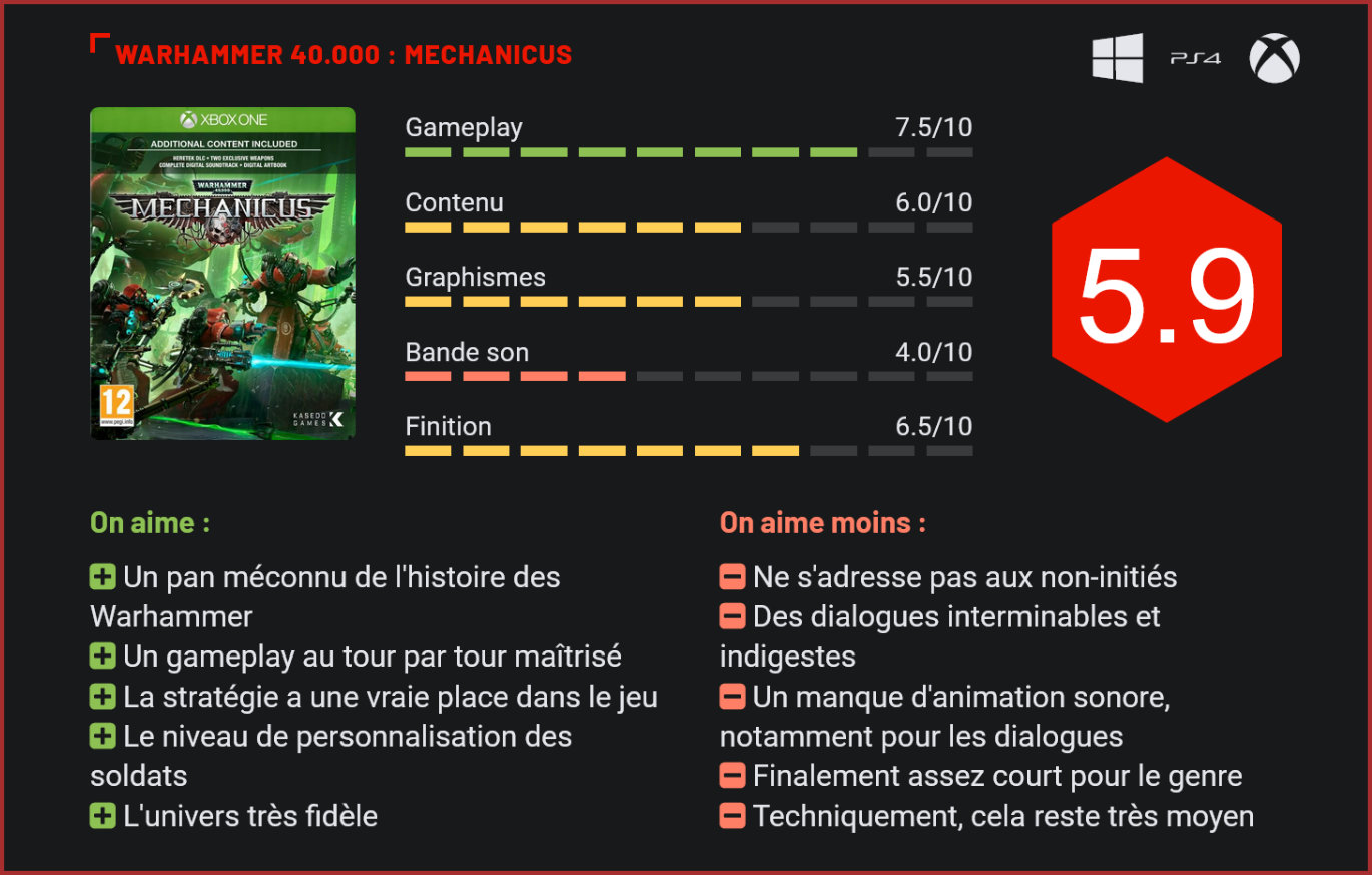 Après une sortie sur PC en 2018, Warhammer 40.000 : Mechanicus débarque sur consoles de salon. L’occasion de se pencher sur cette énième adaptation de l’univers des Warhammer en jeux vidéo. Mechanicus est-il l’adaptation tant attendue des fans ? Le scénario peu accessible pour les non-initiés se dévoile à travers des dialogues interminables. Cela manque clairement de vie. Warhammer 40.000 : Mechanicus nous fait incarner une troupe de Tech-Priest, disciples du Dieu-Machine, qui n’ont plus vraiment rien d’humain tant les implants de métal ont pris le dessus, leur apportant de nombreuses améliorations. Ils atterrissent sur la planète Silva Tenebris, pour enquêter sur ce qui semble être un ancien tombeau Nécron où les forces ennemies semblent être en train de se réveiller. Difficile de ne pas trouver à redire au scénario du jeu et à la manière dont il se développe. De toute évidence et dès les premières lignes, on se rend bien compte que le jeu ne s’adresse qu’aux adeptes de la licence des Warhammer. Même si les développeurs du studio français Bulwark Studio prennent la peine de dresser en quelques lignes le contexte de l’aventure, sans aucune ambiance musicale, les joueurs qui n’auront aucune connaissance de l’univers seront totalement perdus face à des termes plus complexes les uns que les autres. La construction de l’univers y est également très complexe, il faudra s’armer de patience pour tenter d’assimiler toutes les informations et découvrir peu à peu dans quel pétrin nos Tech-Prêtes se sont mis. On le sait – enfin certains le savent – la licence de Warhammer fait partie d’un univers particulièrement riche initié dans les Games Workshop. Bien que nous ayons poussé plusieurs fois la porte de l’une de ces boutiques, nous avons été complètement perdus en lisant les très nombreux dialogues de Warhammer 40.000 : Mechanicus. Le jeu s’intéresse tout particulièrement à un pan de l’histoire des Warhammer plutôt méconnue, l’Adeptus Mechanicus. Si ce choix a le mérite de développer des personnages et des aventures peu exploités de la licence, l’immersion dans cet univers n’en sera pas moins complexe pour les non-initiés. Quant aux adeptes, il faudra malgré tout être bien accroché pour digérer les dizaines de lignes de dialogues toutes plus indigestes les unes que les autres, mais on y reviendra. En plus de développer un pan d’histoire méconnue de l’univers des Warhammer, le studio français a opté pour un gameplay fidèle aux origines de la licence et donc, du jeu de plateau. Nouvelle preuve que Warhammer 40.000 : Mechanicus s’adresse tout particulièrement aux fans de la première heure de cet univers si particulier. On se retrouve donc face à un jeu de stratégie au tour par tour. Que ça soit dans les phases de combats ou d’exploration, la progression y sera saccadée. Il faudra en effet choisir les salles dans lesquelles le joueur voudra s’aventurer avec plus ou moins de chance de tomber sur des ennemis, à la manière des parties sur plateau. Une construction qui ne permettra pas de proposer une aventure dynamique et vivante. Si les joueurs n’ont pas la « chance » de tomber sur des ennemis, ils pourront toujours faire face à des choix. Le jeu intègre en effet un système de hasard et de conséquence. Lors de son exploration, le joueur tombera sur divers objets et situations qui le pousseront à faire des choix (analyser un objet, le détruire pour ne prendre aucun risque, le sécuriser, etc.). Il pourra également choisir la manière dont il appréhende son exploration. La manière prudente fera en sorte que ses soldats seront plus lents à charger des attaques puissantes, le choix de la cohérence ou de la croisade, dans ce cas, les attaques seront puissantes, mais les Tech-Priest seront plus facilement surpris. Or, qui dit choix, dit conséquence. Il faudra faire en sorte de bien choisir au risque de voir son aventure contaminée par les décisions prises ultérieurement. Explorer davantage les niveaux permettra d’en apprendre plus sur les Nécrons ou de récupérer des ressources très utiles durant les combats, mais cela pourra également nous mettre dans de sales postures et compliquer notre mission initiale. Un concept plutôt intéressant qui ajoute une sphère supplémentaire au jeu et qui rappelle également le hasard des jeux de plateau et les changements d’humeur du maître du jeu. Aux joueurs de savoir ce qu’ils veulent vraiment. La stratégie aura un rôle important dans cette aventure et la manière dont le joueur arpentera la planète rallongera ou non la durée de vie du jeu qui demandera une quinzaine d’heures pour être conclu. Les joueurs devront prendre en compte de nombreux éléments lors des combats ; disposition du terrain, obélisque de bonus, obstacles et ennemis. Pour ce qui est des phases de combat, Warhammer 40.000 : Mechanicus repose donc sur un système au tour par tour. Le joueur devra prendre en compte ses ennemis, la distance qui les sépare, mais aussi ses “points de cognition”, à savoir ses points d’action. À l’image du scénario, les phases de combat ne seront pas forcément accessibles pour tout le monde. Des connaissances de base de mécaniques du jeu et de la licence seront un plus, et ce, même si le jeu propose un tutoriel. Les combats se dérouleront en plusieurs phases. La première consistera à déployer ses forces sur les cases accessibles (en avant, en arrière, en oblique). La seconde repose sur les actions. Vous pourrez vous déplacer de nouveau ou attaquer une cible en fonction des points de cognitions qu’il vous reste. Vous pourrez également tenter de récupérer des points de cognitions via des obélisques, en tuant un ennemi ou lorsque l’un de nos serviteurs aura subi des dégâts. Vous devrez donc faire appel à toute votre stratégie lors de cette phase. Enfin, quand il sera effectivement temps d