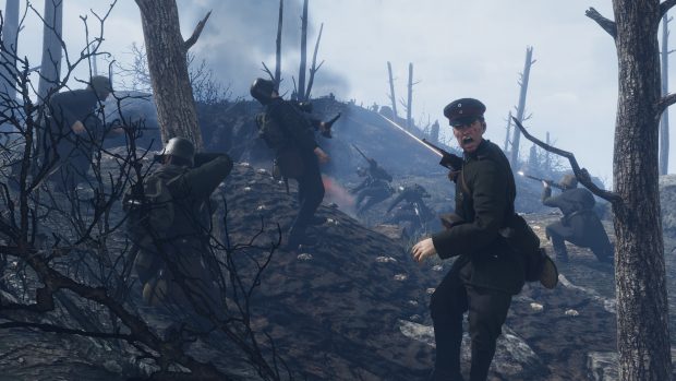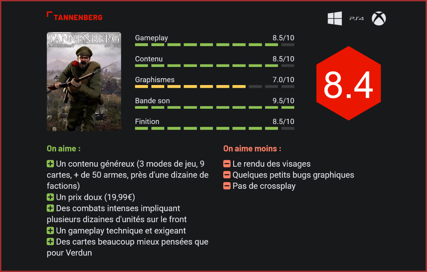 Après Verdun, les développeurs du studio néerlandais M2H reviennent à la charge avec un second jeu sur la thématique de la Première Guerre mondiale. Avec Tannenberg, le conflit s’ouvre au front Est. Séduisant sur le papier, Verdun avait toutefois eu du mal à convaincre tous les joueurs. Le jeu du studio néerlandais M2H prônait le réalisme dans son gameplay, avec un level-design très particulier puisque les niveaux plongeaient les joueurs au beau milieu des tranchées. Le mode de jeu principal consistait à l’époque à faire avancer une ligne de front pour obtenir des points qui permettait à sa faction de remporter la partie à l’issue du décompte. Immersif, le jeu manquait toutefois cruellement de profondeur sur la durée et souffrait de son level-design très pauvre. Tannenberg repose sur le même moteur graphique que Verdun. Le jeu de M2H recycle abondamment une partie de son contenu : des menus à la prise en main. Les bases sont donc les mêmes que celles de Verdun, mais le gameplay a toutefois radicalement évolué car le jeu s’intéresse ici au front Est, qui confrontait les forces de l’Allemagne et de l’Empire austro-hongrois aux puissances slaves (Lettons, Russes, Roumains, Bulgares,…) Le cadre a donc radicalement changé puisqu’on troque ici les tranchées boueuses pour de vastes espaces naturels. Les combats sur la ligne de front sont très intenses. Au total, ce sont ainsi pas moins de 9 cartes qui attendent les joueurs. Et, bonne surprise, on retrouve cette fois une très belle diversité dans le level-design, des villages polonais recouverts par une fine couche de neige aux montagnes de Transylvanie en passant par les forêts de la Prusse. Le cadre est verdoyant, souvent paisible. Les décors naturels paraissent également beaucoup plus jolis que dans Verdun. Le moteur graphique du jeu reste pourtant le même. On le sent, les développeurs de M2H ont appris de leurs erreurs. Si Verdun proposait une expérience fidèle et immersive, Tannenberg se présente comme un FPS multijoueurs beaucoup plus fun et intense. Tout cela, en grande partie, grâce à son level-design beaucoup plus soigné. Les niveaux sont vastes et recèlent de points stratégiques et de forteresses à capturer. Le mode de jeu principal a également changé. Il n’est plus question ici de faire progresser une ligne de front mais de s’emparer de différents points d’intérêt sur une carte. Dès qu’une faction prend l’ascendant sur sa rivale, celle-ci voit son compteur de points diminuer. La première des deux factions à atteindre zéro perd la partie. Une recette qui rappelle bien sûr celle des premiers Battlefield, et qui fonctionne d’ailleurs plutôt bien. De jolis paysages enneigés sont au programme. Avec ses vastes environnements ouverts, Tannenberg se révèle également beaucoup plus stratégique que Verdun, puisqu’il est possible ici de mettre en place de véritables stratégies pour renverser son adversaire. Plusieurs escouades pourront en effet prendre à revers l’ennemi, organiser des embuscades ou attaquer plusieurs points simultanément. Le potentiel ludique est énorme et le jeu offre d’ailleurs une excellente rejouabilité avec ses 7 factions, 9 cartes, sa cinquantaine d’armes différentes, ses escouades à faire évoluer avec l’expérience acquise et ses compétences à débloquer… S’il perd un peu de son originalité en quittant les tranchées, se rapprochant un peu plus d’un Battlefield au niveau de son gameplay, Tannenberg reste toutefois un FPS très technique. Une balle suffit à vous mettre au sol. Lorsqu’il meurt, le joueur réapparaît avec son escouade de 3 soldats (contrôlés par des amis ou par des bots), dans l’un des points d’intérêt contrôlés par sa faction. Les affrontements sont souvent très intenses et brutaux. Mettant en scène jusqu’à plusieurs dizaines de personnages simultanément, ils sont le théâtre d’affrontements sanglants d’une grande intensité, chaque centimètre gagné se payant par plusieurs litres de sang. Par rapport à Verdun, Tannenberg laisse d’ailleurs davantage de place aussi aux actes héroïques. Un joueur qui est parvenu à passer derrière les lignes ennemies parviendra occasionnellement à le déséquilibrer en s’emparant d’un arrière-poste déserté. Certains paysages sont ravagés par la guerre. Jouer en équipe est primordial pour remporter la partie. A défaut d’autres joueurs, le joueur pourra toutefois se reposer sur l’efficacité des bots, pas forcément très malins stratégiquement mais suffisamment efficaces pour tenir tête aux joueurs dans les affrontements. On notera au passage que Tannenberg est loin d’être un simple simulateur de bidasse. Le jeu se révèle plus technique qu’on pourrait l’imaginer puisque le joueur peut changer d’armement (plus de 50 armes sont proposées dans le jeu !), faire évoluer son escouade au fil des parties en débloquant de nouvelles compétences, utiliser divers accessoires durant les batailles, des jumelles à la baïonnette ou le sabre pour les combats rapprochés, en passant par les grenades. Il pourra également demander des tirs de mortier en soutien ou prendre le contrôle de mitrailleuses fixes sur le champ de bataille. La charge frontale n’est pas non plus toujours la plus efficace sur le champ de bataille puisqu’il faudra utiliser à son avantage le terrain comme couverture et ne pas hésiter à changer de position en s’accroupissant ou se couchant au sol dans les fourrés. Certaines batailles se joueront également de nuit. D’une grande fidélité à l’Histoire, Tannenberg nous propose de revivre certaines des plus grandes batailles de la Première Guerre mondiale. Les développeurs ont accordé un soin tout particulier à l’authenticité du jeu : les costumes, armes et décors du jeu sont tous reproduits avec une extrême fidélité aux documents historiques. Et c’est sans doute ce qui
