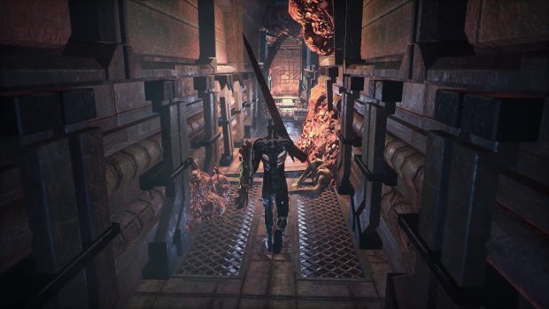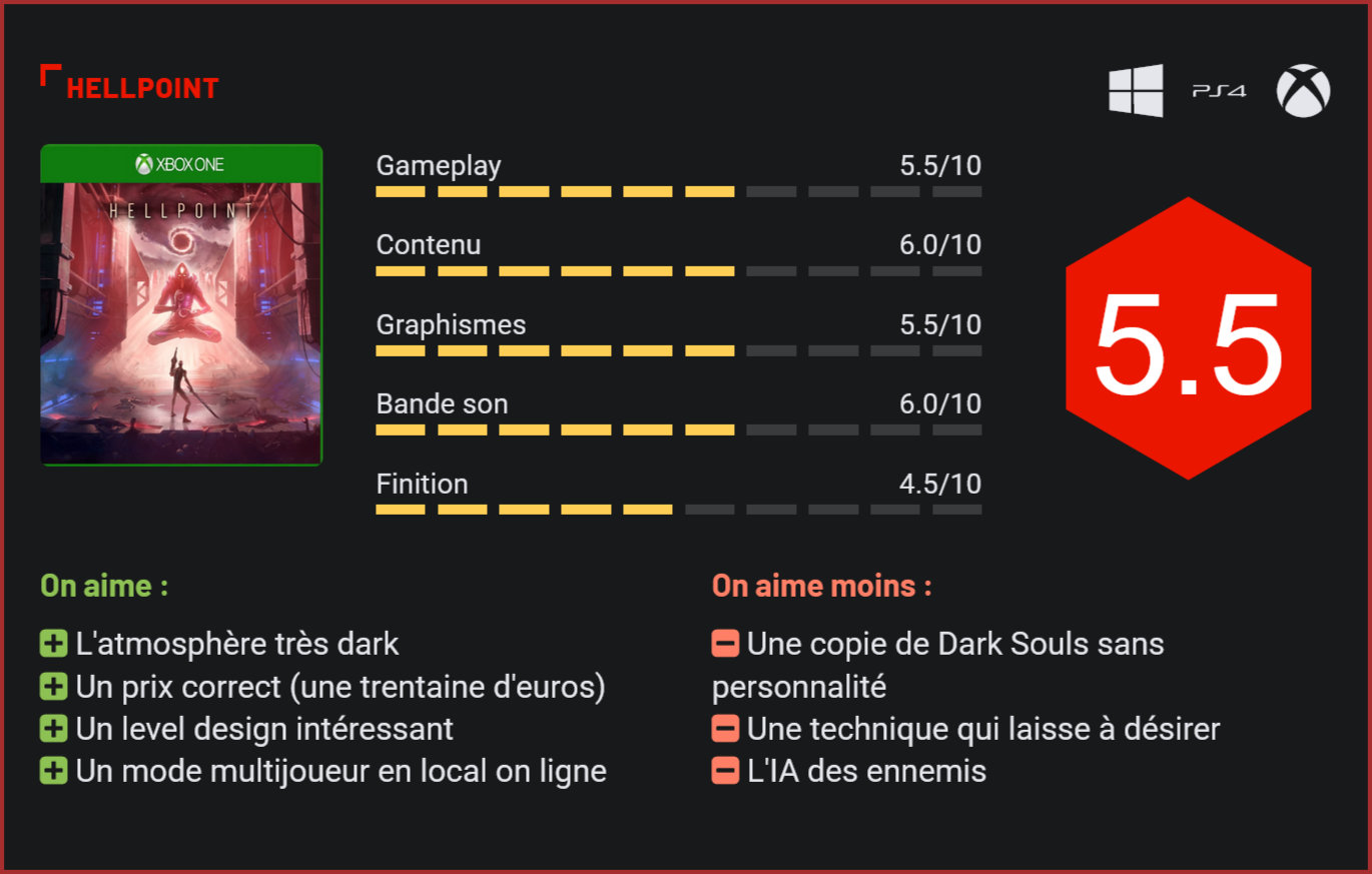 Financé grâce à une campagne sur Kickstater, Hellpoint débarque enfin sur toutes les plateformes gaming. Ce titre de science-fiction reprenant des codes de souls-like arrive-t-il à tirer son épingle du jeu ou s’agit-il d’une énième copie de Dark Souls ? Le moins que l’on puisse dire est que Hellpoint joue la carte du mystère. Sans trop d’introduction, on y incarne un Spawn, un humanoïde sans nom créé par une machine dans un but précis que le joueur devra découvrir au fur et à mesure de sa progression. Alors qu’une immense bataille a eu lieu dans l’espace, notre héros se matérialise bien après la guerre, dans la station spatiale “abandonnée” Irid Novo. Cette dernière se trouve à proximité d’un immense et terrifiant trou noir dont les « pouvoirs » auront un impact sur l’aventure de notre cher Spawn, mais on y reviendra. Et si la station spéciale semble abandonnée, ce n’est pas vraiment le cas. Elle est en réalité peuplée de monstres plus agressifs et plus effrayants les uns que les autres. Le joueur devra progresser au sein d’Irid Novo en repoussant les ennemis afin d’accomplir la mission que lui a donnée le Créateur et tenter de découvrir ce qu’il s’est passé sur la station spatiale. Et pour cela, il devra récupérer des messages disséminés un peu partout sur le vaisseau et qui peuvent donc être manqués. Le développement du scénario sera en quelque sorte influencé par la progression du joueur. L’ambiance sur Irid Novo est particulièrement anxiogène. Les parois de métal, les portes fermées, les couloirs sans issues, les accès cachés et les monstres qui pullulent un peu partout dans la station spatiale créent une atmosphère très particulière, à la croisée de celle de Dead Space et d’un Warhammer 40.000. Et c’est plaisant. Quant au scénario, le mystère est entier et donne envie d’en savoir plus. Le joueur devra explorer la station spatiale Irid Novod pour comprendre ce qu’il s’y est passé. Le jeu ne s’en cache pas, il reprend largement le fonctionnement de Dark Souls, mais innove tout de même sur certains points. Ainsi, le joueur devra prendre en compte sa barre d’énergie lors des combats pour éviter de se retrouver sans aucune ressource et donc dans l’incapacité de contrer l’attaque d’un ennemi avec son bouclier. Cette barre détermine la quantité d’actions que pourra effectuer notre héros et exigera quelques secondes d’attente pour se recharger. Cela aura évidemment un impact sur les combats, comme nous l’avons dit, mais aussi sur la manière d’appréhender ces derniers. On évitera ainsi d’affronter les ennemis en groupe et on privilégiera l’esquive voire la fuite à certains moments. La difficulté tient une place importante dans le jeu puisque les monstres particulièrement laids frapperont fort. Les morts seront nombreuses et vous devrez retourner sur les lieux de votre massacre pour récupérer vos points d’expérience – attention à votre double maléfique qui peut vous y attendre… Et évidemment, à chaque mort, les ennemis réapparaitront et vous devrez retraverser le vaisseau depuis le dernier lieu de sauvegarde, une sorte de faille de la réalité. Une logique plutôt classique, mais le joueur pourra mettre un aspect du scénario à son avantage. La proximité de la station spatiale avec le trou noir aura en effet un impact sur la puissance des ennemis, même si cela pourra également les faire réapparaitre… La tension est palpable durant toute la progression. L’idée est vraiment intéressante et forcera les joueurs à prendre en compte la position à laquelle se trouve la station par rapport au trou noir pour progresser. Cela est indiqué à tout moment par une sorte de carte, en haut à gauche de l’écran. Les ennemis frappent fort, mais ne sont pas insurmontables. Plus vous utiliserez une arme pour massacrer vos ennemis, plus vous la maîtriserez et vous pourrez ainsi débloquer des compétences. C’est un choix intéressant qu’a fait le studio et cela offre une sphère supplémentaire à la personnalisation de son personnage. Le côté RPG du jeu reste tout de même très classique, bien que complet. Il sera ainsi possible d’augmenter les statistiques de notre héros anonyme, de lui faire enfiler des pièces d’équipement et des armes, mais aussi de débloquer des compétences. On reste malgré tout devant quelque chose de vu et revu. Les combats s’enchaînent sans grande surprise et, une fois qu’on a compris les mécaniques, on se débarrasse assez facilement des ennemis qui se dressent sur notre chemin, la faute à une IA très limitée tout de même… La plupart des ennemis ne remarqueront votre présence qu’au dernier moment. Et si les mini-boss et boss sont plus résistants et plus puissants, un savant jeu d’esquive, d’attaque et de patience permet de s’en sortir. Il est finalement relativement facile de contourner la difficulté du jeu… De par sa nature, Hellpoint s’adresse aux amateurs purs et durs des souls-like qui ne rechignent pas à jouer à une énième copie de Dark Souls. Le jeu offre tout de même une jolie durée de vie (+/- 25 heures) pour un prix tout à fait correct d’une trentaine d’euros. Il ne faut toutefois pas s’attendre à quelque chose de très original ni de grandiose. De plus, Hellpoint propose un mode multijoueur en ligne ou en local qui permet d’appréhender l’expérience différemment. Ce mode offre une autre expérience et c’est véritablement plaisant, même si le fait que la mort du joueur hôte sera synonyme de game over pour les deux. La direction artistique du jeu est top, même si elle souffre de lacunes au niveau des graphismes. La direction artistique est particulièrement jolie et devrait séduire les amateurs de science-fiction dark. Les décors se renouvellent assez bien à mesure que l’on progresse sur Irid Novod, même si l’on reste tout de même dans 