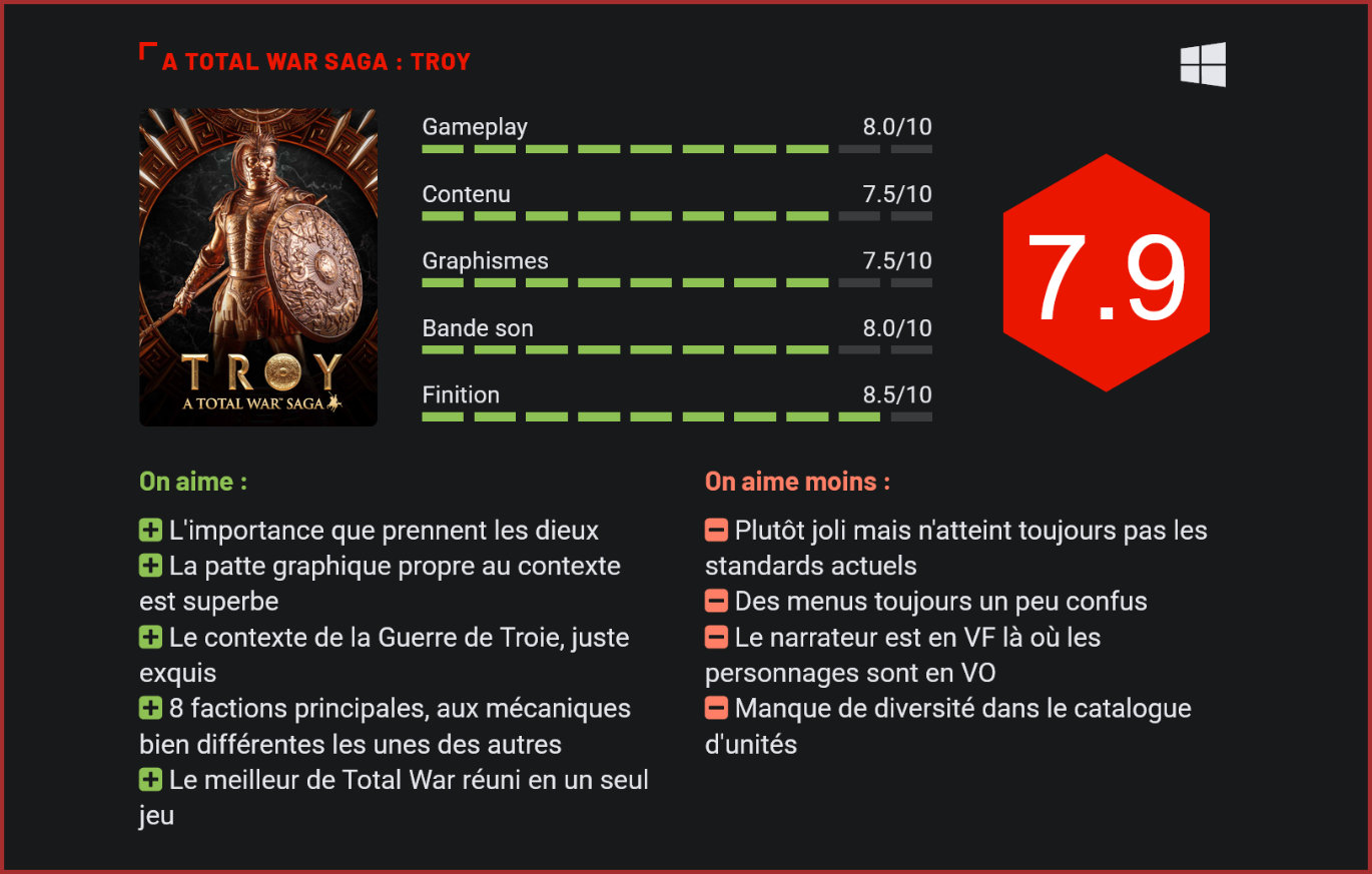 Centrées sur des périodes charnières de l’histoire, les Total War Saga dérivent cette fois de cette véracité historique pour s’attaquer à un mythe. Exit la sombre période de l’invasion viking avec Thrones of Britannia et direction les falaises ensoleillées de la Grèce et la mythique ville de Troie. La sortie d’un nouvel épisode de Total War est toujours un événement en soi. La franchise, qui fête cette année ses vingt ans d’existence, a su se forger une véritable identité et continue d’offrir de fantastiques batailles aux joueurs. Les épisodes sortis ont bon être nombreux, ils ont toujours provoqué un réel enthousiasme, autant de la part de la presse que du public. Néanmoins, une certaine suffisance a souvent été reprochée ces dernières années au studio, qui a trop souvent tendance à se reposer sur ses acquis. Ce nouvel épisode devrait néanmoins rebattre les cartes. Initiées il y a deux ans avec Thrones of Britannia, les Total War Saga plongent le joueur dans des périodes charnières de l’histoire. Après avoir envoyé le joueur sauver l’honneur de la couronne britannique face aux vikings, il est désormais temps de raser la somptueuse ville de Troie. Une chose est certaine : vivre l’Iliade sera un réel plaisir et plus compliqué qu’il n’y paraît … On ne présente plus la Guerre de Troie et les causes qui ont mené à ce terrible conflit. L’enlèvement d’Hélène par Pâris fut considéré comme un affront par Ménélas, époux de celle-ci. Après avoir rallié tous les peuples grecs à sa cause, il parti en direction des côtes turques dans l’unique but de sauver son honneur en attaquant Troie. Célèbre pour ses fortifications réputées infranchissables, la légendaire cité finit par sombrer. La raison ? Un énorme cheval de bois, au sein duquel sont cachées les troupes grecques, passe les portes du palais. Le Cheval de Troie aura sonné la fin de la ville et de ses nombreux héros. C’est ce fantastique contexte qui est offert au joueur, avec une superbe mise en scène. Avec 8 factions représentées par leur dirigeant, Total War Saga Troy promet de nombreuses heures de jeu. Comme toujours, un choix de faction est offert en début de partie. L’accent est mis sur les héros contés par Homère et non plus sur la nation. Des héros qui survivront bon grès mal grès aux batailles, même lorsque les pertes sont totales. Au nombre de quatre de chaque côté, le total de faction à contrôler se porte à huit. Chacune possède ses propres atouts, unités et missions spécifiques et l’envie de connaître les spécificités de chacun des héros fait vite monter le nombre d’heures de jeu qu’a à offrir le titre. Evidemment, l’ensemble des héros principaux d’Homère sont présents. Ulysse contrôle sa petite cité d’Ithaque, tandis que Priam est le dirigeant de Troie. Avoir le contrôle sur certains des plus grands combattants de la mythologie grecque est un réel plaisir. Sur le champ de bataille, l’importance de ces héros reste toujours aussi grande. Si leur déroute mettra à mal la motivation de l’ensemble des unités, leur principal intérêt réside dans ces duels épiques qu’offrent deux héros. Mais nous reviendrons sur ce point plus loin dans ce test. Une fois la partie lancée, une chose attire immédiatement notre attention : la présence de nouvelles ressources. Là où l’or avait autrefois une importance primordiale dans la gestion de sa civilisation et de ses unités, il est désormais utile pour tout un tas d’actions spécifiques. Vous devrez ainsi composer avec cinq ressources différentes : la nourriture, le cuivre, la pierre, le bois et donc l’or. Les deux premières servent au recrutement et à l’entretien d’unités tandis que le bois et la pierre servent aux bâtiments. La gestion de ces ressources est primordiale. En effet, une mauvaise gestion reviendrait à risquer la stabilité et l’ordre de votre nation. Il est important en revanche de savoir une chose : vous manquerez d’office d’une ressource, à moins de posséder un immense empire. Chaque cité possède une spécialisation, et le début de partie se retrouve vite compliqué lorsqu’on n’est maître que de quelques sujets. C’est d’ailleurs sur ce principe que le commerce prend une toute autre importance. Maintenez de très bonnes relations avec les nations voisines et les échanges se feront sans problèmes. Gérez correctement vos ressources et vous triompherez. Une mauvaise gestion et vous courrez à votre perte. Une diplomatie qui prend, comme dans les précédents épisodes, énormément de place. La Guerre de Troie s’est beaucoup jouée sur les différentes alliances qu’a établies Ménélas, ce qu’ont très bien compris les développeurs. Il est même possible de déformer l’histoire originale, avec pourquoi pas une alliance entre le roi de Sparte et son rival troyen. Néanmoins, vos objectifs vous rattraperont toujours. Deux types de victoire finale sont proposés : la victoire homérique, qui suit le récit original, et la victoire Total War, qui demande un contrôle total sur un grand nombre de provinces de la carte. Les possibilités sont nombreuses et promettent ici aussi de très belles parties variées. On notera également l’arrivée tant attendue du contrôle du temps entre les tours. Lorsque le joueur avait affaire à de nombreuses nations contrôlées par l’IA, le temps d’attente entre les tours pouvait vite être longs, voire très longs. Nos cris de désespoir ont enfin été entendus par les développeurs qui ont ajouté un système de contrôle du temps. Il est désormais possible, lorsque l’IA joue, d’accélérer ou de mettre le temps en pause. En plus d’être très attendue par les fans, la nouveauté aura de quoi accélérer des parties qui peuvent parfois s’éterniser. Autre grosse nouveauté : la mythologie et l’influence des dieux. Thrones of Britannia mon