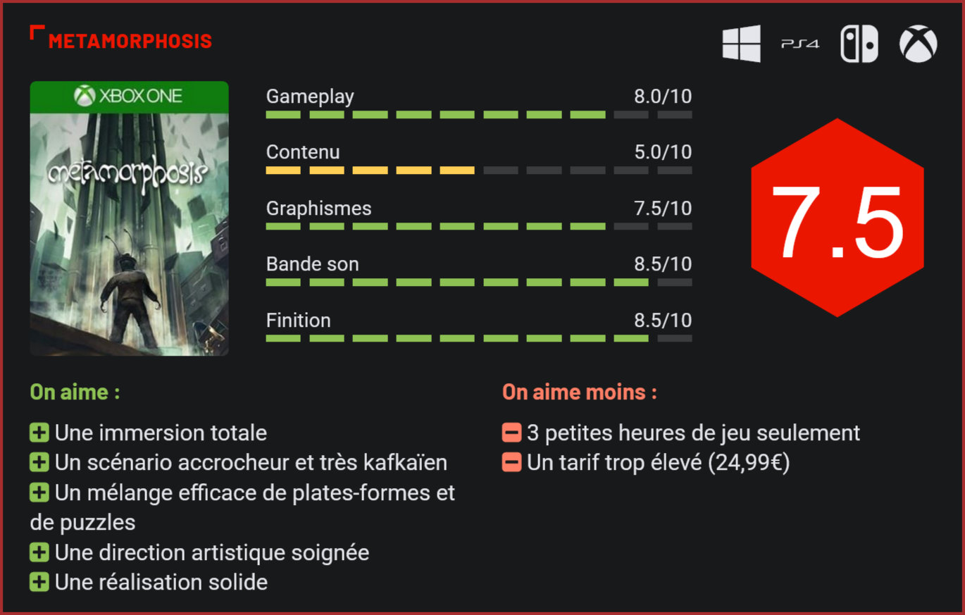 Spécialisé dans la VR, le petit studio Ovid Works tente de signer son premier jeu multiplates-formes avec Metamorphosis, un curieux mélange de jeux de plates-formes et d’énigmes, qui s’inspire assez ouvertement de l’oeuvre de l’auteur tchèque Franz Kafka. Dans la peau de Gregor, un humain qui s’est transformé en cafard, le joueur se retrouve au coeur d’une étrange machination. Dans le monde de l’infiniment petit, il devra tenter de découvrir comment sa métamorphose est liée à l’internement de l’un de ses amis et à une curieuse société secrète nommée “La Tour”. Le monde de l’infiniment petit exerce un certain charme… Si son scénario reste très simple, les dialogues auxquels on assiste et les réflexions intérieures de Gregor sont très bien écrits et donnent une réelle substance au récit. Malgré les apparences, Metamorphosis ose aller très loin dans la critique de la société, s’inspirant assez ouvertement de l’œuvre de Kafka en ciblant particulièrement la condition humaine. Des thématiques rarement abordées dans le jeu vidéo. Les développeurs d’Ovid Works ont à ce titre réalisé un très gros travail d’immersion. Metamorphosis se joue entièrement à la première personne. Pas de séquences musclées toutefois dans ce jeu, qui mélange brillamment plates-formes et énigmes. Pour progresser dans l’aventure, il faudra se frayer un passage entre chandeliers, somnifères, vaisselle et mégots de cigarette. Malgré les apparences, Metamorphosis n’est pas un simple walking simulator. Les développeurs ont travaillé dur et cela se voit dans le level-design, très ingénieux, qui poussera le joueur à explorer différents scénarios pour progresser. Le jeu d’Ovid Works reprend ainsi des éléments de parkour, joue avec la physique des objets et oblige le joueur à mettre à contribution certaines des capacités de notre cher cafard, en graissant par exemple ses pattes pour pouvoir grimper aux murs ou aux objets verticaux (avec bien sûr une limite d’utilisation). Le joueur fera de nombreux allers-retours entre le monde de l’infiniment grand et de l’infiniment petit. Malgré sa simplicité, Metamorphosis brille au niveau de son level-design et de son gameplay, qui mélange brillamment plates-formes et puzzles. Ceux-ci, s’ils sont finalement peu nombreux, ont le mérite d’être assez imaginatifs et de se reposer en général sur la maîtrise de la physique du jeu. On retrouve dans ce titre beaucoup de créativité et cela fait du bien car Metamorphosis se présente comme une véritable bouffée d’air frais. Un très gros travail a également été réalisé au niveau de l’immersion, que ce soit avec cette vue au raz du sol, qui nous donne réellement l’impression d’être un cafard, ou la vie qui règne partout dans l’univers de Metamorphosis. Car vous ne serez pas le seul insecte dans ce jeu. Durant l’aventure principale, vous serez amené à rencontrer de nombreuses autres créatures de différents types, aux personnalités toutes uniques. Lesdites insectes ont élu domicile dans l’habitation que vous explorerez. On les retrouve planqués dans les tiroirs, isolés dans les canalisations, et ou organisés comme une véritable civilisation dans des lieux propices aux rassemblements, à l’image du gramophone, transformé en un véritable disco. C’est un fait, Metamorphosis a du caractère, et c’est sans aucun doute ce qui nous a le plus plu chez lui. L’immersion est complète. L’expérience de jeu est solide, l’immersion réussie et on ne voit sincèrement pas passer le temps dans cet univers charmant. Ceci étant dit, l’expérience est malheureusement de courte durée puisqu’il ne vous faudra pas plus de 3h pour en voir le bout… A 24,99€, c’est tout de même un peu cher. Côté réalisation en revanche, Metamorphosis justifie pleinement son prix, avec sa réalisation graphique digne d’un jeu double-A. Les décors du jeu sont superbes et la direction artistique très inspirée. Seul petit reproche qu’on peut lui adresser sur ce point : la modélisation des humains n’est guère très convaincante, avec des textures très “plastiques”. La bande son n’est pas en reste avec des doublages en anglais impeccables et des musiques qu’on dirait tout droit sorties d’un film de Tim Burton. Conclusion S’inspirant assez ouvertement de l’oeuvre de l’auteur tchèque Franz Kafka, Metamorphosis nous plonge au coeur d’une aventure unique, dans la peau d’un être humain qui s’est transformé en cafard. Malgré les apparences, Metamorphosis est loin d’être un simple walking-simulator puisqu’il s’agit en réalité d’un jeu de plates-formes plutôt nerveux au niveau de son gameplay et intelligent dans sa conception avec ses multiples énigmes basées sur la physique et son level-design qui pousse le joueur à l’exploration. Son univers très séduisant, ses jolis graphismes et sa bande son très immersive en font un titre que l’on parcourra de bout en bout sans reposer le pad. L’expérience de jeu est toutefois de très courte durée puisque 3 petites heures de jeu suffiront à en voir le bout. A 24,99€, c’est un peu cher payé, mais vu la qualité du divertissement, difficile de regretter son achat.