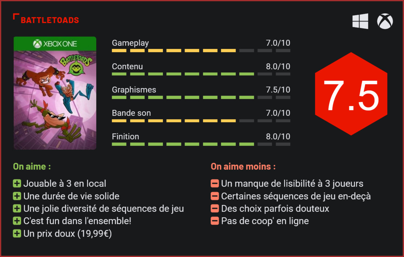 Parmi les pépites du catalogue de Rare, il en est une qu’on n’attendait plus revoir un jour. Battletoads a pourtant droit à son revival aujourd’hui sur Xbox One et PC. Un retour en grâce qui n’aurait sans doute pas été possible sans le Gamepass… Si l’on associe le plus souvent le studio britannique Rare à ses gloires passées, de plus petits projets du studio mériteraient très clairement une relecture. Killer Instinct y avait déjà eu droit sur Xbox. Aujourd’hui, c’est au tour de Battletoads, un autre chef d’œuvre incompris du grand public, de revenir sous le feu des projecteurs. A 3 joueurs, l’action peut vite devenir confuse à l’écran. Si Rare a chapeauté le projet, c’est bien au petit studio Dlala que l’on doit ce revival, qui leur a été confié par Microsoft. Une approche qui rappelle celle de Sega avec le récent Streets of Rage 4, qui n’aurait lui aussi pas pu voir le jour sans une collaboration avec un studio externe. Autre élément à prendre en compte pour ce revival inattendu : la popularité du GamePass, un argument de vente très solide pour Microsoft, sur lequel les plus petits projets indépendants cartonnent. Là encore, il s’agit d’un argument qui a dû faire pencher la balance en faveur de ce projet… Relativement fidèle à l’épisode originel, ce reboot de Battletoads n’hésite d’ailleurs pas à glisser quelques petits clins d’oeil à l’histoire de la franchise. Lors de la séquence d’introduction, le joueur apprendra ainsi que notre trio de grenouilles est resté prisonnier d’une simulation durant 26 longues années – soit le temps qu’il aura fallu à Rare pour enfin proposer une suite de Battletoads aux joueurs. Délirant, le scénario de Battletoads a le mérite d’être présenté à travers de courtes séquences d’animation fort bien réalisées, que l’on croirait tout droit sorties d’une série animée. L’humour fait souvent mouche et le scénario fonctionne plutôt bien. Les fans regretteront toutefois que le jeu s’écarte un peu de l’original dans son ton – plus grand public – et sa direction artistique, qui prend soin de ne froisser aucun esprit. Les séquences animées sont une vraie réussite. Côté prise en main, on se retrouve face à un jeu qui n’hésite pas à mélanger les genres, en nous proposant des séquences de beat them all assez proches de celles d’un Streets of Rage 4, des séquences de plates-formes, des énigmes et même des séquences de course au volant de grosses cylindrées. La diversité des séquences de jeu fait qu’on ne s’ennuie jamais. On regrette toutefois qu’aucun de ces styles de jeu ne soit parfaitement maîtrisé par le studio. Battletoads a beau être fun et relativement efficace dans sa construction, le jeu du studio Dlala manque cruellement de subtilité et de profondeur. La prise en main reste toujours très accessible et le jeu est globalement trop facile. Très clairement, c’est la quantité aux dépens de la qualité qui prime ici. Et c’est bien dommage car avec un gameplay un peu plus fouillé, Battletoads se serait sans doute imposé comme un grand jeu. La force du jeu, c’est bien sûr son mode coop à 3 en local. Battletoads a été pensé pour être joué en coop, plutôt qu’en solo. Certes, il est possible d’y jouer seul, mais on s’y amuse davantage à plusieurs, que cela soit à travers les mini-jeux qui viennent entrecouper les autres séquences de jeu et nécessitent souvent une coopération, à l’image des séquences de hacking, dans lesquelles deux joueurs doivent s’ouvrir des portes pour progresser dans un niveau en 2D, ou des courses, durant lesquelles il faudra éviter des obstacles. Fendard à plusieurs, Battletoads n’en reste pas moins peu lisible dès que les joueurs entrent en action. Les séquences de combat manquent clairement de lisibilité, la faute à une surenchère visuelle. Les séquences de course sont amusantes à plusieurs. Battletoads sait se montrer généreux avec les joueurs. L’aventure principale est découpée en plusieurs actes qui s’étalent sur une demi-douzaine d’heures de jeu tout de même – une durée de vie vraiment solide pour un beat them all. D’autant plus qu’on ne s’ennuie finalement que très peu dans le jeu. La grande diversité des séquences de jeu, les cinématiques de qualité et l’humour omniprésent maintiendront l’intérêt du joueur tout au cours de l’aventure. A 19,99€, le rapport qualité / prix est donc excellent, d’autant plus que le jeu est intégré au GamePass. Difficile toutefois de ne pas être un poil déçu par ce revival, qui ne soigne pas suffisamment son entrée. Pas de mode coop en ligne au programme, une lisibilité réduite et surtout un gameplay qui ne va pas assez loin… S’il a eu le temps de peaufiner son projet, le studio Dlala s’est un peu perdu en chemin. On aurait très clairement préféré une ration plus légère mais au goût plus prononcé. Et c’est finalement le principal reproche que l’on fera à ce Battletoads, qui remplit largement le contrat et s’impose même comme un jeu très réussi sur le plan esthétique avec sa jolie direction artistique et ses jolis graphismes en 2D. Conclusion 26 ans après ses débuts, Battletoads est de retour sous le feu des projecteurs grâce à une collaboration entre le studio britannique Rare et le studio Dlala. Le résultat est à la hauteur de nos attentes, avec un jeu très fun à parcourir à 3 joueurs en local. Battletoads n’hésite pas à mélanger les genres, en mixant plates-formes, beat them all, énigmes et séquences de course au volant de grosses cylindrées. Le cocktail est explosif, au point qu’on n’ait pas vraiment le temps de souffler. Les séquences de jeu sont toutefois inégales. De façon générale, la quantité prime ici sur la qualité. Et c’est le principal reproche que l’on fera à ce reboot, qui, s’il ne frôle pas l’ex