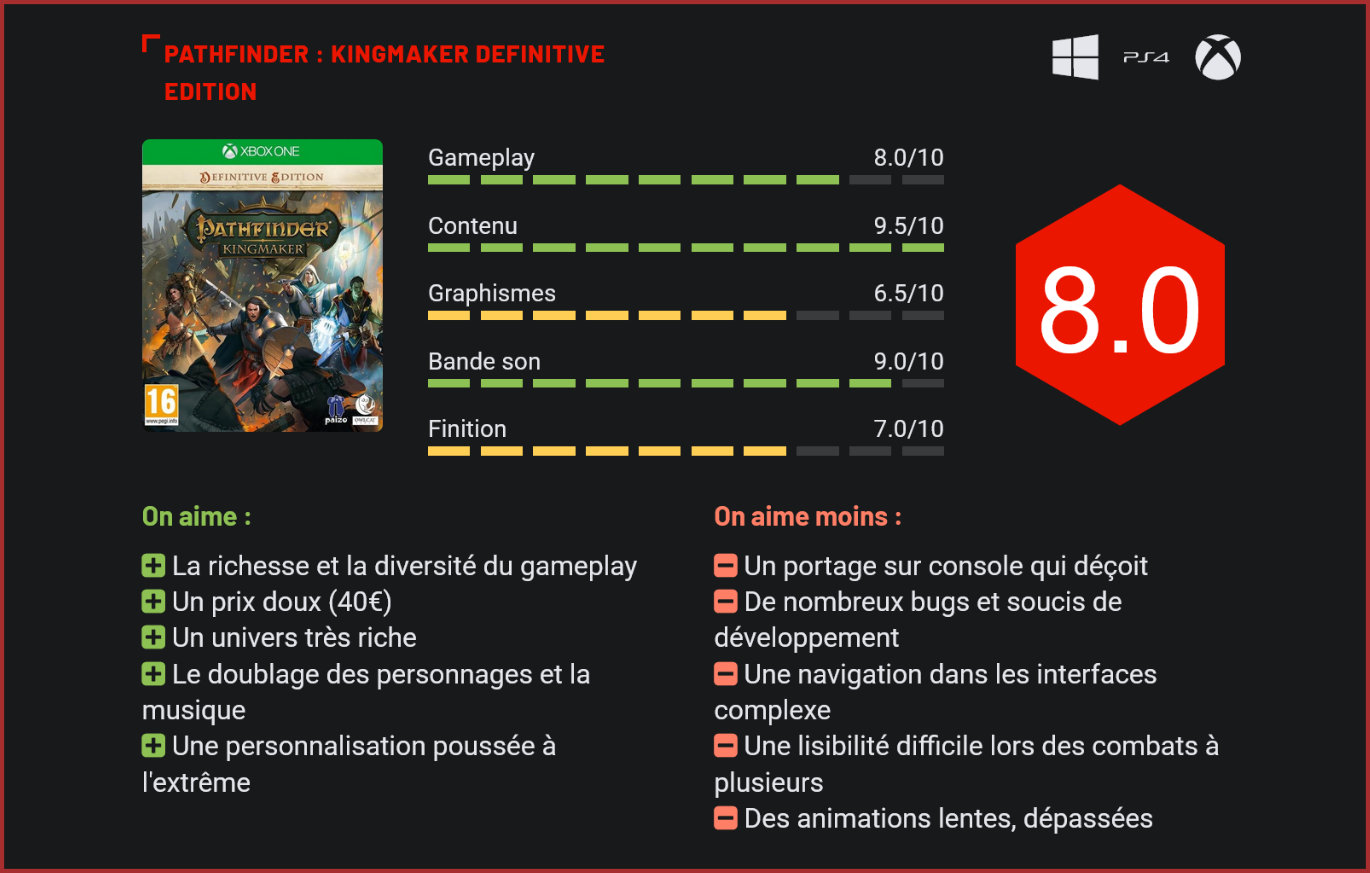 Adaptation de la franchise de jeux de plateau du même nom, Pathfinder : Kingmaker a débarqué sur PC en 2018, grâce à une campagne de financement participative. Deux ans plus tard, le jeu a enfin droit à son portage sur console. Une Definitive Edition regroupant la campagne, ainsi que les DLC. Vaut-elle le détour ? Beaucoup d’amateurs de jeux de rôle papier se sont surement empressés d’acheter Pathfinder : Kingmaker à sa sortie sur PC. Une adaptation d’une franchise bien connue et très populaire qui ne s’est pas faite sans accroc. À sa sortie, le jeu comptabilisait un certain nombre de bugs que le petit studio russe à l’origine du jeu, Owlcat Games, s’est empressé de corriger via des patchs. Étrangement, on a l’impression que les développeurs les ont perdus entre temps puisque la version console est loin d’être exempte de soucis, mais on y reviendra à la fin de ce test. Pathfinder : Kingmaker Definitive Edition prend vie dans un univers médiéval fantastique. Pathfinder : Kingmaker Definitive Edition est donc l’adaptation vidéoludique de la campagne du jeu de rôle papier éponyme. Une adaptation qui reprend évidemment l’univers particulièrement riche de l’œuvre originale ce qui devrait plaire aux adeptes de la franchise. Quant aux nouveaux venus, rassurez-vous, le titre se montre conciliant et prend son temps pour introduire et développer son univers, ainsi que son scénario. D’ailleurs, un glossaire permet à certains moments d’avoir davantage d’informations sur tel ou tel personnage, tel ou tel fait. Après avoir choisi son héros parmi 5 archétypes (guerrier, paladin, rôdeuse, ensorceleur et prêtresse) et la possibilité de personnaliser son héros – une personnalisation particulièrement poussée -, nous voilà rassemblés avec plusieurs autres mercenaires pour une quête relativement simple ; détrôner une bande de brigands qui a mis la main sur les Terres Volées. La récompense promise sera à la hauteur de nos efforts, malheureusement, notre quête ne se déroulera pas comme prévu. Le manoir dans lequel nous nous trouvions est pris pour cible par des bandits. Un début qui donne le ton, l’aventure de Pathfinder : Kingmaker Definitive Edition sera sensiblement construite de la même manière ; le joueur devra accomplir une mission à première vue simple, mais les embûches et retournements de situation seront nombreux. Une construction qui a déjà fait ses preuves et qui permet de développer une histoire riche. N’ayant pas joué à la version papier du jeu, difficile de savoir si le scénario du jeu vidéo est fidèle à l’œuvre originale. Dans tous les cas, on se laisse facilement porter par les différentes et nombreuses intrigues. Avec une petite dizaine de chapitres et un scénario particulièrement riche et bien construit, on rentre dans l’histoire sans difficulté et on reste dedans sans problème durant une cinquantaine d’heures – voire plus avec les DLC. Il ne faut pas être allergique à la lecture pour jouer à Pathfinder : Kingmaster Definitive Edition. La construction du scénario et les différents dialogues sont prenants et très bien écrits, de sorte qu’on rentre facilement dans l’histoire. On a envie d’en savoir plus. L’aspect littéraire du jeu est vraiment très poussé et très bien réalisé, avec des touches d’humour très subtiles qui fonctionnent parfaitement. Le doublage particulièrement convaincant des personnages y est très certainement pour beaucoup et aide à plonger dans cet univers médiéval fantastique. En plus d’un récit riche et d’un doublage très vivant, l’immersion est aidée par la possibilité d’effectuer des choix à la manière des Livres Dont Vous Êtes Le Héros. À plusieurs reprises, l’action sera résumée par des “scènes illustrées” dans un bouquin. Elles offriront la possibilité au joueur de choisir le comportement à adopter face à une situation. En fonction de ces choix et des compétences, mais aussi de la moralité de ses personnages, le dénouement choisi par le joueur sera ou non un succès. Chaque choix aura un effet sur le reste de l’aventure, exactement de la même manière que sur un jeu de plateau. À chaque instant, on sent que le titre est une adaptation de jeux de plateau et l’exercice est particulièrement réussi et intégré dans le jeu. Le concept de laisser le choix au joueur est vraiment intéressant et apporte une plus-value à l’aventure. On a vraiment l’impression d’être un acteur à part entière, même si ces phases plus littéraires coupent un peu le dynamisme du jeu. Le fait que l’histoire soit influencée par les choix du joueur et la personnalisation de ses héros fait que le jeu dispose d’une rejouabilité immense. Pathfinder : Kingmaker Definitive Edition présente tout de même un très gros défaut : il est lent, extrêmement lent. Les échanges entre les personnages – en dehors des dialogues avec les amis – et certaines animations lors des “cinématiques” s’exécutent avec une lenteur des plus frustrantes et cela nuit évidemment au dynamisme du jeu. Cette lenteur se retrouve également à d’autres moments dans le jeu, mais on y reviendra. Les combats peuvent se faire au tour par tour ou en temps réel, selon les goûts du joueur. Le moins que l’on puisse dire est que Pathfinder : Kingmaster Definitive Edition est un jeu complet. Il intègre à la fois de l’exploration (monde fermé), des phases de combats en temps réel ou au tour par tour, de la gestion, des aspects de RPG vidéoludiques et reprend également des caractéristiques de jeu de rôle au sens propre. Ainsi, il arrive que la progression soit influencée par le hasard du jet de dés. Si le joueur ne lance pas réellement de dés, il peut consulter les résultats dans un menu à droite de l’écran. Les résultats sont autant influencés par le hasard que par les compétences de notre héros et de sa mo