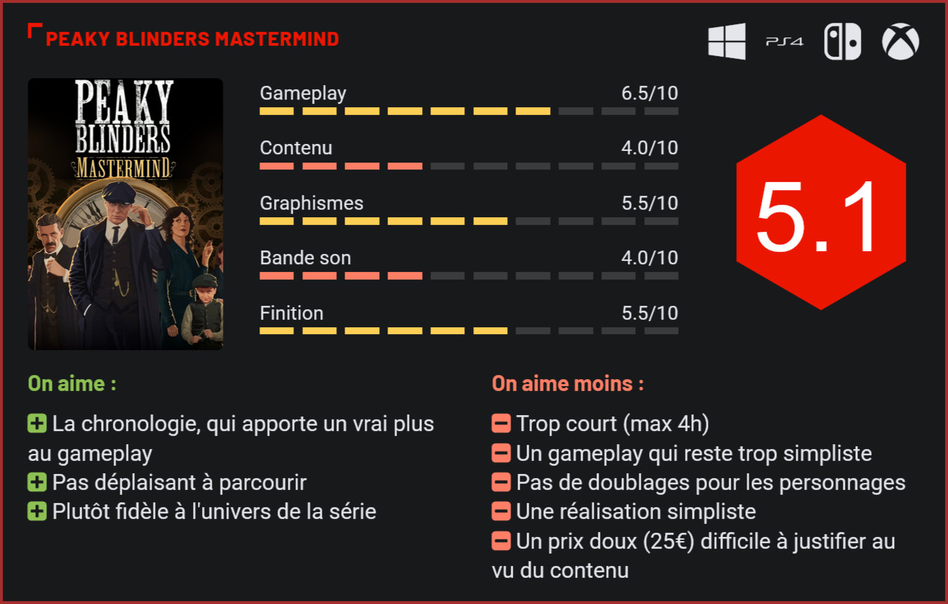 Avis aux fans de la famille Shelby, FuturLab s’est donné pour mission d’adapter l’univers de la série britannique en jeu vidéo. Une adaptation placée évidemment sous le signe de guerre de pouvoir, de sabotage et de complots, mais Peaky Blinders Mastermind est-il vraiment à la hauteur de la série ? Si le titre du studio FuturLab reprend l’univers de la série, les développeurs ont pris leur distance avec l’œuvre originale. Que les fans se rassurent, il n’est pas question de chambouler l’histoire de la famille Shelby, mais bien de mettre en scène une intrigue propre qui n’est pas tirée de la série. On se retrouve ainsi à la tête des Peaky Blinders et plus particulièrement de Thomas « Tommy » Shelby. Ce dernier a dû s’absenter quelque temps avec son frère aîné, Arthur, laissant leur territoire de Birmingham sous la direction de leur tante Polly. Si elle s’est bien débrouillée durant leur absence, la réputation des Peaky Blinders en a pâti. Thomas Shelby va donc devoir montrer qui est le patron et remettre de l’ordre dans sa ville et cela ne sera évidemment pas du goût de tout le monde. Rivalité, tensions et infiltration sont au programme de Peaky Blinders Mastermind. Bien qu’il n’adapte pas l’une des intrigues de la série, le jeu parvient malgré tout à développer une histoire qui en est digne. On regrette cependant que l’introduction dans l’univers du jeu se fasse de manière aussi tranchée. Quelques échanges entre plusieurs personnages et nous voilà jeter dans notre première mission sans réelle recontextualisation. Les fans pourraient être quelque peu perdus au début, même s’ils retrouveront la plupart des personnages de la série sous les traits de leur acteur respectif, mais on y reviendra. Pour les nouveaux venus, cette entrée en matière plutôt brutale est trop légère. On aurait préféré un développement scénaristique plus poussée et plus approfondie. Difficile de ne pas avoir l’impression que les dialogues sont juste là pour encadrer les missions. Les principaux personnages de la série sont de la partie dans Peaky Blinder Mastermind. Peaky Blinders : Mastermind prend la forme d’un jeu d’aventure et de puzzles divisé en niveaux. Chaque niveau a droit à sa séquence cinématique sous forme de BD où les personnages posent le cadre de la nouvelle mission, comme nous l’avons dit. Un contexte, un objectif et nous voilà lancés dans l’arène où plus particulièrement dans les rues de Birmingham. Cela se répète telle une boucle durant 10 chapitres. Les niveaux sont évidemment parsemés d’embûches que ça soit d’ennemis ou d’obstacles physiques qu’il faudra réussir à contourner sans se faire repérer ou à débloquer pour progresser. Pour y parvenir, le joueur devra jongler entre plusieurs membres du gang des Peaky Blinders. Ainsi, avec Ada, il pourra distraire les gardes et membres des gangs rivaux le temps que Tommy Shelby traverse, avec le jeune Finn, il pourra passer sous une barrière pour ouvrir la porte au reste du groupe, etc. Un fonctionnement qui rappelle quelque peu celui de la franchise des Desperados. Cette manière de progresser est intéressante et colle parfaitement à l’univers des Peaky Blinders, mais au final, cela reste tout de même un peu léger. Fort heureusement, les développeurs de FuturLab ont ajouté une sphère en plus : la chronologie. Le joueur devra ruser pour éviter d’être repéré par les gardes des gangs rivaux. Pour passer certains obstacles, le joueur devra en effet jongler entre plusieurs chronologies et faire en sorte que tout s’enchaîne sans accroc. Ainsi, pour atteindre une porte à l’autre bout de la rue, le joueur devra faire en sorte que l’un des personnages débloque telle autre porte, pendant qu’un autre distrait les gardes et que Tommy passe. Il pourra d’ailleurs soudoyer des PNJ pour réaliser des actions et ainsi baisser un levier inaccessible pour Tommy et ses compagnons. Peaky Blinders Mastermind demande à ce que les chronologies de chaque personne soient prises en compte et exige de faire plusieurs retours en arrière avec chacun d’entre eux pour que tout s’emboîte bien. Ce système de gestion du temps permet d’ailleurs de rebrousser chemin en cas d’échec au lieu d’un simple game over, mais aussi d’accélérer le temps ou de passer d’un événement marquant à un autre. Le concept est intéressant et fonctionne bien une fois qu’on a compris le truc – ce qui peut demander un certain temps tant quelques actions sont bancales. On tente plusieurs solutions avant de trouver la bonne et il arrive parfois que cela se joue à la seconde. Un chrono s’enclenche en effet dès le lancement d’un niveau et permet de décrocher une médaille suivant le temps écoulé pour le terminer. Au fur et à mesure, les énigmes et solutions gagnent en difficulté, on n’a donc pas l’impression de tout le temps faire la même chose, on se creuse la tête pour optimiser les déplacements de tous les personnages, même si parfois, devoir refaire le même chemin avec tous manque totalement d’intérêt. Les chronologies des personnages sont indépendantes, mais il faudra que les actions de chaque personnage s’emboîtent avec celles des autres. Pour cette adaptation, les développeurs de FuturLab sont parvenus à retranscrire le cadre de l’Angleterre durant les années 20, mais aussi l’ambiance tendue entre les gangs rivaux. Lors des séquences de dialogues – uniquement sous-titrés -, on a affaire à des panneaux de type BD plutôt bien réalisés, à la fois sombres et stylisés. Durant les phases de gameplay, il y a davantage d’animations, les badauds vivent leur vie. Les décors manquent toutefois de détails. On est loin d’un triple A. Techniquement, Peaky Blinders ressemble même davantage à un titre de la précédente génération que de celle-ci… mais la patte artistique parvient toutefois à