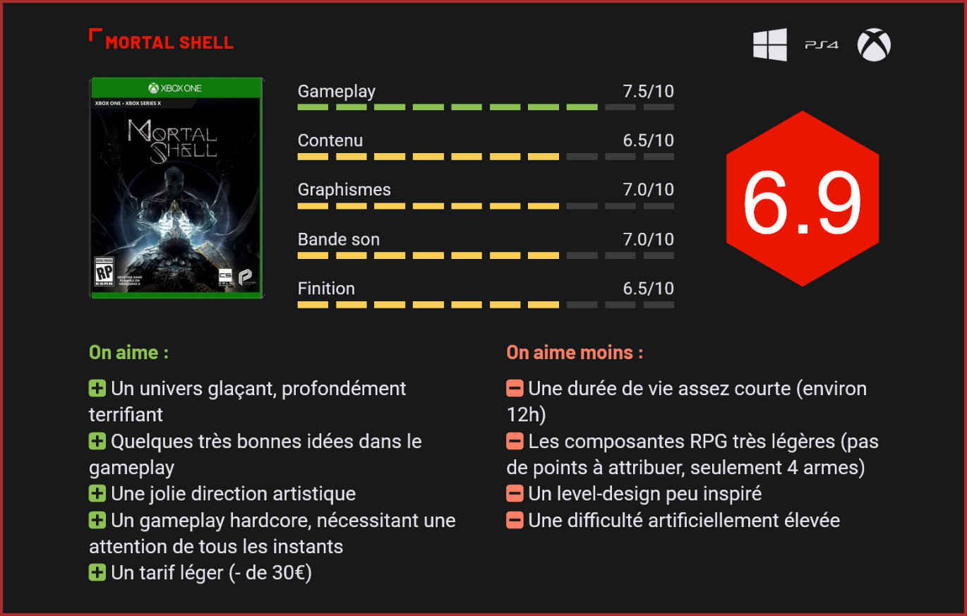 A côté des Sekiro et autres NiOh, d’autres plus petits projets tentent également de recopier la recette des Dark Souls, à l’image de Mortal Shell, qui, tout en s’inspirant très ouvertement de son modèle, apporte également quelques petites nouveautés sur le tapis. Sorti de l’imagination d’une petite équipe de passionnés, Mortal Shell était dès l’origine un tout petit projet à côté des titans que sont Sekiro ou NiOh. Et pour cause puisque le titre a été développé par une équipe d’une quinzaine de personnes seulement… Avec des ressources aussi limitées, il était évident que Mortal Shell ne parviendrait pas à donner une claque à ses concurrents. Le jeu de Cold Symmetry joue ainsi à fond la carte du projet indé. Les affrontements sont très techniques. La mort fait partie entière de l’expérience. Il ne faudra ainsi pas en attendre trop ni du scénario ni de la mise en scène et encore moins de la réalisation en générale, très correcte on vous rassure, mais qui ne vous en mettra jamais plein les yeux. Mortal Shell est un petit projet indépendant et les développeurs ont tenu à placer tous leurs efforts dans le gameplay et les sensations de jeu. On se retrouve donc propulsé dans un univers sombre et glacial, dans la peau d’un personnage décharné, avec seulement quelques indices qui nous permettent d’émettre des déductions sur l’univers du jeu et son scénario. De façon générale, l’intrigue de Mortal Shell restera clairement au second plan, tout au cours de l’aventure. Cela n’empêche pas Mortal Shell de savoir faire preuve d’originalité. Notre personnage, très faible sans armure, pourra ainsi revêtir l’une des quatre armures à sa disposition, correspondant pour chacune d’elle à une classe particulière du jeu. Ne tergiversons pas, celles-ci n’offrent aucune customisation. Et c’est probablement là le plus gros défaut du jeu, qui reste très sobre dans sa proposition, avec seulement quatre armes différentes au programme, et un gameplay qui n’évoluera pas énormément d’une classe à l’autre, celles-ci ne donnant finalement que des avantages d’endurance ou de santé au joueur. On est très loin des possibilités offertes par un Dark Souls. Les ennemis sont nombreux, ils se déplacent souvent en groupe. Côté craft, le jeu se veut également avare en options. On peut améliorer les 4 armes du jeu… et c’est tout. Ne vous attendez pas à un vaste arbre de compétences. La composante RPG est vraiment au second plan. Le gameplay du jeu se révèle globalement plutôt exigeant, et là, bien plus calqué sur celui de Dark Souls que de ses concurrents. On progresse par l’échec. Comprenez par là que vous mourrez beaucoup au début de l’aventure pour apprendre les rudiments du métier. En l’occurrence, apprendre à éviter les coups de ses ennemis en lançant son esquive au bon moment, apprendre les paterns de ses adversaires et maîtriser le contre. Quelques petites originalités sont toutefois au programme. Par exemple, lorsque votre personnage mord la poussière une première fois, il se verra éjecté de son armure, et pourra alors tenter de la rejoindre de nouveau pour récupérer ses points de vie et son arsenal, pour retenter sa chance une seconde fois. Une seconde mort forcera le joueur à recommencer toute une partie du niveau. Le jeu se révèle ainsi plus accessible que ses rivaux. Autre particularité : l’endurcissement, qui fait partie intégrante du gameplay. Votre personnage dispose en effet de la capacité à se transformer en pierre durant quelques instants pour absorber les coups de son adversaire, ce qui peut s’avérer pratique pour lancer une contre-attaque par exemple, ou éviter une mort certaine. Enfin, la jauge de détermination qui se remplira au fil des combats permettra de lancer des attaques très puissantes tout en récupérant un peu de santé. A utiliser avec modération, elle peut vite devenir un élément qui permettra de faire pencher la balance en votre faveur lors d’un combat de boss… Ces différentes particularités donnent à Mortal Shell une identité qui lui est vraiment propre et rendent l’expérience grisante pour les amateurs du genre, car enfin, ils ont droit à un peu de fraîcheur. Pour autant, Mortal Shell est loin d’être parfait. On regrette ainsi le level-design très sombre et pas forcément très inspiré du jeu. Les développeurs ont artificiellement augmenté la difficulté en multipliant les rencontres dans leurs niveaux labyrinthiques, avec des ennemis qui vous surprendront à de multiples reprises en se cachant dans les angles morts. Les boss ne sont guère imaginatifs eux non plus, et si les terrasser est plutôt grisant, il ne faut pas s’attendre à être surpris durant l’aventure. Le level-design du jeu manque de maturité. Globalement, le jeu n’est pas déplaisant, mais il est également loin d’être une totale réussite. L’aventure se bouclera ainsi en moins de 10 petites heures de jeu. Si les débuts sont grisants, la progression tend vite à décevoir, avec des allers-retours intempestifs, beaucoup de petites rencontres et finalement peu de boss (6 en tout et pour tout). C’est un peu léger, même à tarif réduit (29,99€). Si l’on fermera volontiers les yeux sur l’esthétique du jeu – globalement réussie mais à aucun moment fantastique -, sa bande son finalement très banale et sa mise en scène simpliste, difficile de ne pas être déçu par la proposition, trop légère pour convaincre. Le level-design peu inspiré, les allers-retours, le manque de personnalité du jeu et son gameplay un peu trop léger font qu’on n’y reviendra pas forcément une fois le jeu fini. L’univers très sombre du jeu, sa direction artistique plutôt inspirée et ses quelques particularités pousseront toutefois les amateurs du genre à lui donner sa chance. Conclusion S’il ne fait pas le poids face à un Dark Sou