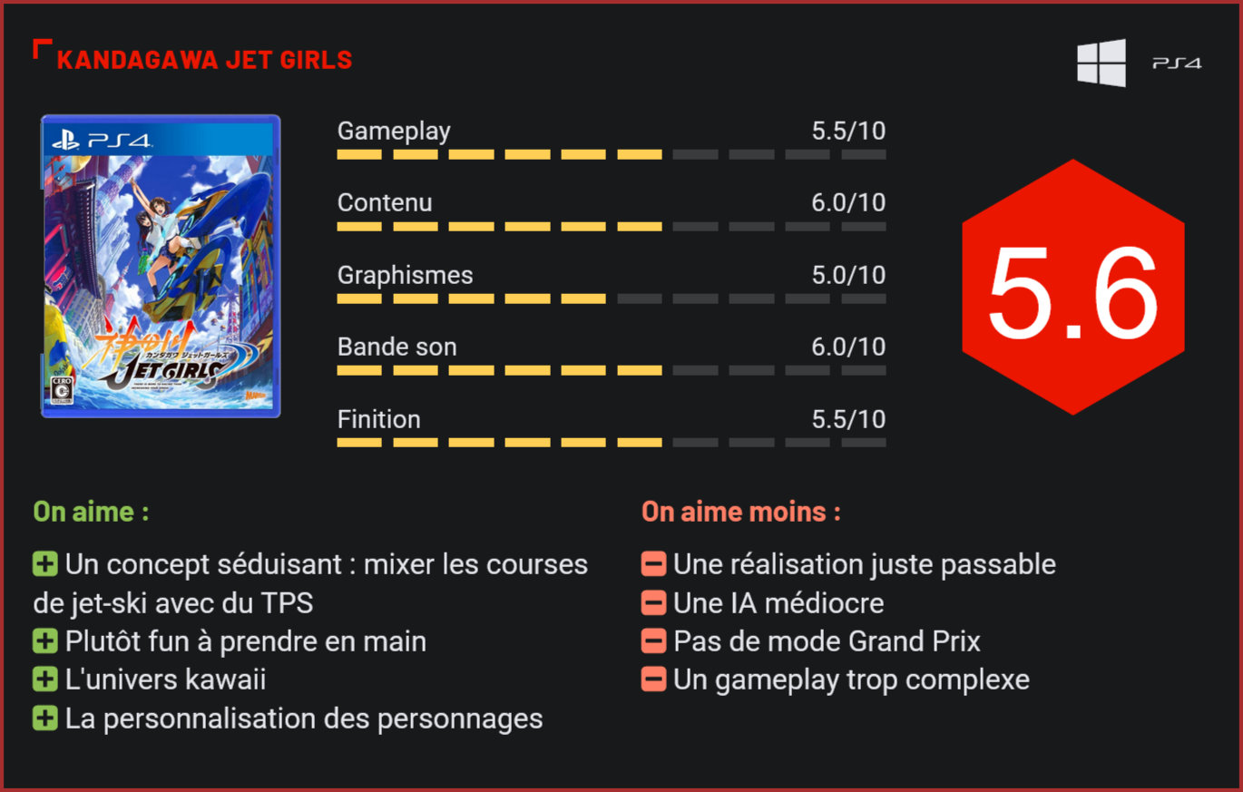 Nouveau jeu des créateurs de la série des Senran Kagura, Kandagawa Jet Girls est un nouveau projet multimédia très ambitieux qui a mené à la création d’une série d’animation et d’un jeu vidéo. Ciblant pratiquement uniquement une audience nippone, Kandagawa Jet Girls a pourtant bien droit aujourd’hui à une sortie internationale sur PC et PS4. Le nouveau jeu des créateurs de Senran Kagura surfe sur un concept unique : mélanger courses de jet-ski et séquences de tir. Les joueurs affronteront ici d’autres compétiteurs en utilisant des pistolets à eau pour les faire chavirer. Un concept très fun qui peine toutefois à séduire dans la pratique. La conduite du jet-ski est plutôt fun. Avant de démarrer votre carrière, il faudra impérativement passer par le tutoriel. Il est possible de foncer tête baissée, mais nous vous le déconseillons très vivement car malgré les apparences, Kandagawa Jet Girls n’est pas un jeu facile à maîtriser niveau gameplay. Car on ne se retrouve pas ici face à un simple jeu de courses nautiques à la Wave Race. Il faut en effet ajouter les combats à l’équation. Et c’est là que les choses se compliquent car déjà dans sa partie conduite, le jeu impose la maîtrise de quelques éléments, des sauts aux figures en passant par le boost, il faudra sans cesse combiner les touches pour suivre une trajectoire parfaite. Là où les choses se compliquent, c’est qu’il faudra régulièrement prendre le contrôle de son second personnage pour canarder les ennemis, de front ou de dos. Les tirs rapides (automatiques) manqueront pratiquement systématiquement leur cible. Il faudra donc passer par un tir manuel, très difficile à cadrer lorsqu’on se déplace à toute vitesse sur une surface qui n’est pas plane… Très vite, l’exercice se transforme en une discipline olympique. La difficulté de gérer simultanément la conduite et le tir est bien réelle. Par chance, le niveau de difficulté n’est pas très élevé : l’IA est au mieux médiocre puisqu’elle suit un tracé prédéfini en plein milieu de la piste et à moins d’être vraiment gauche difficile de perdre une course, même en ne tirant pas une seule cartouche. Les séquences de shoot manquent cruellement de précision. Si le concept est fun, dans la pratique, la prise en main est trop complexe pour que le jeu soit fun. L’IA désastreuse des ennemis ne permettrait de toute façon pas de prendre son pied même si l’on maîtrisait parfaitement la prise en main, il sera difficile de trouver une partie en ligne, le online étant complètement désert. Côté contenu, Kandagawa Jet Girls se montre à la fois généreux et très limité, avec un vrai mode solo scénarisé qui multiplie les courses, défis et dialogues, un mode course simple et un tutoriel. On ne retrouve en revanche pas de mode Grand Prix façon Mariokart, dans lequel on aurait pu enchainer les courses pour tenter de gagner une compétition… Et un multi complètement désert. Les développeurs ont toutefois tenu à donner de la substance à leur jeu en proposant au joueur de customiser son personnage, d’améliorer son jet-ski par un système de gain d’expérience, et de participer à diverses activités prenant la forme de mini-jeux. En solo, le jeu n’est vraiment pas déplaisant. Le concept reste fun et les courses amusantes, mais on finit vite par se lasser du jeu au vu de la simplicité des défis. De par sa nature, Kandagawa Jet Girls séduira donc principalement les amateurs de mangas et d’animés. On retrouve ici une bonne dose de fan-service et on sent que les développeurs ont tenté de répondre au mieux à leur attente. Des mini-jeux viennent entrecouper les courses. Techniquement, si le jeu reste très simple, le cel-shading joue plutôt bien les cache-misère. L’univers coloré et pétillant du jeu, ses cinématiques animées et son côté ultra-kawaii nous fait très vite oublier que le titre aurait très bien pu sortir sur PS3. Seule l’animation des personnages et leur rigidité nous rappelle à la triste réalité d’une production à tout petit budget. Côté bande son, les musiques et doublages sont efficaces et ajoutent un peu de peps à l’univers, mais aucun thème ne restera ancré dans votre mémoire. Compte tenu de son angle et de sa réalisation, on aurait pu s’attendre à ce que Kandagawa Jet Girls soit vendu à petit prix, mais ce n’est malheureusement pas le cas puisque le jeu est vendu au prix plein, soit près de 50€ tout de même en numérique. Ce qui reste très cher payé pour une production à petit budget… Conclusion Le nouveau jeu des créateurs de Senran Kagura s’adresse avant tout aux fans d’animation et de mangas. Avec son univers coloré, son concept délirant et ses personnages kawaii, Kandagawa Jet Girls est très clairement un jeu qui cible le marché oriental. Son concept, qui mélange courses de jet-ski et séquences de tir n’en reste pas moins très fun et pourrait à ce titre séduire quelques joueurs en manque de courses nautiques. Il faut dire que depuis la mise à le retraite d’Hydro Thunder et de Wave Race, les fans du genre n’ont pas grand chose à se mettre sous la dent. Cependant, la prise en main complexe et très rigide du jeu font qu’il est difficile de prendre son pied sur le jeu. Techniquement, on est loin aussi du plein potentiel de la PS4. S’il n’est pas déplaisant à parcourir avec son mode solo entièrement scénarisé, Kandagawa Jet Girls a bien du mal à justifier son prix plein au vu de ses nombreux petits défauts.