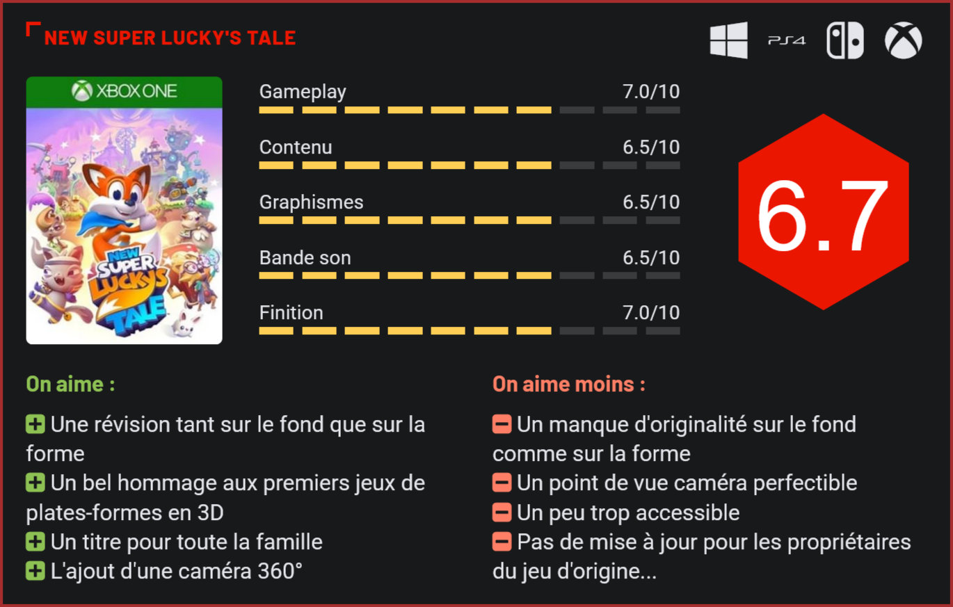 Sorti en exclusivité sur Xbox One en son temps, Super Lucky’s Tale n’avait pas convaincu, malgré son univers fort sympathique. Deux ans plus tard, le studio Playful avait porté son jeu sur Switch. Le studio corrige aujourd’hui ses nombreux défauts dans une version revue et corrigée. De quoi faire oublier l’original ? Dans cette revisite, New Super Lucky’s Tale reprend le scénario de l’original. Celui-ci ne présentait pas vraiment de problème à l’époque si ce n’est qu’il n’était pas particulièrement profond ni original. On se retrouve ainsi à diriger le renardeau Lucky. Celui-ci a été aspiré par le livre des Âges après que le méchant Jinx ait tenté de mettre la main dessus pour anéantir le monde de Lucky et de l’Ordre des Gardiens. Pour s’en échapper, notre héros devra récolter les différentes pages du livre magique qui se sont égarées dans plusieurs mondes, tout en repoussant les sbires de Jinx. Un scénario tout ce qu’il a de plus classique, à la fois mignon et enfantin, avec les méchants d’un côté et les gentils de l’autre, qui plaira autant à un jeune public qu’à des joueurs plus aguerris. D’autant plus que les personnages y sont particulièrement attachants. Cette construction rappelle forcément celle d’autres jeux qui ont marqué les esprits des joueurs durant les années 90-2000. Le titre de Playful se rapproche en effet de titres tels que Crash Bandicoot ou Yooka Laylee. Une ressemblance que l’on perçoit tant sur le fond que sur la forme puisque New Super Lucky’s Tale est un jeu de plates-formes qui rend hommage aux titres 3D d’antan sur Nintendo 64 ou PlayStation 1. Le jeu de Playful intègre d’ailleurs des passages 2D et 3D. Si les mécanismes sont fort similaires aux jeux de plateformes des années 90, New Super Lucky’s Tale propose tout de même un joli panel de mini-jeux. Le joueur devra donc explorer les différents niveaux, atteindre différents objectifs pour progresser, mais aussi récupérer plusieurs types de collectibles en plus des pages du Livre des Âges ; pièce d’or, diamant, vie, tête du renard, ainsi que les lettres du prénom Lucky. Certains de ces objets à collectionner seront d’ailleurs capitaux pour progresser puisqu’ils permettront de débloquer de nouveaux niveaux. Une manière d’allonger la durée de vie du jeu. Les plus perfectionnistes ne rechigneront pas à relancer un niveau pour trouver tous les trésors cachés, mais aussi pour explorer les sous-niveaux qui offrent divers bonus. C’est plaisant et cela rappelle encore une fois les titres d’antan et leurs passages secrets. On pourrait d’ailleurs regretter le manque d’originalité du titre qui reprend peut-être trop les caractéristiques des jeux de plates-formes d’autrefois. Seule la bestiole que l’on dirige est différente. Les mécaniques de jeu sont toutes aussi semblables (courir, effectuer un double-saut, tournoyer en donnant un coup de queue et creuser). Le tout reste tout de même très efficace. On notera tout de même que les objectifs de niveaux sont plutôt diversifiés. Le jeu se renouvelle assez bien avec des mini-jeux variés. Globalement, c’est plaisant et l’amusement est présent durant la dizaine d’heures que demandera le jeu pour être terminé. La prise en main est très simple, de même que le gameplay dans sa globalité. Parce que oui, le jeu a subi un joli remodelage de la part de ses développeurs. Si le scénario est sensiblement le même, le studio a apporté des modifications tant sur le fond que sur la forme du jeu, et ce, dès le début. Ainsi, la cinématique d’introduction n’est pas la même, les images statiques ont laissé place à des plans de types BD légèrement animés et très jolis. On notera également que le jeu n’est plus doublé en français, mais uniquement disponible en VOSTFR. Sur la forme, New Super Lucky’s Tale a subi un remappage dans certains mondes. Des niveaux ont été supprimés, d’autres ont été ajoutés. On notera d’ailleurs que de nouveaux mondes ont fait leur apparition à la fin de celui-ci, augmentant sa durée de vie. Playful a donc revu presqu’entièrement son jeu et c’est appréciable. Cette révision se sent particulièrement au cours du jeu, notamment grâce à l’ajout d’une caméra à 360°. À l’origine, les joueurs disposaient uniquement de trois points de vue sur leur héros. La caméra joue tout de même encore quelques tours, surtout lorsque le point de vue est très éloigné de la plateforme sur laquelle on veut souhaiter. Difficile de gérer exactement l’atterrissage. Dans certains cas, des obstacles obstruent la vue. La prise en main, elle, est inchangée. Elle est toujours aussi simple. Le jeu propose tout de même quelques explications ici et là, de quoi aider les plus jeunes joueurs, mais dans l’ensemble c’est très accessible. L’univers du jeu est très mignon et enfantin. Enfin, comme nous l’avons déjà dit, le cadre est mignon et attendrissant. On se laisse totalement porter par cet univers simplet, très coloré, cartoonesque et enfantin. On notera d’ailleurs que les niveaux sont plus aérés et plus éclairés ce qui rend l’exploration encore une fois plus sympathique. Quant aux différents mondes, ils sont de nouveau très variés ce qui est très appréciable. Notre seul regret au final concerne les propriétaires du jeu original, qui n’ont pas droit à ces nouveautés sans repasser par la caisse. Dommage. Conclusion Trois ans après sa sortie, Super Lucky’s Tale revient après une révision plus que nécessaire. Le studio Playful a fait un vrai travail de fond pour redorer l’image de son jeu vidéo aussi mignon qu’adorable. Ce platformer rend hommage aux jeux de plates-formes 3D emblématiques des années 90-2000 en reprenant tout ce qui a fait leur succès à l’époque. Une prise en main facile, une construction tout aussi simple et un univers coloré et enfa