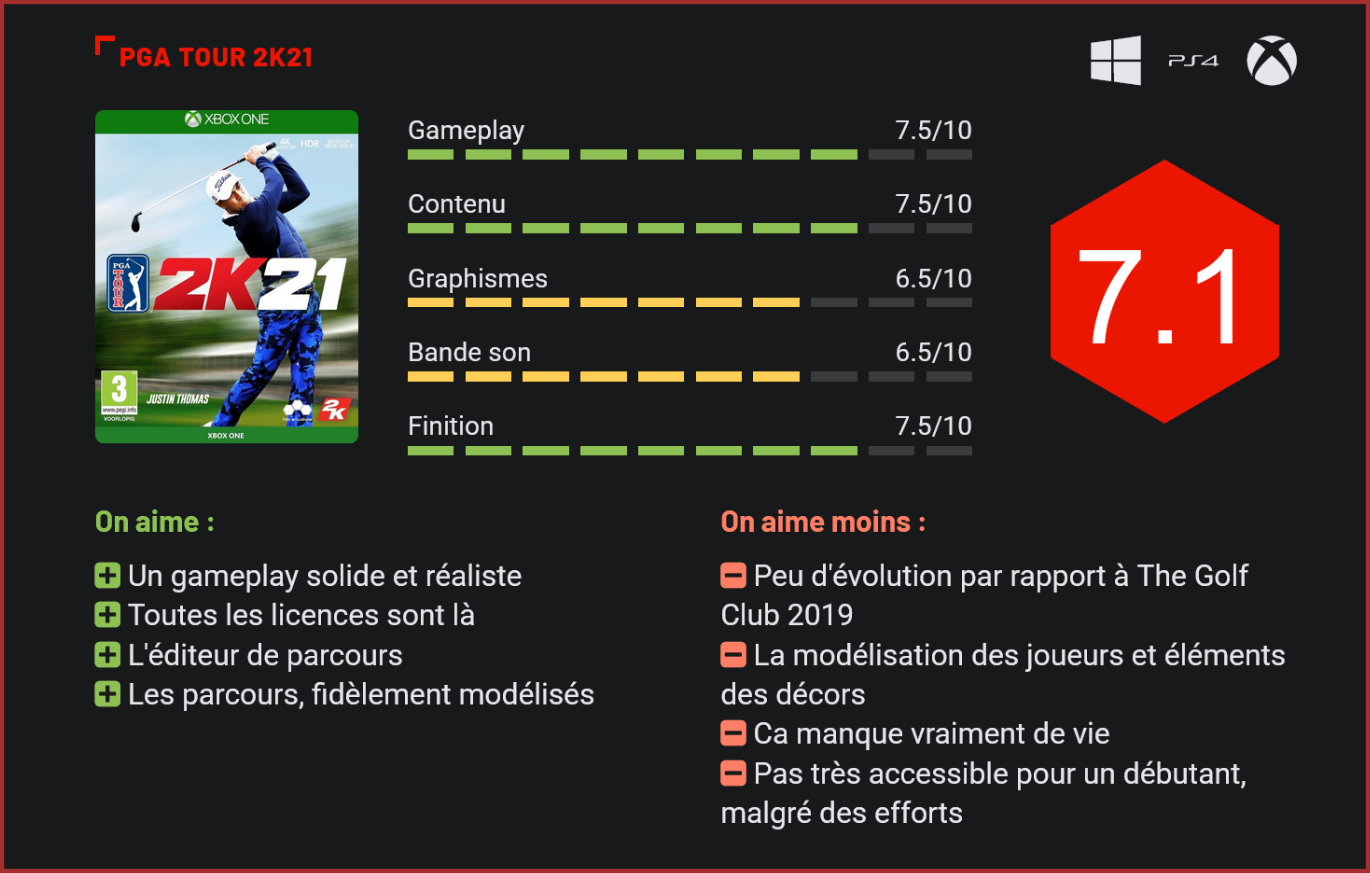 Désormais entre les mains de 2K Games, la licence officielle PGA revient d’entre les morts. L’éditeur américain a choisi de se baser sur les fondations très solides de The Golf Club pour sa nouvelle simulation de golf. Après des débuts prometteurs, la série The Golf Club passe la seconde avec un changement de nom qui vise surtout à rameuter les foules en se reposant sur les licences officielles. Car non, PGA Tour 2K21 n’a rien à voir avec ce bon vieux Tiger Woods d’Electronic Arts. Il s’agit d’un petit tour de passe-passe de l’éditeur 2K Games pour redonner à sa série l’attention qu’elle mérite. Le gameplay du jeu se repose sur les solides bases de The Golf Club. Qu’il s’agisse du gameplay, de l’esthétique ou de l’interface, tout repose sur The Golf Club. Il est d’ailleurs difficile ce curieux sentiment de rejouer à la cuvée 2019. C’est un fait, 2K Games a concentré ses efforts sur les licences officielles. On retrouve dans cette cuvée tous les parcours du championnat officiel, la FedEx Cup, et certaines figures emblématiques de la discipline – que vous ne pourrez malheureusement pas incarner, même en multijoueur, puisque le jeu vous propose de créer votre propre personnage pour les affronter. Dommage pour les fans. Ceci étant dit, côté licences officielles, PGA Tour 2K21 ne déçoit pas. Côté contenu, les fondations sont plutôt solides aussi. On démarre avec un très long tutoriel, on continue avec un mode solo au choix, parmi 3 compétitions, et sur la durée, on se repose principalement sur le online et l’éditeur de niveaux qui permet de créer ses propres parcours de A à Z en y ajoutant végétation, gradins, public et même faune locale. C’est riche en contenu et il y a largement de quoi s’occuper pendant des mois. En revanche, on peut très clairement reprocher au jeu de manquer cruellement de vie. L’immersion est minimaliste, la mise en scène également. On enchaine les parcours sans trop se préoccuper d’un scénario. Tout paraît très artificiel, et c’est bien dommage. Les parcours sont fidèlement modélisés. Pour ce qui est du gameplay, 2K Games a fait de gros efforts pour rendre son jeu accessible au plus grand nombre. Après le tutoriel, le joueur aura le choix d’opter pour plusieurs types de prise en main. En mode Pro, toutes les aides de jeu sont désactivées et le joueur devra prendre en compte de nombreux facteurs comme le vent, l’élévation du terrain, l’orientation du jouer. Il devra également choisir lui mêmes ses clubs selon les situations… A l’inverse, en mode Débutant, toute une série de points sont gérés automatiquement. Le joueur doit principalement se concentrer sur la trajectoire de la balle et la puissance de son coup. C’est plus accessible mais pas forcément très accessible pour un vrai débutant. Il faut en effet au minimum connaître les règles du jeu et s’y être intéressé au préalable pour y comprendre quelque chose. Les bases du jeu reposent sur celles de The Golf Club et cela se ressent. On retrouve le même système de swing, basé sur l’usage du stick droit pour ajuster la puissance du tir et la direction de la balle, la même physique et les mêmes réglages. Pour un pro, l’expérience est très riche, car il y a de nombreux facteurs à prendre en compte. Il faudra changer de club selon la surface et la situation, analyser l’orientation et la force du vent, choisir son type de coup (du swing au putt en passant par le chip). C’est complet, riche et les fans de la discipline en auront pour leur argent. On regrette toutefois que 2K Games n’en ait pas profité pour améliorer la recette… Visuellement, c’est un peu plus joli que The Golf Club, mais on est loin d’atteindre le potentiel des consoles actuelles… La principale nouveauté, côté gameplay, concerne en effet l’introduction des rivaux, qui se base sur l’ajout des joueurs sous licences officielles. Des joueurs que vous croiserez dans le mode solo du jeu, et dont l’un deviendra votre rival. 2K Game tente d’ajouter une dimension humaine à son jeu, sans vraiment y parvenir puisque là aussi tout semble très artificiel. En le devançant dans les parcours, le joueur décrochera des récompenses supplémentaires. Ses performances seront également présentées au joueur pour tenter de lui mettre la pression. L’idée est sympathique, mais la réalisation l’est un peu moins. Ca fonctionne plus ou moins, mais ça manque encore malgré tout cruellement de vie. Sur le plan technique, même constat. PGA Tour 2K21 est fidèle à l’univers du golf. Les greens sont fidèlement modélisés mais le rendu est encore une fois très artificiel. Les modélisations des joueurs, du public et de certains éléments des décors ne rendent pas vraiment hommage aux capacités des consoles actuelles. C’est d’ailleurs très clairement là que le jeu perd des points, car en 3 ans, les améliorations restent très légères. La bande-son a eu droit au même traitement : des voix off qui vous guident dans le tutoriel, parfaitement audibles mais qui manquent cruellement de vie, quelques bruitages presque cliniques, et le tour est joué. Il y avait très clairement moyen d’en faire plus. Conclusion Reposant sur les fondations de The Golf Club, PGA Tour 2K21 est une simulation de golf solide, très riche au niveau de son contenu et de son gameplay, mais qui pêche toutefois par un manque d’immersion dans la compétition. Le jeu de 2K Games manque cruellement de vie, tant dans sa mise en scène que ses décors. Pour les amateurs de golf toutefois, PGA Tour 2K21 reste la simulation incontournable. D’autant plus que cette cuvée 2020 ajoute quelques jolies nouveautés avec les licences officielles PGA, l’intégration des rivaux et un éditeur de niveaux encore plus riche. On sent là un vrai potentiel, qui sera peut-être mieux exploité l’année prochaine, avec un nouveau moteur grap