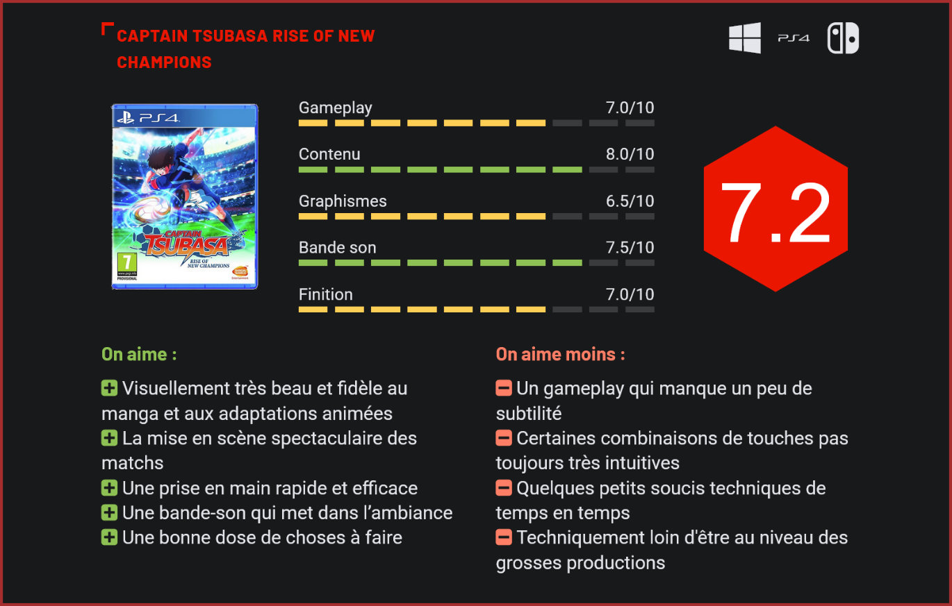 Suite au succès de la nouvelle série animée, Captain Tsubasa débarque sur Nintendo Switch, PS4 et PC dans un tout nouveau jeu de Football qui ravira les fans du manga culte. Plus connu chez nous sous le nom “Olive et Tom”, Captain Tsubasa est un manga de football par Yōichi Takahashi publié dans les années 80. Si la série animée adaptant les aventures de Tsubasa Ozora commence à dater, la mise en production d’un remake de cette série en 2018 a redonné un peu d’élan au manga culte, permettant à une toute nouvelle génération de le découvrir. Et c’est dans ce contexte que Bandai Namco et les développeurs Tamsoft nous proposent une nouvelle adaptation vidéoludique du classique du Shônen Jump. Si l’histoire originale suit Tsubasa durant toute sa jeunesse et sa carrière naissante de footballeur, le jeu se concentre sur des périodes bien précises à travers deux modes scénarisés. Un “Épisode Tsubasa” où l’on incarne le héros de la série et son équipe qui prennent part au tournois national des écoles. Ainsi qu’un “Épisode nouveau héros” dans lequel on pourra créer notre propre personnage et gérer notre équipe dans le but de participer au Tournois mondial Junior Challenge. Ces histoires proposent d’affronter de nombreuses équipes issues d’autres écoles japonaises ainsi que des équipes d’autres pays (celles-ci sont jouables dans d’autres modes de jeu). Les scénarios nous laissent prendre part à des compétitions. Rise of New Champions est un jeu de football au gameplay arcade et aux règles un peu simplifiées. Les boutons principaux de la manette sont dédiés aux différents types de tirs tandis que les gâchettes servent à sprinter ainsi qu’à esquiver et tacler. Chaque joueur possède une jauge d’endurance dont il faudra tenir compte. Enfin, charger le tir de certains personnages lancera un super tir mis en scène par une cinématique très stylisée. Si la prise en main est aisée et agréable, il faudra bien suivre les tutoriels du mode entraînement pour saisir toutes les subtilités du gameplay. Des combinaisons de touches permettent de faire des actions plus complexes, ce qui prendra du temps à assimiler. Le jeu permet également une bonne dose de personnalisation avant les matchs et durant les mi-temps. Il est tout à fait possible de changer la composition de son équipe et de changer de tactique pour s’adapter à la situation. Malgré toutes ces possibilités, il faut tout de même souligner que le jeu devient très vite répétitif. Un problème qui n’est pas véritablement lié à Rise of New Champions en particulier mais au genre auquel il appartient. Le jeu propose finalement peu de diversité dans son gameplay, ce qui est commun pour un jeu de sport. Il aurait toutefois pu proposer un peu plus de profondeur dans son gameplay. La mise en scène donne l’impression de revivre l’animé. La mise en scène du titre est un véritable atout. De nombreuses actions en plein match seront ponctuées par de courtes cinématiques très dynamiques. Les exemples sont nombreux: les super tirs, la réception du gardien, les esquives et même des attaques spéciales avec deux joueurs… Les personnages les plus importants du manga bénéficient d’un soin tout particulier, avec parfois des actions aux pré-requis différents dépendant de leurs techniques dans l’œuvre originale. L’ambiance générale du titre est une franche réussite tant elle rappelle les adaptations animés. L’entièreté du jeu est doublé en japonais, y compris les commentateurs. Il ne faut cependant pas s’attendre à voir du réalisme dans un jeu Captain Tsubasa. Ici, les tirs les plus puissants sont enflammés, les gardiens sont projetés en arrière et les tacles font décoller les joueurs. Le jeu respecte à 100% la folie du manga. Cette mise en scène est sublimée par la direction artistique du jeu. Bien qu’en 3D, les personnages et décors semblent tout droit sortis de la série animée. Le character design de Yōichi Takahashi est tout à fait respecté. Les musiques sont également de très bonne facture et accompagnent parfaitement les matchs endiablés. Il faut tout de même souligner quelques petits soucis techniques qui apparaissent de temps à autre durant certaines cinématiques, mais rien qui ne puisse nuire à l’expérience de jeu. Côté réalisation, ce n’est pas non plus extraordinaire. Le jeu est fidèle au matériau de base mais le moteur graphique est loin d’exploiter le potentiel de la PS4 et les animations sont d’un autre âge sur le terrain. La création de notre personnage respecte le character design original. Rise of New Champions propose son lot de contenu intéressant qui vous occupera durant de nombreuses heures. Le jeu possède, bien entendu, un mode en ligne pour affronter d’autres joueurs, mais également de nombreux aspects de customisation pour, par exemple, créer votre dream team. Le mode scénarisé “nouveau héros” déjà cité offre de nombreuses possibilités. Il s’agit d’un mode très sympathique incorporant des éléments de RPG pour faire évoluer notre personnage. Il est possible d’interagir avec les héros du manga pour se rapprocher d’eux et ainsi apprendre leurs techniques. Les statistiques de notre personnage évolueront selon nos actions en match. Le jeu possède également tout un tas de bonus pour gonfler encore plus la durée de vie. Des défis vous rapporteront une monnaie permettant de débloquer plus de personnages et objets pour le mode “nouveau héros”. Le jeu possède également des petites scènes rappelant les événements importants de l’histoire originale. Ainsi les joueurs ne connaissant pas Captain Tsubasa ne seront pas totalement perdus, même si le jeu est surtout destiné aux fans déjà conquis par cet univers. Conclusion Captain Tsubasa Rise of New Champions est un fort bel hommage au manga culte des années 80. Un jeu de football u
