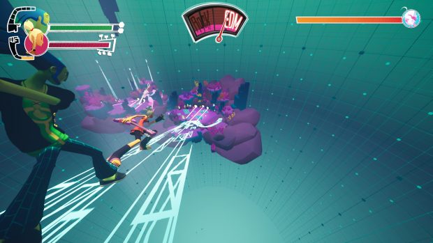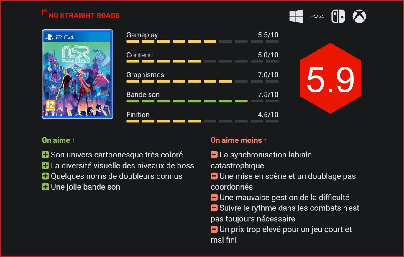 Développé par Metronomik, studio fondé par Wan Hazmer (Final Fantasy XV) et Daim Dziauddin (Street Fighter V) ,No Straight Roads nous propose une aventure rythmée par la musique, au sens propre comme au sens figuré. Un concept séduisant qui démarque le titre des autres jeux d’action-aventure. Dès les premières minutes de jeu, No Straight Roads marque les esprits par son cadre et son univers si particulier. Le jeu propose en effet un univers atypique, très coloré à la direction artistique très particulière. Le ton y est à la fois léger et engagé puisque le titre nous propose de nous faire incarner Zuke et Mayday, les membres d’un groupe de rock engagé contre l’empire No Straight Roads qui utilise la musique électro pour dominer et exploiter Vinyl City. Certains panoramas sont splendides. Le scénario est loin d’être renversant. Il s’agit une fois de plus de la lutte de petites gens contre les grands dirigeants qui complotent en secret. Les quelques rebondissements de l’histoire sont prévisibles et manquent cruellement d’intérêt. C’est lisse tout en étant déséquilibré. Le personnage de Mayday – légèrement hystérique – prend en effet le pas sur celui de Zuke, en retrait. Les autres personnages sont caricaturaux et tout aussi dénués de substance. La mise en scène est quant à elle très dynamique, mais rate tout de même le coche. C’est trop, tout le temps. On appréciera tout de même que le jeu soit entièrement doublé en français. Celui-ci profite d’ailleurs d’un casting de doubleurs 5 étoiles avec des comédiens de doublage tels que Céline Monsarrat, voix française de Julia Roberts, Kelly Marot (Jennifer Lawrence, Sophie Turner, Mama dans Death Stranding) ou encore Donald Reignoux (Titeuf, Peter Parker dans The Amazing Spiderman, Sora dans Kingdom Hearts). Malheureusement, la mise en scène ne permet pas d’apprécier leur talent. C’est souvent surjoué par rapport aux personnages et à d’autres moments ce sont les personnages qui en font de trop. Par ailleurs, la synchronisation entre le son et l’image est catastrophique. Un personnage termine sa phrase alors que c’est un autre qui est à l’écran et qui a déjà commencé à parler. Parfois, le son se coupe près de deux secondes avant que l’action ne se passe, laissant un vide gênant… La mise en scène pose véritablement problème. Les personnages surjouent ou alors ce sont les doubleurs. C’est trop et pas en accord. Malheureusement, le jeu ne se rattrape qu’à moitié grâce à son gameplay. No Straight Roads place la musique au cœur de l’expérience. Durant les phases de « combat », le joueur doit éviter les coups ou attaquer en rythme. Dans les faits, il peut parfaitement se passer du son pour progresser puisqu’il peut tout à fait possible de se fier aux animations des ennemis. Ces derniers sont relativement faciles à vaincre, d’autant plus que nos héros disposent d’une barre de vie assez conséquente, la longueur des niveaux pour se rendre jusqu’au boss est plus mortelle. D’autant plus que les différents niveaux sont particulièrement vicieux. La difficulté n’est pas vraiment les monstres, mais les plateformes sur lesquelles il faudra sauter avant qu’elles ne disparaissent. Les fenêtres de sauts sont ridiculement courtes et les sauts sont lourds. De manière générale, les animations des personnages manquent de finesse. À d’autres moments, les ennemis et attaques venues d’on ne sait où sont tellement nombreux et imprévisibles qu’on se fait massacrer sans aucune possibilité de se défendre. C’est déloyal et particulièrement frustrant. À quoi bon ? On notera tout de même la diversité des niveaux puisque chaque boss dispose de son propre univers musical et de son propre environnement. On est rarement déçu à ce niveau-là. Chaque boss dispose également de ses propres attaques ou plateformes meurtrières. Ici, il y aura un réel intérêt à suivre le rythme des musiques, contrairement aux combats contre les ennemis de base, même si la mesure qu’ils suivent ne coule pas toujours de source. Chaque boss a son propre univers avec ses propres attaques et obstacles. No Straight Roads intègre quelques aspects RPG, on peut ainsi améliorer notre duo, débloquer des compétences ou encore leur donner des bonus temporaires. Rien de bien grisant, d’autant plus que les coups spéciaux de l’un comme de l’autre ne sont pas particulièrement efficaces. On notera tout de même que le jeu offre la possibilité de jouer en coop ou de switcher rapidement entre les deux musiciens, en solo. L’expérience a certainement plus d’intérêt à deux. Pour ce qui est de l’exploration, elle ne sert véritablement que de prétexte. On peut discuter avec quelques badauds, récolter des sortes d’énergie afin de réparer l’électricité des quartiers et ainsi gagner des fans. Au bout d’un moment, le joueur pourra débloquer de nouvelles compétentes telles que le double saut et atteindre d’autres plateformes ou encore ouvrir des portes dissimulées. Rien de bien passionnant, mais cela rajoute tout de même un peu d’intérêt à l’exploration de la ville. On a tout de même l’impression que l’aventure se résume à enchaîner les niveaux de boss, puis à se rendre au QG pour améliorer ses personnages et changer la décoration avec les trophées récupérés. Le jeu jouit d’une direction artistique qui lui est propre, très colorée, cartoonesque et diversifiée. Le vrai plus du jeu reste son énergie et l’ambiance musicale y est pour beaucoup, de même que l’engagement des personnages. Ce qui est étonnant, c’est que les deux héros vendent les mérites du rock plutôt que de l’électro. Or, la plupart du temps, l’exploration sera encadrée par une musique aux sonorités des plus électro. Globalement, la bande-son est sympathique et tient une place importante dans l’histoire, de même que 