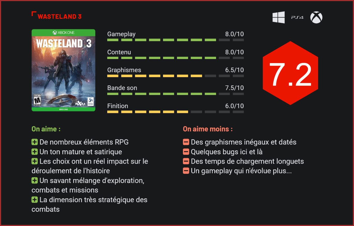 La licence initiée en 1988 revient une nouvelle fois d’entre les morts pour nous replonger dans un monde post-apocalyptique sans fioriture. Près de vingt plus tard, la magie est-elle toujours là ? Avant d’arpenter les routes dévastées de l’Arizona, revenons quelques pas en arrière, sur Wasteland premier du nom. Ce jeu vidéo de rôle a marqué les esprits à sa sortie en 1988 de par la qualité de son gameplay, mais également pour son cadre post-apocalyptique. Une pépite développée par le studio américain Interplay à qui l’on doit également la série Fallout. Seize ans plus tard, Wasteland a eu droit à une suite initiée par un nouveau studio de développement, inXile Entertainement, créé par le fondateur d’Interplay, Brian Fargo. En 2014, Wasteland 2 a vu le jour grâce à une campagne de financement participatif. Un concept qui a également permis de financer la suite, Wastland 3, 6 ans plus tard. Et après un léger retard lié à la pandémie de coronavirus, le jeu est enfin disponible sur consoles de salon et PC. Wasteland 3 prend la forme d’un tactical plutôt classique avec des éléments tirés des jeux de rôle. Wasteland 3 reprend tout ce qui a fait le succès de la série, notamment au niveau du scénario. On se retrouve donc une nouvelle fois du côté des Rangers, un groupe de paramilitaires de l’Arizona qui a survécu à la guerre nucléaire opposant les États-Unis à l’Union soviétique – même si cela, le jeu ne nous le dit pas. Tout ce que l’on sait c’est que nos Rangers sont en expédition pour se rendre dans le Colorado où la situation semble plus calme, malheureusement pour eux, cela ne se passera pas comme prévu. Le groupe de paramilitaire tombe en effet dans un piège et se fait presqu’entièrement massacrer. Cette première péripétie passée, nos Rangers se voient proposer de participer à la reconstruction ou plutôt au maintien d’une sorte de civilisation. Pour cela, ils devront rallier à leur cause toute une série de factions et éliminer celles qui se dresseront sur leur chemin. Massacres et tensions politiques sont bien évidemment au rendez-vous. Les joueurs des deux premiers volets ne seront donc pas perdus ici, le scénario de Wasteland 3 est du même ordre que celui du premier et second volet et ce n’est pas une mauvaise chose. Sa construction est plutôt complexe et s’adresse plutôt à un public aguerri tant il se veut brutal et satirique. La violence y tient une place de choix. D’ailleurs, en parlant de choix, le joueur aura l’occasion d’avoir un impact sur l’histoire puisqu’il devra choisir de se rapprocher de tel ou tel clan ou de mettre en rogne tel ou tel chef quitte à en subir les conséquences plus tard dans le jeu. Il faudra donc bien peser le pour et le contre avant de faire un choix, d’autant plus que vos actions auront un impact sur la réputation des Rangers auprès des habitants du Colorado, mais aussi des autres factions. Wasteland 3 s’éloigne du schéma dichotomique traditionnel puisque les choix qu’il propose ne sont pas ou tout blanc ou tout noir. En fonction du point de vue, on comprend les intentions des uns et des autres et le joueur devra jongler avec pour poursuivre ses propres intérêts, quitte à se mettre à dos certains personnages qui n’oublieront pas de si tôt sa trahison. Les choix du joueur ont un réel impact dans le jeu. Les choix ont un réel impact sur la suite de l’histoire. Wasteland 3 est un jeu de stratégie et de tactique, avec des déplacements par case au tour par tour et des points d’action limités. Il reprend également de nombreux éléments RPG, tant au niveau de l’histoire influencée par les choix des joueurs que du gameplay. Au début de son périple, le joueur devra choisir son duo de choc parmi une sélection très variée (amoureux punk, père et fille, mère et fils, technophiles, etc.) ou créer ses propres personnages. Le jeu se montre très généreux en termes de caractéristiques et de personnalisation. De plus, les duos qu’il propose sont plutôt atypiques et disposent de leur propre vécu et personnalité qui leur offriront des bonus. Une fois le choix de personnages fait, vous pourrez les améliorer au fur et à mesure de votre progression. Vous pourrez ainsi débloquer de nouvelles compétences, mais aussi augmenter leurs statistiques (conscience, force, vitesse, etc.) pour les rendre plus efficaces au combat ou lors de vos explorations. En renforçant telle ou telle compétence, le joueur pourra interagir avec des objets du décor ou des armes sur le champ de bataille. Il pourra en effet crocheter une serrure ou manipuler une tourelle ennemie pour la retourner contre ses propriétaires. En fonction de ses compétences et de leur niveau – ou de la spécialisation du personnage (corps-à-corps, sniper, brute épaisse, hacker) –, la progression ne se fera pas de la même manière, de même que passer certains obstacles. Les possibilités sont riches et variées, de quoi monter ses propres personnages en fonction de sa manière d’appréhender les combats et offre un joli potentiel de rejouabilité. Le joueur pourra également personnaliser son escouade en intégrant de nouveaux personnages à son duo de choc en fonction de leur spécialisation. Ainsi, vous pourrez faire face à n’importe quel imprévu. Le joueur pourra se déplacer grâce à des points d’action. Le joueur devra faire preuve de stratégie pour venir à bout de ses nombreux ennemis. Il devra utiliser ses points d’action avec sagesse pour attaquer, se défendre ou se cacher lors de son tour de jeu. D’ailleurs, pour éviter de ramasser des balles de partout, il faudra bien sélectionner l’action s’accroupir ou défense puisque se mettre derrière un obstacle ne sera pas suffisant. Les ennemis parviendront à vous toucher, même s’ils ne sont pas vraiment en mesure de le faire. À l’inverse, s’agenouiller sera particulièrement s