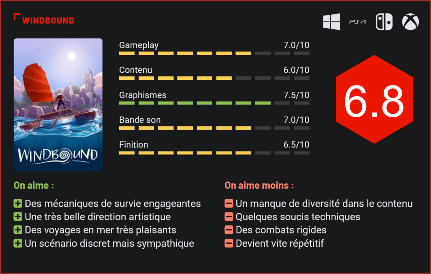 Le studio indépendant derrière Satellite Reign revient pour un second jeu dans un tout autre genre. Windbound est un savant mélange entre aventure, exploration, survie et rogue-lite. Windbound est un jeu d’aventure édité par Deep Silver et développé par 5 Lives Studios. Composé principalement de cinq vétérans de l’industrie vidéoludique, ce studio indépendant australien revient cinq ans après leur premier jeu pour nous proposer un titre qui ne manque pas de personnalité. Vous incarnez Kara, une jeune femme échouée sur une petite île inconnue suite au naufrage de son navire. En utilisant les ressources à disposition, vous devrez confectionner des outils, de quoi vous défendre face à la faune locale, trouver de la nourriture et surtout construire un bateau pour explorer les environs. Le jeu possède un univers et un scénario dont les détails seront délivrés de manière cryptique. Vous devrez percer les mystères d’une ancienne civilisation et leurs liens avec d’étranges créatures marines. Windbound bénéficie d’une direction artistique très plaisante. Le titre se découpe en chapitre, chacun étant composé d’une grande zone maritime où vous trouverez des petites îles remplies d’animaux et de ressources. Trois d’entre-elles abritent une tour qu’il faudra escalader pour trouver un mystérieux artefact. Une fois les trois artefacts activés, vous aurez accès à la suite du jeu. Il ne faudra cependant pas oublier de collecter tout un tas de matériaux et de ressources pour augmenter vos possibilités de jeux et améliorer votre confort grâce à un système de craft. Vous pourrez par exemple améliorer votre bateau, construire des armes de plus en plus sophistiquées, vous confectionner des vêtements pour obtenir différents avantages… L’exploration va être primordiale pour vous en sortir. Les animaux et créatures marines que vous croiserez ne seront pas les seuls dangers qui vous menacent. Kara possède une barre d’endurance qui indique aussi son niveau de faim. Plus le temps passe, plus la longueur maximale de la jauge diminue, et lorsqu’elle atteint zéro, c’est la barre de vie qui diminue. Prendre le temps d’explorer sera bénéfique puisque vous pourrez y trouver plus d’objets, mais devient également un risque à considérer. Il faudra donc faire attention à vos provisions ainsi qu’au temps que vous prenez pour parcourir les îles. Si les déplacements du personnage et l’exploration sont en général très agréables, les combats sont un peu rigides. Fort heureusement, ceux-ci ne représentent qu’une petite partie du jeu, et le reste est tout à fait réussi. En particulier l’exploration maritime et les quelques phases entre les chapitres où il faudra batailler avec le vent et les vagues. Un autre élément à prendre en compte sera la difficulté que vous devrez choisir en début de partie. Le mode principal est le mode “survie” qui amène un côté rogue-lite à l’expérience. Dans cette difficulté, la mort de votre personnage signifie la perte de la majorité de vos trouvailles mais surtout un retour au tout début du jeu. L’autre mode de difficulté est un mode “histoire” qui ne vous pénalisera que très peu lors de vos morts et vous laissera l’entièreté du contenu de votre inventaire. Seul réelle sanction après une mort, nous revenons au début du chapitre et devons reprendre l’exploration à zéro. Dans les deux cas, à chaque nouveau chapitre et à chaque nouvelle mort, les îles que vous visiterez seront différentes puisqu’elles sont toutes générées aléatoirement. Leurs tailles, leurs formes et les ressources et créatures que vous y trouverez ne seront pas toujours les mêmes. Naviguer sur les mers représente une partie significative du jeu. On peut cependant constater que nos trouvailles ne sont pas très variées, il faudra atteindre les derniers chapitres pour trouver tout un tas de nouvelles ressources et recettes de craft. Un problème qui rend le jeu plutôt répétitif, en particulier en début de partie où les possibilités ne sont pas très larges et où les crafts restent assez basiques. En ligne droite, il faudra entre cinq et six heures pour voir le bout de l’aventure. Prendre le temps d’explorer et recommencer le jeu pour profiter de son aspect aléatoire augmentera considérablement cette durée de vie. Le problème étant que le jeu ne réserve au final que peu de secrets sur les différentes îles, la durée du vie du titre s’en voit impactée. Là où Windbound se démarque, c’est également grâce à son univers très charmant et à son ambiance soignée, sans doute inspirée de The Legend of Zelda: Breath of the Wild. Le jeu est particulièrement joli à regarder. Sa direction artistique est très efficace et ses jeux de lumières rendent certains environnements tout bonnement magnifiques. La bande-son n’est pas en reste non plus puisqu’elle propose de très jolis morceaux. La version PS4 souffre malheureusement d’un framerate inconstant. Celui-ci chutera rarement en dessous de 30 images par secondes, mais ces différences restent perceptibles. Conclusion Windbound est un jeu de survie possédant des éléments de rogue-lite maîtrisés. Grâce à un système de jeu engageant et reposant sur la prise de risque, le titre nous incite à explorer les différentes îles qui composent ses espaces ouverts. Si les combats sont un peu rigides, le reste de l’expérience est plus maîtrisé, en particulier les voyages en mer. Le titre manque malheureusement de contenu puisqu’on fera vite le tour des crafts et matériaux à collecter. Ce manque de diversité impacte la durée de vie du titre qui ne nous donnera pas forcément envie d’y rejouer de nombreuses fois. Sans doute inspiré par des titres tel que The Legend of Zelda: Breath of the Wild, le nouveau jeu de 5 Lives Studios possède un univers charmant et un scénario un peu cryptique mais 