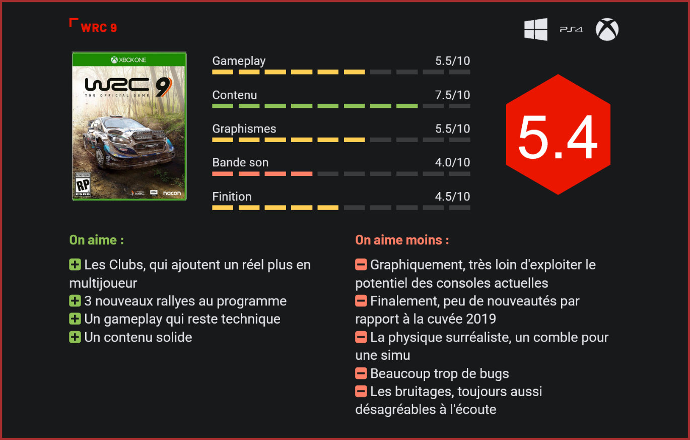 Après les grands chantiers de l’an dernier, il ne fallait probablement pas en attendre beaucoup de cette suite, qui se contente de quelques retouches sur l’édition 2019. Après le rachat de la licence WRC par Codemasters, qui nous livrera son premier jeu WRC en 2023, il était évident que Nacon n’allait plus vraiment investir dans la franchise. Le studio Kylotonn est après tout déjà bien occupé sur plusieurs projets. Et WRC 8, à défaut de mettre tout le monde d’accord, était parvenu à fédérer une petite communauté de joueurs. L’édition 2020 n’allait très clairement pas apporter de grands chambardements. Et cette théorie se confirme aujourd’hui. On retrouve les mêmes contrôles, le même moteur graphique, les mêmes spéciales et le même mode carrière, avec quelques très légères nouveautés au niveau du contenu. On retrouve tous les circuits de l’édition 2019. Au programme donc de cette cuvée 2020 : trois nouveaux rallyes, quelques nouveaux bolides ainsi que quelques petites nouveautés pour le multijoueur. Et il faut bien l’avouer, les quelques petites nouveautés au niveau du contenu font leur effet. Le Kenya et ses vastes espaces colorés ajoutent une touche d’exotisme au line-up du jeu. Le Japon et ses étroites ruelles à flanc de montagne apportent un peu plus de diversité aux tracés. La Nouvelle-Zélande propose quant à elle un environnement plus classique, mais pas dénue de charme, avec ses tracés très techniques. Mine de rien, cela porte à plus de 100 le nombre de spéciales disponibles, dans une douzaine de locations au total. A ce niveau, le jeu remplit plutôt bien son contrat, même si encore une fois, toutes les destinations ne sont pas au même niveau. 15 bolides historiques rejoignent également la grille de départ. De la Lancia Stratos à la Focus 2007 en passant par l’Alpine A110 et la Porsche 911 GT3 RS, les amateurs de belles mécaniques en auront pour leur argent dans ces épreuves spéciales qui les mettront au volant de très jolies cylindrées. Les sensations sont ici très différentes de celles que l’on peut ressentir au volant des bolides du WRC, avec souvent une conduite beaucoup plus technique, qui va de pair avec la vétusté des machines. Au niveau des modes de jeu, on retrouve cette année une grande nouveauté, les Clubs. Avec ceux-ci, les joueurs peuvent créer leurs propres championnats et les partager avec les autres joueurs. La véritable originalité vient du fait qu’il est possible de souscrire à plusieurs clubs et d’affronter ainsi tout un tas de joueurs différents sur des spéciales pour comparer ensuite les performances dans les leaderboards. Le concept est séduisant, même si au final, tout le monde joue en différé. D’autres nouveautés seront ajoutées ultérieurement avec de nouvelles spéciales pour la Finlande et le Portugal, un mode Photo et un mode Copilote. Le Kenya fait partie des nouvelles destinations. Pour ce qui est du reste, WRC 9 est une copie conforme de son ainé. On retrouve les mêmes qualités et les mêmes défauts que dans la cuvée 2019. Le mode solo est solide avec un mode Carrière qui place le joueur à la direction d’une écurie. Il faudra gérer l’agenda, le recrutement des spécialistes (météorologues, kiné,…), l’acquisition de nouvelles compétences, les paiements… C’est amusant et plutôt bien fichu, même si au final ça n’apporte pas grand chose de plus à l’expérience de jeu. La structure du jeu reste très classique. Chaque tournoi est composé de 4 spéciales, entrecoupées par une séance durant laquelle le joueur pourra faire réparer son véhicule. Simu oblige, il n’y a pas de rembobinage possible et le joueur pourra recommencer un parcours au maximum 4 fois. Comme dans WRC 8, il faudra veiller en plus de remporter les spéciales, à remplir les objectifs de course et de saison pour satisfaire son écurie. Le Japon fait également partie des nouvelles destinations. Côté gameplay, rien ne change non plus. WRC 9 est beaucoup plus orienté simu que WRC 7 et les précédents volets de la saga. Les sensations de vitesse sont là et la technicité apporte un réel plus mais les bugs sont nombreux, le comportement du véhicule parfois totalement surréaliste et la physique complètement larguée. Ce qui est tout de même un peu dingue pour une simu. Alors oui, il y a matière à s’amuser et oui le jeu sait se montrer à la fois fun et exigeant, mais on aurait vraiment aimé que les développeurs retravaillent certains aspects de la prise en main. C’est d’autant plus dommage que WRC 8 avait déjà apporté son lot de chouettes petites nouveautés côté gameplay, avec les conditions météorologiques dynamiques, qui rendaient les courses encore plus immersives et des replays de qualité. Côté réalisation, rien n’a changé non plus. Le jeu a beaucoup vieilli visuellement et est à des années lumières des performances d’un Dirt. Les décors sont souvent laids et ternes. Les modélisations des véhicules sont en revanche très réussies et quelques jolis effets visuels jouent brillamment les cache-misères. On aurait aimé que les développeurs prennent le temps pour revoir leur copie… mais visiblement, ce n’était pas dans la liste des priorités pour cette année. Conclusion Avec WRC 9, Nacon nous livre une mise à jour très avare en nouveautés pour sa simulation de rallye. La cuvée 2020 introduit trois nouvelles destinations aux charmes exotiques. Destination le Japon, le Kenya et la Nouvelle-Zélande. On retrouve en parallèle 15 nouveaux véhicules historiques et un nouveau mode de jeu très séduisant pour la communauté, dans lequel les joueurs pourront comparer leurs performances sur les spéciales. Et c’est à peu près tout. Si le contenu est un peu plus généreux, l’esthétique du jeu, sa bande son et le gameplay n’ont pas été retouchés. Le jeu hérite donc des mêmes défauts et qualit