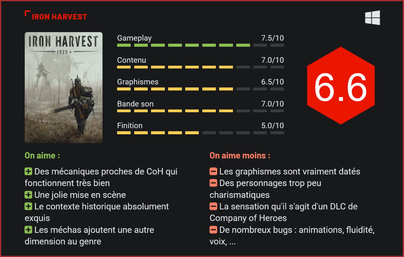 Directement adapté du jeu de plateau Scythe, Iron Harvest débarque enfin sur consoles et PC avec de jolies promesses. En s’attaquant au genre RTS, le jeu se confronte immédiatement à un mastodonte, Company of Heroes, en voulant rouler sur ses plates bandes. Est-il pour autant capable de se hisser au niveau d’une saga qui a obtenu ses lettres de noblesse il y a presque 15 ans ? Les adaptations de jeux de société en jeux vidéo ou vice-versa n’ont que très rarement eu énormément de succès. Monopoly ne fonctionne réellement bien que sur une table entre amis ou en famille, tandis qu’il est plus plaisant d’arpenter le monde virtuel d’Azeroth dans WoW que sur sa version cartonnée. Il arrive néanmoins que certains titres fassent leur trou et réussissent sans mal la conversion vers l’autre “genre”. Scythe fait partie de ceux-ci, avec un univers qui se prête d’ailleurs extrêmement bien aux jeux vidéo. Créé par Jamer Stegmaier, un Américain féru de jeux de société, Scythe est ce que l’on peut littéralement appeler une pépite dans le monde du jeu de table. Avec un univers plutôt original, le jeu se penche sur la confrontation entre les Poloniens et les Rusviétiques durant l’entre-deux-guerres. La Première Guerre Mondiale n’est pas celle que nous avons connue : dans cette réalité alternative, des immenses robots de métal se sont combattus aux côtés des hommes, augmentant considérablement les pertes humaines. Dans les campagnes, la récolte de fer a débuté, et ce afin de subvenir à la fabrication des méchas. L’Europe panse ses plaies, tandis qu’une nouvelle menace soviétique plane sur le Vieux Continent. La trame scénaristique est semblable en tous points dans la version vidéoludique de Scythe. C’est d’ailleurs la grande qualité de cet Iron Harvest, le contexte profite au genre et aux mécaniques. L’ambiance se ressent parfaitement bien sur chaque champs de bataille. Des mélodies qui retranscrivent parfaitement l’ambiance aux voix très justement adaptées aux personnages, l’ensemble offre une très belle harmonie. Les méchas font presque à eux seuls le charme du jeu. Outre cette très jolie ambiance, Iron Harvest dispose d’un “bestiaire” très bien fichu. Aux traditionnelles unités que sont les grenadiers et fusiliers, s’ajoutent les méchas. Dans ces années 20 revisitées, les tanks et autres chars d’assaut n’existent pas et sont remplacés par d’immenses soldats de fer. Avec des compétences et attaques qui leur sont propres, ceux-ci parviennent sans mal à renouveler le genre, voire à apporter une toute autre dimension aux RTS. L’issue d’une bataille se verra très vite modifiée grâce à ces robots. Monter une armée uniquement composée de méchas peut vous être bénéfique, mais sera également à double tranchant. En effet, certaines unités sont particulièrement efficaces contre ces unités blindées. Il sera ainsi primordial de composer votre armée de manière réfléchie et stratégique. Néanmoins, on reprochera à Iron Harvest de se reposer trop souvent sur ses lauriers, ou plutôt sur ceux des autres. En s’inspirant très librement de ce qu’a auparavant fait la célèbre franchise Company of Heroes, IH est sûr de profiter de mécaniques qui ont fait leurs preuves. Malheureusement, au lieu de récupérer quelques idées par ci et là et de les améliorer, Harvest se contente ici de faire un simple copier/coller. A tel point qu’on se demande parfois s’il ne s’agit pas d’un DLC issu de la saga CoH. Les unités humaines traditionnelles sont directement récupérées de la franchise de SEGA. Par exemple, les soldats du génie permettent ici aussi de construire les bases de votre état-major sur le champ de bataille. Le quartier général donne accès aux unités de base, tandis que la caserne offre une plus grande variété d’hommes. Enfin, petite particularité liée au titre, l’atelier vous sert à fabriquer les différents méchas destinés à se battre ou à la reconnaissance. Chacune des unités possède d’ailleurs ses propres capacités et compétences. Après avoir été utilisées, celles-ci doivent se recharger durant un certain temps, qui peut parfois se révéler plutôt long en combat. Le jeu dans sa globalité ressemble plus à un DLC de Company of Heroes qu’à un titre différent. Bien aménager son QG est primordial dans la conquête de la victoire. Il faudra également négocier avec les différentes ressources parsemées sur le champ de bataille. Au nombre de deux, ces ressources sont capitales pour espérer empocher la victoire. Le fer et le pétrole sont nécessaires à l’ensemble des unités et bâtiments, et en manquer peut se révéler préjudiciable pour votre bataille. Vous affronterez les unités ennemies afin de prendre le contrôle de ces puits et gisements, et ainsi amasser le plus de ressources possibles. C’est une fois que votre base sera établie que vous pourrez vous attaquer aux missions. Et force est de constater que sur ce point, Deep Silver s’est encore une fois permis de puiser chez la concurrence. Les objectifs sont presque en tous points semblables à ceux de Company of Heroes. Tantôt vous devrez vous préparer à subir les vagues ennemies, tantôt l’objectif sera de prendre plusieurs points de contrôle. Il faudra aussi parfois secourir un village entier ou un personnage en particulier, mais cela ne suffit pas à diversifier le tout. Il est vrai que l’ensemble fonctionne toujours aussi bien, mais on regrettera que les développeurs n’aient pas fait preuve de plus d’imagination. Les champs de batailles où s’entretuent hommes et méchas sont de vraies parties de plaisir. Malgré cet esprit très “Company of Heroesien” présent dans chacune des mécaniques d’Harvest, le tout fonctionne très bien. Le champ de bataille propose une action de tout instant, et les affrontements entre unités sont assez nerv