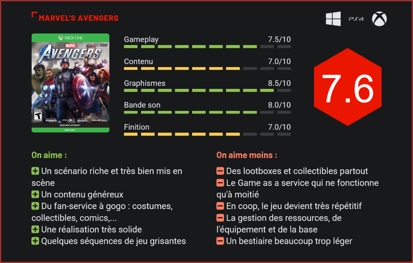 Quatre longues années. C’est le temps qu’il aura fallu pour Square-Enix et Crystal Dynamics pour peaufiner cet ambitieux projet d’adaptation des Avengers sur consoles. Parmi les jeux attendus en ce mois de septembre, Marvel’s Avengers figurait sans aucun doute tout en haut de la liste des titres les plus plébiscités par les joueurs. Il faut dire que Square-Enix avait vu très grand pour cette adaptation de la plus célèbre des franchises de Marvel Comics, en confiant le jeu à Crystal Dynamics, le studio qui se cache derrière les Tomb Raider. Fruit d’un labeur de plusieurs années, le projet aura subi plusieurs reports. Au total, quatre studios ont collaboré à sa création, sur une période de quatre ans. Un budget pharaonique pour l’éditeur, qui entend bien rentabiliser son investissement… La séquence d’intro en met plein les yeux. Pour cette raison, le jeu a été pensé comme un titre-services. Un peu à la manière d’un Destiny puisqu’il comprend à la fois une campagne solo et une campagne coop. L’aventure solo est à ce sens plutôt une bonne surprise, puisqu’elle parvient à surprendre avec une approche qu’on n’attendait pas du tout pour le genre, et un scénario original. On notera toutefois d’entrée de jeu qu’il n’est pas question ici d’une adaptation du MCU, Square-Enix ayant choisi de repartir de zéro. L’approche est intéressante, car elle donne justement une autre vision des héros que l’on a côtoyés des années dans le Marvel Cinematic Universe. Bien sûr, il faudra quelque temps pour s’habituer à leur nouveau look – qui ne diffère en réalité pas énormément de celui des acteurs. Globalement, le character-design est très réussi, sauf peut-être pour ce qui est de Black Widow, un poil en retrait par rapport aux autres personnages. La personnalité des rôles principaux est également beaucoup plus fidèle aux personnages des comics que dans le MCU. Mieux, Square-Enix n’a pas hésité une seconde à introduire des personnages que les fans du MCU ne connaissent pas encore : Modok dans le rôle du grand vilain mais aussi et surtout Ms. Marvel, alias Kamala Khan. C’est d’ailleurs elle que vous incarnerez principalement dans l’aventure solo, qui offre une solide durée de vie. Comptez 11h environ en ligne droite. 20 en prenant le temps de faire quelques missions secondaires et jusqu’à 30h pour les complétionistes. Vous incarnerez principalement Kamala Khan dans l’aventure solo. Le jeu n’hésite pas non plus à jouer la carte du fan-service. Le début de l’aventure démarre avec une mission un peu particulière puisque l’on y incarne Kamala, encore enfant, qui est venue visiter un fan-fair dédiée aux Avengers. Elle y collecte des comics, participe à des mini-jeux et partage sa passion pour ses superhéros préférés, jusqu’à un terrible accident qui renverse complètement la balance de l’ordre mondial. Le vaisseau du SHIELD explose, Captain America est mort, les autres superhéros sont traqués par les autorités. Kamala et les autres personnes présentes sur place héritent de pouvoirs supernaturels. Ils deviennent les “Inhumains” et sont traqués à leur tour par le gouvernement qui les considère comme un danger pour la sécurité nationale. Cette seconde séquence nous est narrée du point de vue des Avengers avec une intro explosive, qui montre tout le potentiel du jeu. Flash forward, quatre ans plus tard, à nouveau dans la peau de Kamala – et cette fois pour un bon moment, car comme nous l’avons dit, le jeu nous présente l’histoire de son point de vue. L’approche est intéressante puisqu’elle nous permet de faire connaissance avec un superhéros relativement méconnu des fans de comics, à la personnalité intéressante d’ailleurs puisque Kamala est une jeune femme fille d’immigrés, d’identité musulmane, parfaitement intégrée à la société américaine. Elle a des valeurs familiales, mais comme beaucoup d’ados, a très peu confiance en elle. Elle nourrit aussi un culte pour Captain Marvel et les Avengers, qu’elle considère comme des héros. D’un point de vue narratif, Marvel’s Avengers est une formidable réussite. Le jeu ose une approche très audacieuse de l’univers des Avengers en plaçant le joueur dans la peau d’un nouveau superhéros avec qui on finit par créer un lien. La personnalité de Kamala est très bien explorée et la montée en puissance du personnage et de l’aventure très bien retranscrite. Il est toutefois difficile de ne pas être un peu déçu par le fait que tous les autres superhéros passent complètement au second plan. Durant l’aventure principale, vous jouerez une dizaine de missions dans la peau de Kamala, une ou deux seulement dans la peau de Black Widow, Iron Man, Hulk, Captain America et Thor… Des personnages qui sont pourtant beaucoup plus intéressants à jouer. Thor est l’un des personnages du jeu les plus grisants à jouer. Si d’un point de vue narratif, le jeu frôle la perfection avec des dialogues très bien écrits, de nombreuses cut-scenes et un scénario passionnant à suivre de bout en bout, on ne peut pas s’empêcher de regretter que les Avengers ne tiennent au final qu’un aussi petit rôle dans le jeu qui leur est dédié. On notera d’ailleurs que l’aventure principale mélange des séquences de jeu très variées avec un peu d’infiltration, beaucoup de plates-formes, des combats de masse mais plutôt vers la fin, quelques courses-poursuites et bien sûr de l’exploration. Le premier tiers du jeu aurait très bien pu être l’une des nouvelles aventures de Lara Croft tant les similarités entre Lara et Kamala se font ressentir dans le gameplay. On bondit dans les airs, s’accroche à une branche pour sauter en direction d’une autre plate-forme… On ramasse des tas de collectibles planqués dans les niveaux, on ouvre des coffres et on affronte occasionnellement quelques ennem