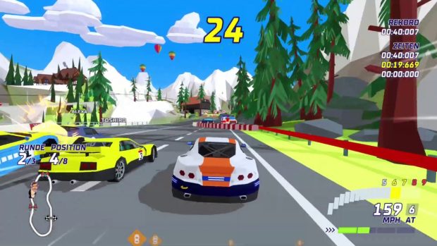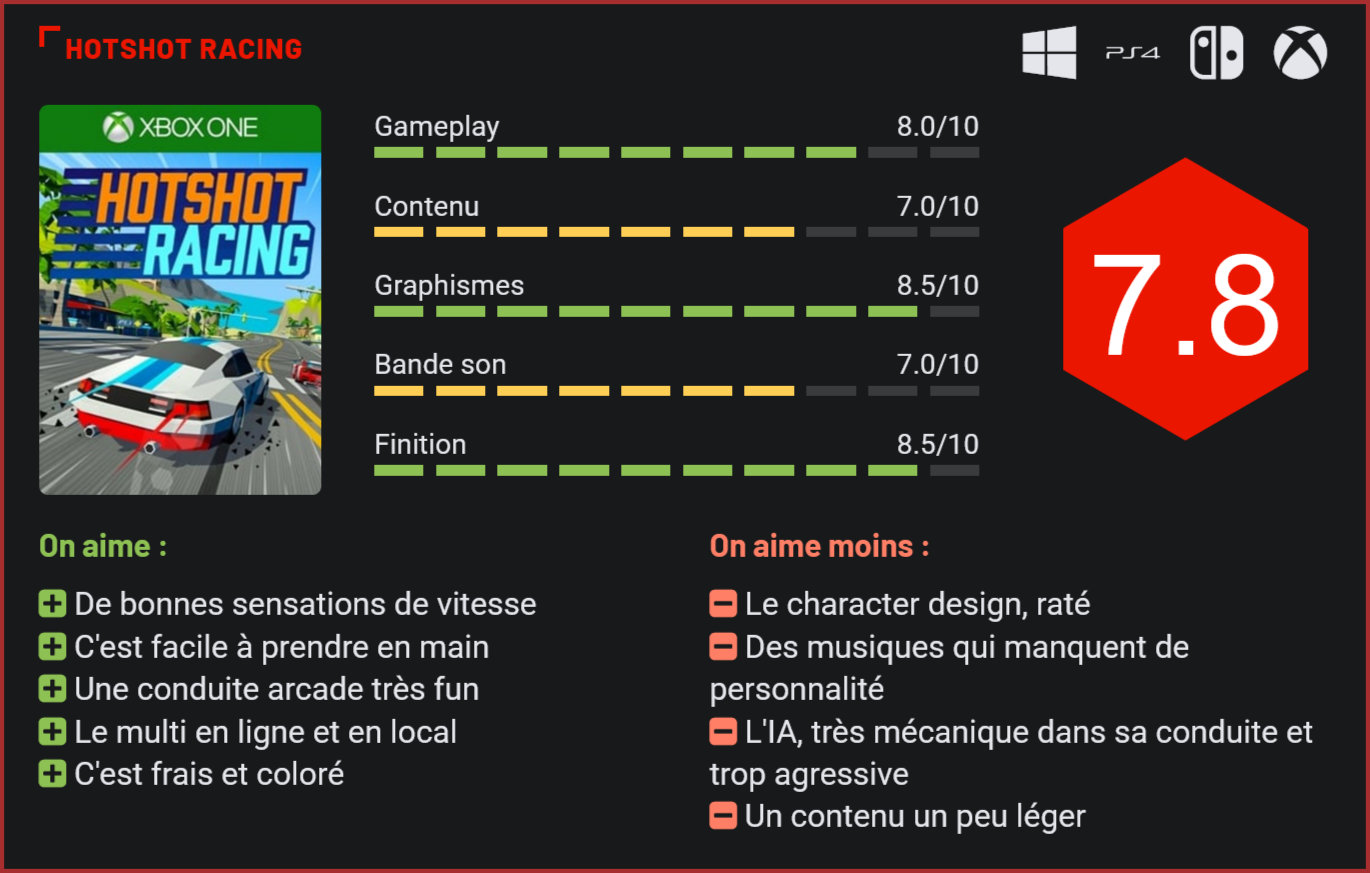 Le nouveau jeu de Sumo Digital surfe sur la vague des jeux de courses arcade des années 90, en s’inspirant assez ouvertement des Outrun et autres Virtua Racing. Les créateurs d’Outrun 2 et de Sonic & SEGA All-Stars Racing sont de retour sur la scène des jeux de course arcade avec un nouveau projet qui répond au nom d’HotShot Racing. Un projet totalement indépendant cette fois, qui surfe sur la vague des “arcade racers” des années 90 avec un style graphique très proche de celui d’un Virtua Racing. C’est un peu la nouvelle mode. Le joli succès d’Horizon Chase semble avoir convaincu des tas de studios qu’il existait encore un marché pour les jeux de course arcade old-school. Et sans surprise, c’est le studio britannique Sumo Digital qui a répondu au chant des sirènes en dévoilant un nouveau projet délicieusement old-school. Le jeu est très coloré. Difficile de ne pas penser à Virtua Racing dès la première course, même s’il est vrai qu’au niveau de la conduite, Hotshot Racing se rapproche davantage d’un Ridge Racer avec ses multiples drifts qui servent à venir recharger la jauge de turbo. Visuellement, le jeu tire très clairement son inspiration d’un Virtua Racing avec son style rétro-pixelisé et ses décors très colorés. Un style qui ne passe pas inaperçu. Malgré son statut de jeu à petit budget, HotShot Racing nous en met plein les yeux avec ses décors qui fourmillent de détails, ses jolies animations et son rythme effréné. Alors certes, ce n’est pas la claque de l’année, mais pour une petite production indépendante, le résultat est franchement impressionnante. D’autant plus qu’on n’a pas vu un bug à l’horizon ni assisté à aucune baisse de framerate. Les décors font voyager. Niveau réalisation technique, le studio britannique fait presqu’un sans faute. Presque, car les menus restent très sobres et le character design des pilotes est absolument immonde. On ne les voit pas ailleurs que dans les menus – ce n’est donc pas bien grave, mais il s’agit toutefois des petits détails qui font toute la différence. Côté conduite, Hotshot Racing se révèle très accessible tout en se montrant également très exigeant. S’il n’est finalement pas bien difficile de décrocher les médailles d’or dans le solo, en mode normal, les décrocher en mode expert vous forcera à vous relever les manches… Car dans Hotshot Racing, il faudra non seulement maîtriser la direction de son véhicule mais aussi l’art du drift. Sans lui, pas de turbo. Chaque virage est donc le justificatif parfait pour exécuter un joli drift – le plus long et le plus large possible, pour emmagasiner un maximum de points si possible. Le turbo vous permettra ensuite de prendre le large. A quatre c’est encore plus fun! On pourra reprocher à HotShot Racing la relative simplicité et sobriété de ses tracés. Très clairement, son style de conduite très arcade aurait parfaitement collé avec des tracés plus fous-fous, des tremplins ou des dénivelés. Il faudra se contenter ici d’une poignée d’environnements et d’une quinzaine de tracés en tout. Si on retrouve une belle diversité dans les courses, avec des décors champêtres, urbains, désertiques et côtiers, on regrette tout de même que le contenu du jeu ne soit pas plus fourni. D’autant plus que le mode solo se résume ici principalement à une succession de quatre championnats sans aucun lien entre eux… Cela reste assez léger au vu du prix du jeu, facturé 19,99€. La bonne nouvelle, c’est que les différents modes de jeu donnent suffisamment d’intérêt au titre pour qu’on y revienne encore et encore… Tout d’abord parce qu’HotShot Racing propose du multijoueur en local (jusqu’à quatre) et en ligne. Ensuite, parce qu’à côté des courses classiques, on retrouve des modes de jeu plus originaux comme le mode “Drive or Explode”, dans lequel la vitesse minimale autorisée augmente progressivement pour éliminer les joueurs trop lents, ou le mode “Cops & Robbers”, qui s’apparente à un mode survie – les pilotes ayant ici un certain nombre de points de vie qu’ils perdent au fil des collisions avec les voitures de police lancées à leur poursuite. Une fois éliminés, ils prennent les commandes d’une voiture de police pour tenter d’arrêter leurs concurrents. C’est fun et entre amis on s’y amuse franchement bien! Plusieurs vues sont au programme. Très divertissant, le jeu n’en reste pas moins un poil frustrant en solo. En mode normal, la conduite des opposants paraît beaucoup trop artificielle. Il est pratiquement impossible de se laisser distancer, comme si les opposants étaient retenus dans leur lancée lorsque vous vous trouvez en difficulté… En difficile, leur comportement est hyper-agressif, au point de vous envoyer régulièrement en tête à queue… On aurait aimé retrouver un juste milieu. Le jeu manque également d’un chouilla de profondeur dans sa conduite. On aurait aimé là aussi des circuits un peu plus techniques. Le plus gros défaut du jeu reste toutefois sa bande-son. Les musiques sont rétro mais manquent cruellement de charme et d’entrain. On sent la vibe Outrun 2, mais on a très clairement l’impression que les développeurs manquaient de budget ou d’idées… Ceci étant dit, ne boudons pas non plus notre plaisir. Hotshot Racing reste un jeu de course arcade très fun et très rafraîchissant, idéal pour pimenter des soirées entre amis et proposé à un tarif finalement compétitif. Tout n’est pas parfait, mais il y a de quoi passer un très bon moment en sa compagnie. Conclusion Surfant joliment sur la vague nostalgique, Hotshot Racing est un jeu de course arcade très fun qui nous rappelle Virtua Racing pour sa direction artistique et s’inspire assez ouvertement d’un Outrun ou d’un Ridge Racer pour sa prise en main, essentiellement basée sur l’art du drift et l’usage du turb