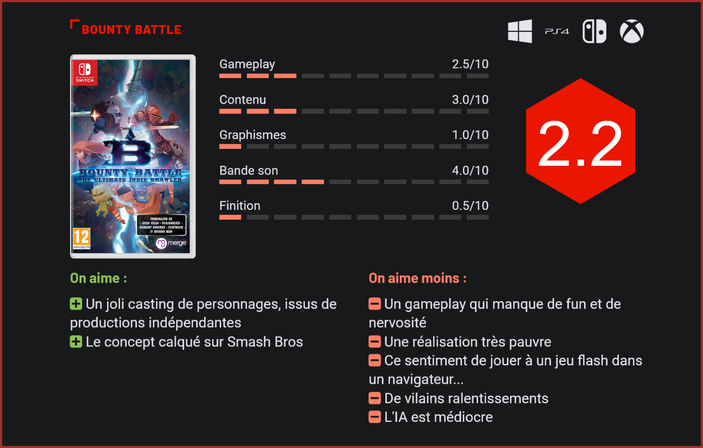 Attendu comme le messie par certains joueurs, qui espéraient découvrir enfin une alternative aux jeux de baston made in Japan, Bounty Battle débarque sur pratiquement tous les supports du marché, sous les huées du public. Explications. Si l’éditeur Merge Games nous aura très agréablement surpris à plusieurs reprises, toutes ses productions ne sont pas forcément des bonnes pioches. Et c’est notamment le cas de ce Bounty Battle que de nombreux joueurs attendaient avec impatience. Lors de son annonce, le jeu était parvenu à faire parler de lui, et pour cause puisqu’il s’agit d’un jeu de baston indépendant qui réunit un très joli casting de personnages tirés de multiples franchises. On retrouve les héros de jeux emblématiques comme Guacamelee, Owl Boy, Axiom Verge, Awesomenauts, Steamworld Dig ou Blasphemous. Le gameplay du jeu est quant à lui directement inspiré de Smash Bros. On n’a donc pas affaire ici à un “vrai jeu de baston” mais plutôt un Smash Bros-like dans lequel le but n’est pas tant de mettre K.O. ses adversaires mais de les bouter hors de l’espace de jeu. Après un certain nombre de revives, l’adversaire est vaincu. Autre particularité : les combats se jouent à quatre. Le concept était très séduisant sur le papier. Dans la pratique, le résultat est malheureusement désastreux. Tout d’abord parce qu’au niveau de la réalisation technique, on a l’impression de jouer à un jeu flash sur un navigateur. Les modèles 2D des personnages sont réussis, mais les niveaux manquent de caractère, de détails et de profondeur. Les effets visuels sont également franchement très laids. Alors certes, on est face à une petite production indépendante, mais tout de même… L’autre très gros défaut du jeu, c’est sa finition désastreuse. Les ralentissements sont nombreux et viennent véritablement gêner le joueur dans les combats. De surcroît, il n’est pas rare que l’on soit confronté à l’un ou l’autre bug… Côté gameplay, ce n’est guère plus reluisant. Les bases sont une fois encore très bonnes, mais la finition désastreuse. Les coups sont mous, le rythme de jeu est lent, ca manque de nervosité et de fun et si l’on a droit à une jolie palette de coups, on se contente très souvent de spammer un seul bouton – même si cette pratique fera perdre des crédits au joueur. Lors des ralentissements, on n’a tout simplement pas le choix pour survivre. Comme nous l’avons dit plus haut, les latences sont nombreuses, et durent parfois plusieurs secondes. Il devient dès lors pratiquement impossible de répondre correctement à l’attaque de son adversaire. Au niveau des modes de jeu, on retrouve un mode tutoriel plutôt réussi pour apprendre les bases du gameplay, mais pas de vrai mode solo. Il faudra se contenter d’une succession de défis aux commandes d’un personnage qu’on ne peut pas choisir. Il faudra tantôt survivre à des vagues d’ennemis, tantôt pousser ses opposants hors du ring. Le concept est sympa, mais on en fait vite le tour… Le jeu manque de modes alternatifs. On peut toutefois bien sûr s’affronter en duel mais là aussi, les ralentissement viennent jouer les trouble-fête. Vous l’aurez compris : en l’état, le jeu n’est tout simplement pas jouable. On l’espère, les développeurs proposeront un patch pour corriger ces nombreux problèmes techniques… Ceci étant dit, on voit mal comment Bounty Battle pourrait s’imposer comme un grand jeu de baston même sans ces problèmes techniques… Le contenu reste léger, la réalisation très cheap, et le jeu manque cruellement de fun. Tout au plus y jouera-t-on pour avoir le plaisir de réincarner certains de ses personnages favoris. Il est au final bien dommage que ceux-ci apparaissent dans un titre aussi décevant. Le pari était osé pour le petit studio français Dark Screen Games, qui a sans doute eu un trop gros appétit… Dommage, car il y avait réellement un potentiel. Merge Games semble d’ailleurs avoir bien compris que son jeu aurait du mal à se vendre puisque le titre est facturé une vingtaine d’euros seulement… Conclusion Si le concept avait de quoi séduire, Bounty Battle peine à convaincre, la faute à une réalisation très pauvre et une finition abominable. Ambitieux, le petit projet du studio français Dark Screen Games jouait dans la même cour qu’un Smash Bros, en proposant des affrontements à quatre dans une arène. L’objectif ici n’est pas tant de mettre K.O. un adversaire mais de le pousser hors du ring. Niveau casting, on retrouve une belle brochette de personnages emblématiques issus de diverses productions indépendantes comme Blasphemous, Owl Boy ou Guacamelee. Un casting de rêve qui se retrouve malheureusement piégé dans une production qui manque cruellement d’envergure. Tout dans Bounty Battle déçoit : de son gameplay mou et pauvre à sa réalisation minable en passant par ses nombreux ralentissements qui le rendent pratiquement injouable. Le plus triste dans tout ça, c’est que même un très gros patch n’en fera pas un bon jeu…