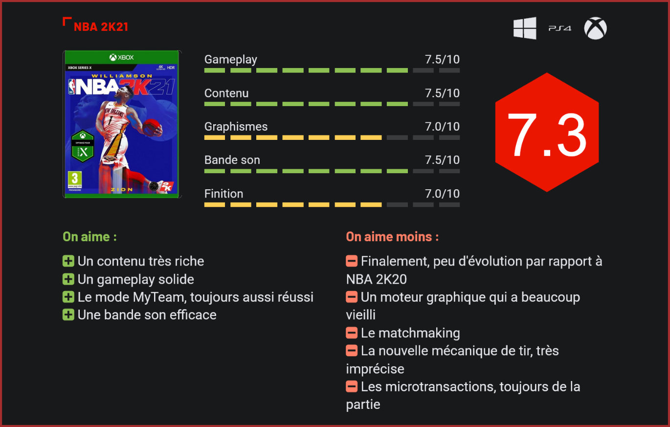 Sous le feu des critiques en 2019 suite au raz de marée de microtransactions qui avaient fait leur apparition dans le jeu, NBA 2K nous revient aujourd’hui avec quelques petites nouveautés. Que les fans se le disent toutefois d’entrée de jeu : NBA 2K21 ne change pratiquement pas la formule de son ancêtre… Avec la crise de la covid, il était évident que plusieurs gros jeux souffriraient soit de reports, soit d’un manque de finition. Visual Concepts a choisi de ne pas repousser la sortie de son jeu de basketball malgré la crise, laissant clairement sous-entendre aux fans qu’il ne fallait pas s’attendre à une révolution cette année. Et ce, d’autant plus que NBA 2K21 fera le pont entre deux générations de consoles… Les habitués l’auront remarqué dès la première partie, NBA 2K21 est très léger en nouveautés. Esthétiquement, le jeu n’a pas évolué. C’est le même moteur graphique que pour l’épisode 2K20. Les microtransactions sont toujours là. Du côté du contenu, on retrouve également un contenu pratiquement identique à la cuvée 2K20. Alors oui, bien entendu, les nouveaux venus découvriront un formidable jeu de basket, généreux en contenu et très fun à jouer, mais en termes de nouveautés, on est plus proche d’une mise à jour que d’un réel nouvel épisode. Le jeu repose pratiquement entièrement sur le mode MyCareer, très solide. Dans celui-ci, le joueur incarnera le fils d’un basketteur célèbre qui débute sa carrière avec l’espoir d’atteindre le sommet. Les premiers matchs se jouent au lycée avant de rejoindre la NBA. La formule fonctionne vraiment bien, mais presque rien n’a changé. On retrouve à côté une pléthore d’autres modes de jeu, dont MyGm, qui vous met aux commandes d’une équipe complète, mais aussi MyLeague, qui vous permet cette fois de prendre le contrôle de la ligue toute entière. Bien sûr, il est aussi possible de lancer une partie rapide ou d’affronter un adversaire humain. Les nouveautés sont très légères à tous les niveaux, mais ont le mérite d’exister. On retrouve un peu plus de personnalisation des joueurs, de nouveaux objectifs saisonniers pour MyTeam, certaines cartes peuvent être fusionnées, le décor du hub central a aussi changé et offre un cadre plus coloré, mais dans l’ensemble, l’expérience est pratiquement la même. Les défauts aussi… Le matchmaking reste très hasardeux, avec des parties souvent déséquilibrées. Les micro-transactions sont partout également, comme dans NBA 2K20. La monnaie virtuelle permet aux joueurs d’améliorer et customiser son personnage. Dans NBA 2K21, il existe plusieurs monnaies virtuelles qui se gagnent au cours des parties… De façon générale, il faudra être patient pour faire le plein… et progresser dans le jeu! Pas de pay to win mais un pay to move on agaçant, tant les gains sont réduits à l’issue de chaque match. Les achats intégrés sont très fort mis en avant. A un tel point que cela en devient gênant. Autre politique désastreuse de 2K : il faudra impérativement opter pour la version la plus chère du jeu pour avoir droit à un upgrade sur next-gen. C’est un détail, mais c’est important de le préciser pour ceux qui souhaiteraient y jouer aussi sur PS5 et XSX… Le jeu en vaudra-t-il la chandelle? Difficile à dire pour le moment, d’autant plus que le moteur graphique est le même. Côté gameplay, NBA 2K21 se repose aussi sur les solides bases de son ancêtre. C’est pratiquement le même jeu à une exception près. Visual Concepts a revu la jauge de tir. La jauge a non seulement changé d’emplacement – avec une perte de lisibilité à la clé, celle-ci se retrouvant au-dessus du joueur -, mais en plus elle nécessite un timing beaucoup plus précis. Le résultat? On rate beaucoup plus souvent ses tirs que dans l’épisode précédent. Alors oui, ça ajoute un peu de réalisme, mais pas sûr que les fans apprécient ce changement… D’autant plus que l’ancienne jauge de tir fonctionnait très bien. En dehors de ça, on retrouve quelques nouvelles animations, des comportements de l’IA qui nous ont semblé un peu plus réalistes, et c’est à peu près tout. C’est un fait, cette cuvée 2020-2021 est avare en nouveautés. Les fans seront forcément déçus. Ceci étant dit, NBA 2K21 reste un très bon jeu de basketball, très généreux en contenus, fun à jouer, immersif, et surtout fidèle à l’univers de la NBA. Toutes les licences sont là, le fan-service est de la partie et la bande son est en accord avec le jeu. Dommage que le studio n’ait pas pris la peine de corriger les défauts du 2K20. En l’état, notre sentiment est plutôt mitigé. Nous aurions tendance à conseiller aux joueurs qui avaient déjà craqué pour NBA 2K20 d’attendre un an de plus… Pour les autres, cet épisode aura le mérite reste une très belle porte d’entrée dans la franchise. Conclusion Reprenant pratiquement à l’identique la formule de son ainé, NBA 2K21 manque clairement de nouveautés. La nouvelle jauge de tir aura du mal à convaincre les joueurs. Les quelques autres ajouts n’enrichissent pas vraiment l’expérience de jeu. On le sent, NBA 2K21 a souffert dans son développement. 2K Games aurait très clairement du reporter sa sortie pour avoir le temps d’y glisser plus de nouveautés. D’autant plus que techniquement, le jeu n’a pas évolué, et il commence même à très mal vieillir. Ceci étant dit, NBA 2K21 reste un excellent jeu de basket, qui mérite le détour ne serait-ce que pour son contenu très généreux et son gameplay aux petits oignons. On lui reprochera toutefois l’abondance de microtransactions dans le jeu et la nécessité d’opter pour une version premium du jeu pour pouvoir y jouer aussi sur next-gen… Si les habitués peuvent facilement sauter cette année, NBA 2K21 reste un très belle portée d’entrée dans l’univers de 2K Games pour les n