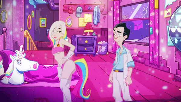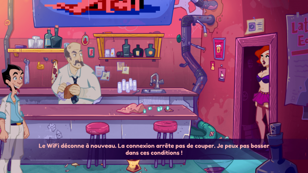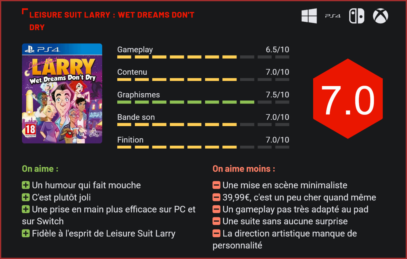 Née en 1987, la série n’avait plus connu de nouvel épisode depuis la sortie de Box Office Bust, en 2009. Série légendaire d’Al Lowe, Leisure Suit Larry n’avait plus connu de nouvelle entrée depuis 2009, avec la sortie de l’abominable Box Office Bust, un opus en 3D qui faisait office de reboot de la franchise et avait reçu un accueil critique abominable. Près de 10 ans plus tard, le studio allemand CrazyBunch s’était donné le pari un peu fou de relancer la série avec une suite directe à Drague en Haute Mer. Sorti en 2018 sur PC, le jeu a aujourd’hui droit à son portage sur consoles. Une belle occasion de prendre le pouls, avant la sortie de sa suite, déjà annoncée! Les dialogues sont très savoureux. Et le moins que l’on puisse dire, c’est que le studio allemand est parvenu à parfaitement s’emparer de la série, bien que son créateur, Al Lowe, ne soit pas impliqué dans ce projet. On retrouve tout ce qui a fait le succès des premiers épisodes de la série : des dialogues savoureux, beaucoup d’auto-dérision, un personnage attachant, des mécanismes de point & click et des décors en 2D dans l’ensemble très stylés. Bien sûr, il ne faut pas s’attendre à l’exacte réplique de Drague en Haute Mer. En près de 20 ans, les choses ont changé. Les développeurs ont d’ailleurs tenu à marquer le coup en faisant voyager Larry dans le futur. Dans cet épisode, Larry Laffer, un dragueur pathétique qui enchaine les rencards, se réveille avec une gueule de bois dans un environnement qu’il ne connait pas. Après être parvenu à s’extirper de ce curieux souterrain, il se rend compte qu’il a voyagé dans le temps – et qu’il a potentiellement été kidnappé par des aliens. Il retrouve le bon vieux bar qu’il a toujours côtoyé et malgré la situation alarmante, Larry n’a déjà plus qu’une idée en tête : draguer la seule cliente dudit bar, une “influenceuse” qui passe tout son temps sur les réseaux sociaux. Le cadre est planté : cette nouvelle aventure se déroule dans une époque contemporaine. Un pan tout entier du jeu repose sur l’usage des réseaux sociaux et des nouvelles technologies. La patte graphique est plutôt réussie, mais la direction artistique manque de personnalité. On retrouve avec plaisir l’humour caractéristique de la série, avec des dialogues souvent très savoureux, une bonne dose d’humour en-dessous de la ceinture et surtout, les bons vieux mécanismes de point & click, qui fonctionnent toujours aussi bien à la souris et sur un écran tactile (Switch), mais un peu moins bien au pad. Le joueur dirige Larry d’un stick, le curseur de l’autre. Celui-ci sert à interagir avec les objets et les personnages croisés. De façon générale, Leisure Suit Larry reste un point & click très accessible : il ne faut pas s’attendre ici à des énigmes trop compliquées ni à un véritable défi. Le jeu est une promenade de santé. Mais on s’y amuse et c’est quelque part l’essentiel. Avec ses personnages colorés, son humour crado, les mimiques délirantes de Larry et sa personnalité de vieux dragueur invétéré, les joueurs passeront assurément un très bon moment. La formule a un peu vieilli et on regrette d’ailleurs le manque relatif de moyens de ce reboot, tant au niveau de la mise en scène ultra-minimaliste que de la direction globale du projet, qui reste fidèle à l’œuvre originale mais ne parvient pas vraiment à développer une véritable personnalité. C’est une suite de Drague en Haute Mer mais sans aucune réelle surprise. On aurait également aimé un peu plus de diversité au niveau du gameplay, qui se réduit ici à un point & click simplifié. Pas de mini-jeux à l’horizon ou de séquences plus délirantes, comme dans un “Magna Cum Laude”. Le gameplay reste fidèle à la série, c’est un pur point & click. Si la recette prend et l’humour fait mouche, on regrette que les développeurs n’aient pas été un peu plus ambitieux au niveau de la présentation. Des séquences d’animation auraient pu ajouter un très gros plus au niveau de la mise en scène. Dans le même esprit, le tarif de 39,99€ est difficile à justifier pour un jeu “efficace”, mais qui est loin d’être un triple-A. Côté réalisation, Wet Dreams Don’t Dry s’en sort également plutôt bien avec de jolis environnements peints à la main, qui regorgent de détails mais manquent un peu de vie. La direction artistique est un poil moins inspirée avec des modèles en 2D peut-être un peu trop lisses pour la série… Sur ce point, Leisure Suit Larry semble avoir subi les ravages du temps. La censure est beaucoup plus présente de nos jours qu’il y a 20 ans. Que les fans se rassurent toutefois : l’humour est le même et il y a ce niveau pas à s’inquiéter sur le contenu du jeu. Conclusion Plus de 10 ans après sa dernière apparition, Larry Laffer revient dans un nouveau jeu, fidèle à l’ADN de la franchise puisqu’il s’inscrit dans la lignée des premiers volets de la franchise. On retrouve tout ce qui a fait le succès de la série : un humour décalé très en-dessous de la ceinture, un gameplay de point & click délicieusement old-school et des dialogues savoureux. Les fans seront aux anges. Si son humour fait mouche, Wet Dreams Don’t Dry déçoit toutefois au niveau de son contenu. La mise en scène du jeu reste minimaliste, les séquences de jeu manquent de variété et on ressent un manque global d’ambition. Côté réalisation, le titre est dans l’ensemble plutôt joli mais manque d’un peu de personnalité et se révèle un peu plus lisse que ses ancêtres. Ne boudons toutefois pas notre plaisir : cette nouvelle aventure de Larry Laffer est dans l’ensemble une belle réussite et une belle promesse pour une potentielle suite…