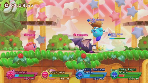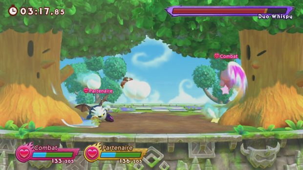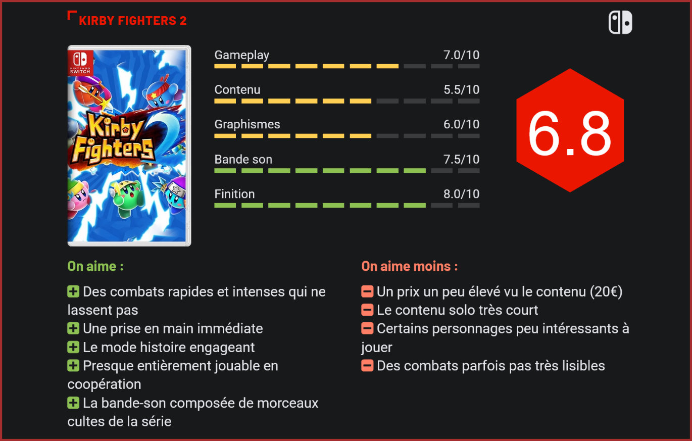 Sorti par surprise ce 24 septembre, Kirby Fighters 2 se veut être une suite à Kirby Fighters Deluxe, un petit titre paru il y a 5 ans sur Nintendo 3DS. Cette nouvelle mouture Switch s’avère plutôt convaincante. Si Kirby est déjà disponible dans plusieurs jeux sur Switch, la licence de Nintendo revient par surprise avec un nouveau spin-off. Il s’agit cette fois d’un jeu de combat développé par HAL Laboratory ainsi que par le studio Vanpool, les mêmes qui se sont occupés de Super Kirby Clash l’année dernière. Kirby Fighters 2 est un jeu ressemblant beaucoup à un autre titre étroitement lié à la licence, à savoir Super Smash Bros. Les combats se déroulent souvent en 2 contre 2. Kirby Fighters 2 est un jeu de combat en 2D mélangeant plateforme et action, jouable jusqu’à quatre. Si la ressemblance avec le crossover de Nintendo est plus que flagrante, nous sommes ici en face d’une version très simplifiée de Super Smash Bros. Le jeu ne possède qu’un seul bouton d’attaque, un bouton de saut, un bouton qui permet d’attraper un adversaire, et les gâchettes servent à activer la garde et les esquives. Couplé à certaines directions, le bouton d’attaque donnera des effets différents selon le personnage que vous incarnez. Les stages auront des formes différentes ainsi que des aléas en fonction du décor. Vous trouverez également des objets qui apparaîtront sur les stages comme de la nourriture permettant de vous soigner, des chaussures qui augmentent votre vitesse, des bombes qui infligent des dégâts… Le but sera donc de faire chuter la barre de vie de vos adversaires pour les vaincre. Vous ne retrouverez pas la profondeur qu’offre Super Smash Bros dans le gameplay de ce Kirby Fighters. Nos possibilités d’attaques et d’actions ne sont pas très nombreuses, cela varie selon le personnage que l’on incarne. Ils sont assez nombreux, même si la grande majorité du casting est composée de formes différentes de Kirby. Parmi un peu plus de 20 personnages, une bonne quinzaine sont des transformations de Kirby au gameplay très différent. Si une bonne partie du casting est très sympathique à jouer et certains personnages ont un bon potentiel de combos, d’autres ont beaucoup moins de coups à leur disposition. Des personnages comme les Kirby Bombe, Rayon et Archer ont moins de potentiel. Les combats de boss sont bien plus longs que les combats classiques. Cependant, Kirby Fighters 2 sait rester fun. Si l’action est parfois un peu confuse, les combats sont simples, amusants et aussi très rapides. Un affrontement dure rarement plus de deux minutes, permettant d’éviter une lassitude qui pourrait s’installer compte tenu de notre manque de possibilités d’actions différentes. Les combats se jouent souvent à deux contre deux, récompensant la bonne coordination des joueurs de la même équipe. Le jeu possède plusieurs modes de jeu en local ainsi que la possibilité de jouer en ligne. Le plus gros de votre progression se fera par votre rang de combattant. Il s’agit d’un niveau qui augmentera au fil des combats. Chaque niveau débloque différents éléments du jeu comme des personnages jouables, des stages, des costumes ou encore des musiques. Le mode solo principal du jeu est le mode histoire “les Rivaux Éternels”. Il s’agit d’un mode où vous devrez enchaîner les combats pour gravir une tour et affronter Meta Knight et le Roi Dadidou au sommet. La particularité de ce mode étant que les combats (à savoir les adversaires, stages et autres aléas) sont décidés aléatoirement. Vous devez également choisir parmi trois effets appliqués au prochain combat après chaque affrontement. Cela peut être des objets de soins pour vous redonner de la vie, des améliorations de statistiques… Il existe aussi un mode “solitaire” où vous devez faire neuf combats à la chaîne. Tout ce contenu ne prend malheureusement pas très longtemps à finir. Comptez environ cinq heures pour faire le tour du jeu, même si le rang de combattant ainsi que le jeu en ligne vient gonfler tout ça. Une durée de vie un peu faible pour un concept qui se renouvelle pourtant assez bien. On aurait apprécié d’autres manières de jouer comme ce mode histoire qui se révèle être long et engageant grâce à sa difficulté progressive et ses combats de boss. Certains stages ont un style rétro du plus bel effet. Kirby Fighters 2 reprend la même direction artistique déjà exploitée dans les autres titres sortis sur Switch. On retrouve cet univers très mignon et très coloré même si le style graphique reste assez simple techniquement. La bande-son n’est pas en reste puisqu’elle propose de nouvelles compositions sympathiques. Mais il sera aussi possible d’entendre des musiques cultes de la licence, notamment dans des stages rétros aux décors en Pixel art qui rendent très bien. Le titre offre ainsi un peu de fan service sympathique. Conclusion Sorti immédiatement après avoir été annoncé, Kirby Fighters 2 est une bonne surprise. Ce jeu de combat largement inspiré par la série Super Smash Bros se démarque par sa simplicité et par ses parties courtes et intenses. Un concept qui se marrie parfaitement avec les capacités portatives de la Nintendo Switch. On y retrouve un casting composé de quelques personnages de la série mais aussi rempli de Kirby sous différentes formes. Des personnages qui sont assez différents les uns des autres, même si certains sont plus travaillés et ont une palette de coups plus fournie que d’autres. Le titre propose des modes multijoueurs en ligne ainsi que plusieurs modes solo, jouables seul ou à deux. Le mode histoire “les Rivaux Éternels” se démarque en proposant des suites de combats aux configurations différentes et aléatoires, ainsi que des combats de boss qui apportent un peu de challenge. Avec sa direction artistique très colorée et sa bande-son efficace, Kirby Fighters 2 est un