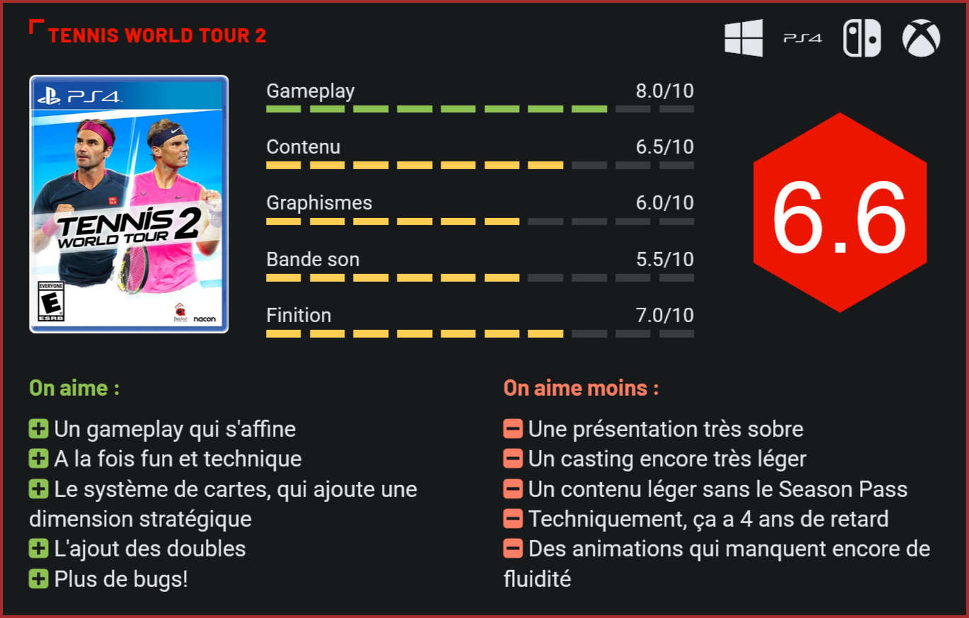 Le premier Tennis World Tour avait reçu un accueil glacial de la part de la presse spécialisée. Deux ans plus tard, la série revient avec un nouveau volet enrichi en contenus et au gameplay totalement remanié. Présenté comme le successeur de Top Spin, Tennis World Tour aura fait un joli tollé à sa sortie. Visiblement, ses créateurs n’avaient pas eu le temps de boucler le travail. Rempli de bugs, le jeu était loin d’être à la hauteur. Malgré l’absence de concurrents sur ce marché, il n’avait pas non plus rencontré un énorme succès. Pour cette suite, Breakpoint cède sa place à Big Ant, le studio qui se cachait derrière le sympathique AO Tennis, une autre simu de tennis qui s’était révélée un peu plus prometteuse. Le studio Big Ant a entièrement revu la prise en main du jeu. Les développeurs de Tennis World Tour 2 sont repartis d’une feuille blanche et ont choisi de concentrer leurs efforts sur deux aspects du jeu : la finition et le gameplay. Précisément, les deux bêtes noires du premier volet. Un choix intelligent. Côté finition, si le résultat n’est pas parfait, Tennis World Tour 2 a l’apparence d’un jeu bien fignolé. Les bugs sont peu nombreux et le jeu tourne sans latence. Côté gameplay, World Tour 2 s’inspire de son modèle Top Spin 4, avec un système de frappe qui est basé sur un appui long du bouton de tir. Comprenez par là qu’en maintenant appuyé le bouton de tir, le joueur peut “charger” sa frappe. Plus il laisse appuyer le bouton, plus le tir sera puissant, mais plus il y a de risques aussi qu’il le rate. Mine de rien, cela change complètement la donne car ce système a tendance à rendre les matchs beaucoup plus intenses et stressants. Les fautes sont plus nombreuses que dans la plupart des jeux de tennis et les matchs en multijoueur gagnent en intensité. Le gameplay est vraiment bien huilé et se rapproche de celui d’un Top Spin, même s’il n’est pas encore tout à fait au même niveau. On regrettera quelques animations douteuses et quelques petits ratés encore. Le casting est assez léger. Côté contenu, pas de gros changements en revanche. Tennis World Tour 2 se repose sur les acquis du premier épisode, avec un mode carrière efficace mais pas fou-fou non plus. La faute, en grande partie, à sa trop grande sobriété. On incarne ici un joueur débutant qui devra grimper les échelons du top 500 des meilleurs joueurs. Le joueur peut choisir à quels matchs et tournois assister, doit gérer son emploi du temps, et si vous avez récemment joué à une autre production sportive de Nacon, vous ne serez très clairement pas perdu. Ca fonctionne plutôt bien mais côté immersion, ce n’est pas génial. Le facteur narratif passe complètement au second plan. Côté casting, on retrouve une trentaine de stars de la discipline, de Nadal à Federer. 25 hommes contre seulement 11 femmes. Cela reste un peu léger, d’autant plus que quelques grands noms sont toujours absents. Avant d’aller plus loin, il convient également d’alerter les acheteurs potentiels sur un aspect très particulier du jeu : l’édition standard ne donne accès à aucun tournoi officiel. Il faudra pour ce faire repasser à la caisse pour acheter plusieurs DLC ou acheter l’édition Ace du jeu. Auquel cas vous pourrez accéder aux tournois légendaires de Roland Garros, Madrid et Halle. Ladite édition est tout de même vendue 20€ de plus, au prix plein donc… On s’en doute, les amoureux de la discipline investiront directement dans cette formule, celle à 39,99€ n’ayant finalement que peu d’intérêt sans ces jolies licences… Esthétiquement, il y a encore du chemin à parcourir… Du côté des nouveautés, on soulignera la présence des doubles qui ajoutent un réel plus. Tennis World Tour 2 montre toutefois sont vrai potentiel en ligne, contre des joueurs humains. Si son contenu reste très classique, on apprécie en revanche l’une de ses particularités : la présence de cartes qui permettent d’activer des compétences du joueur en plein match. Chaque joueur peut en équiper 5, l’une est passive, les autres ne sont utilisables qu’une seule fois. Les cartes en question donneront des bonus de précision, de puissance ou d’endurance au joueur. On perd en réalisme face à une simu pure, mais la formule fonctionne assez bien et permet d’ajouter une dimension stratégique aux duels. Malheureusement, qui dit cartes dit forcément achats in-app, même si ceux-ci ne sont pas indispensables. Côté réalisation, cela reste léger. Les graphismes sont corrects, sans plus. On est très loin d’explorer le plein potentiel des machines pourtant en fin de vie. La bande son reste comme pour AO Tennis très sobre, avec des bruitages minimalistes et une ambiance pas fofolle dans le stade. Il y a très clairement encore beaucoup de chemin à parcourir avant que la série atteigne le niveau d’un Top Spin. Conclusion En l’espace de deux ans, les développeurs de Tennis World Tour 2 sont parvenus à corriger les deux principaux défauts du premier volet. Avec un gameplay affiné, désormais calqué sur celui de Top Spin et une finition presque irréprochable, Tennis World Tour 2 se positionne enfin comme un vrai prétendant au titre du meilleur jeu de tennis du moment. Certes, il n’y a pas beaucoup de concurrence, mais l’évolution est notable. Techniquement, World Tour 2 est loin de tirer parti des capacités des consoles actuelles, pourtant en fin de vie. Son contenu reste encore léger, d’autant plus qu’il faudra obligatoirement craquer pour l’édition Ace du jeu pour avoir accès aux trois tournois sous licence. La formule fonctionne toutefois enfin. Le studio Big Ant est reparti d’une feuille blanche pour ce second volet, en choisissant de se concentrer sur les deux plus gros défauts de son ancêtre. C’est encore loin d’être parfait, mais une grosse partie du chemin vient d’être parcourue.