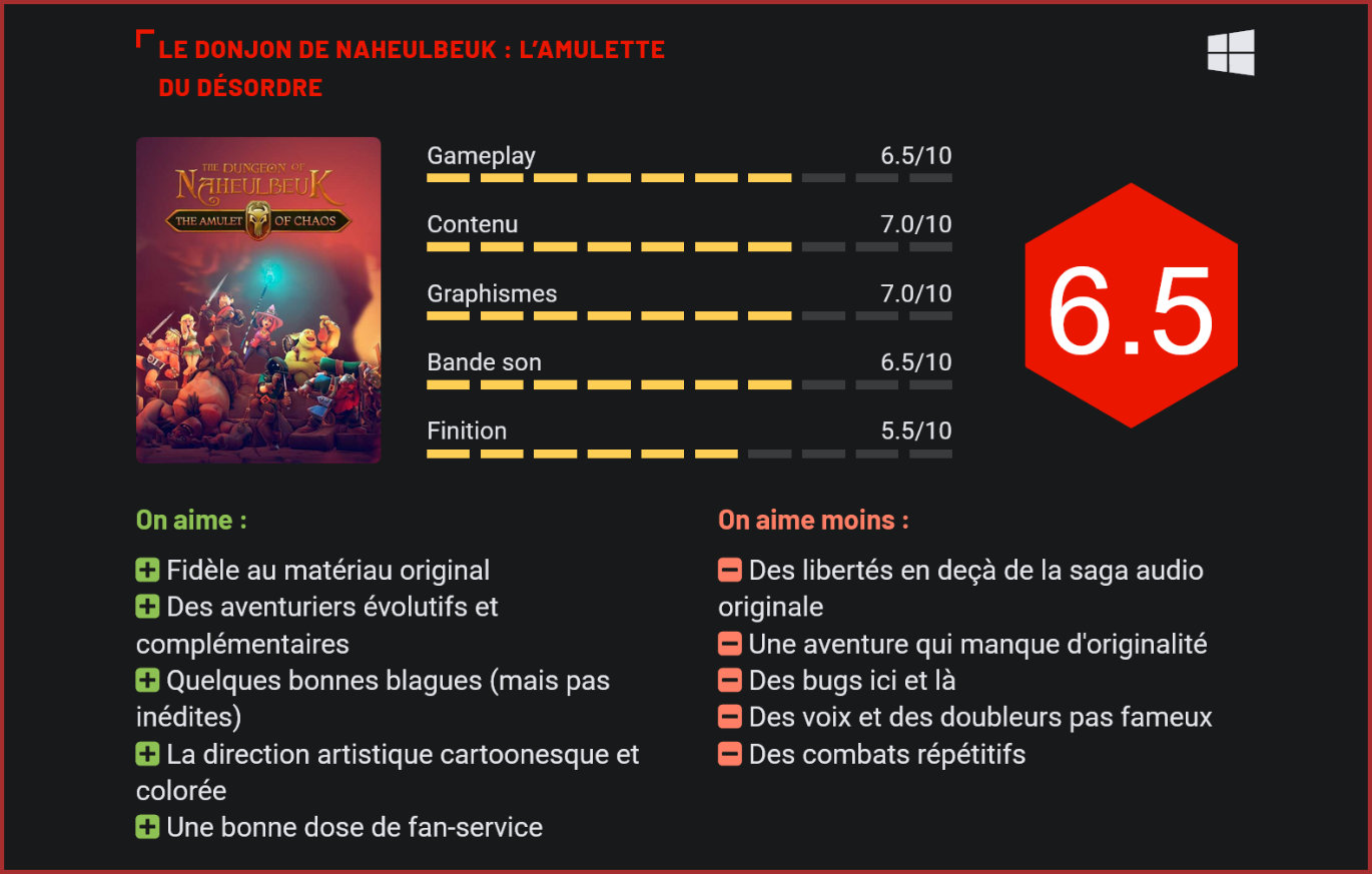 Près de 20 ans après la sortie du premier épisode de la saga audio « Le Donjon de Naheulbeuk », l’univers imaginé par John Lang sort pour la première fois sous la forme d’un jeu vidéo. Une adaptation très attendue par les fans de cet univers si particulier. Avant d’entamer la critique du Donjon de Naheulbeuk : l’Amulette du Désordre, il est important de placer le contexte. Au début des années 2000, une série audio contant les aventures d’une bande de joyeux lurons se fait connaitre sur Internet et devient particulièrement populaire au fil des épisodes. Une popularité que la saga MP3 va connaitre durant de nombreuses années. Le Donjon de Naheulbeuk est encore aujourd’hui considéré par beaucoup comme le pionnier des audio-feuilletons sur l’Internet francophone. À l’image de Kaamelott, la série audio a offert de très nombreuses répliques cultes que certains valeureux fans utilisent encore aujourd’hui (“Je m’en tamponne l’oreille avec une babouche“). Mais au-delà des épisodes audios, les faits d’armes de la compagnie d’aventuriers à la ramasse ont été adaptés en bandes dessinées, en romans et en jeu de société. Plusieurs albums musicaux ont également vu le jour et une série animée est toujours dans les cartons, malgré les difficultés. Le Donjon de Naheulbeuk est donc – pour certains – un monument de la culture populaire. Son adaptation en jeu vidéoludique est en soi un petit événement pour les fans de la série. Le Donjon de Naheulbeuk : l’Amulette du Désordre nous conte les aventures d’une bande de bras cassés ; la magicienne, le ranger, l’ogre, le nain, l’elfe et le barbare. Le titre développé par le studio français Artefact se veut fidèle à l’œuvre originale, une bonne chose pour les fans de la première heure. Et pourtant dès les premiers instants, un étrange sentiment se fait ressentir. Nul doute que le jeu est axé fan-service, mais celui-ci prend tout de même ses distances avec l’œuvre originale – ou plutôt, ne remplit pas parfaitement son rôle. Le Donjon de Naheulbeuk : l’Amulette du Désordre développe ainsi son propre scénario, bien qu’il soit largement inspiré de l’original. Tout au long du jeu, l’Amulette du Désordre semble en effet flotter quelque part entre une adaptation fidèle du matériau de base et une aventure inédite. C’est peut-être pour cela que le créateur de la série, John Lang, n’a pas cru bon de reprendre les voix originales de la saga MP3, car oui, en dehors du nain et du barbare, les personnages n’ont plus la même voix. Un point qui pourrait décevoir les fans. Les dialogues ont également été changés pour s’adapter au scénario. Fort heureusement, on retrouve tout de même de nombreux échanges fidèles à la saga audio, mais on y reviendra. Le design des personnages a également évolué. Il ne s’agit pas là non plus d’une copie des bandes dessinées du Donjon de Naheulbeuk – à raison ou à tort, cela reste à l’appréciation de chacun. Dans notre cas, nous avons été quelque peu déçus à ce niveau, même si esthétiquement le jeu se défend très bien. Pour conclure sur le côté fan-service du jeu, on regrette quelques choix artistiques qui ne permettent pas d’avoir une adaptation fidèle de l’œuvre originale qui a tant marqué les fans, mais passons outre et revenons sur l’objet vidéoludique en tant que tel. Les aventuriers se rendent dans le Donjon de Naheulbeuk pour réaliser une mission. Largement inspiré des jeux de rôle sur plateau, Le Donjon de Naheulbeuk : l’Amulette du Désordre prend la forme d’un RPG tactique dans lequel le joueur contrôle une bande de bras cassés ; le ranger, l’elfe, la magicienne, l’ogre, le nain, le barbare et le voleur. Ces derniers se lancent à corps perdu – et sans savoir vraiment où ils mettent les pieds – dans le Donjon de Naheulbeuk pour accomplir une mission : récupérer l’une des douze statuettes de Gladeulfeurha. Jusqu’ici, le scénario est identique à la saga audio, mais un événement inattendu – une amulette venue de nulle part – va venir chambouler les plans de la sympathique bande. Une construction scénaristique plutôt classique, mais inédite par rapport à la série audio – bien qu’elle lui emprunte plusieurs éléments d’histoire. Cet événement « inattendu » sert évidemment de leitmotiv à l’aventure qui est désormais double ; la bande doit retrouver la statuette de Gladeulfeurha et découvrir quel sort anime l’étrange amulette. Après avoir digéré qu’il ne s’agissait pas d’une adaptation fidèle de la série audio, les fans apprécieront tout de même de retrouver le même ADN. On retrouve ainsi les mêmes personnages avec deux pieds gauches, leur naïveté et surtout leurs relations catastrophiques. Un tableau insolite dans un cadre tout aussi décalé qui devrait séduire les non-initiés. Le ton est simplet, décalé et il vaut mieux prendre le tout avec légèreté au risque de passer à côté de la richesse parodique de cet univers. Malheureusement, en comparaison à la justesse humoristique de la série audio, on ne peut s’empêcher d’éprouver un sentiment de déception en jouant au Donjon de Naheulbeuk : l’Amulette du Désordre. Si on retrouve certaines des meilleures blagues de la saga MP3, elles arrivent parfois au mauvais moment, alors que les tentatives de blagues inédites sont loin d’être à la hauteur des originales. Certes, on retrouve dans le jeu de nombreuses similitudes avec l’audiobook (le cadre, l’humour, le côté parodique), mais cela reste très clairement un cran en-dessous. Au-delà de l’ambiance et du cadre, on reste malgré tout devant quelque chose de très classique. L’histoire est en réalité assez simple, voire quelconque et c’est bien dommage quand on sait d’où elle tient ses racines. RPG tactique au tour par tour, le jeu maitrise parfaitement les codes