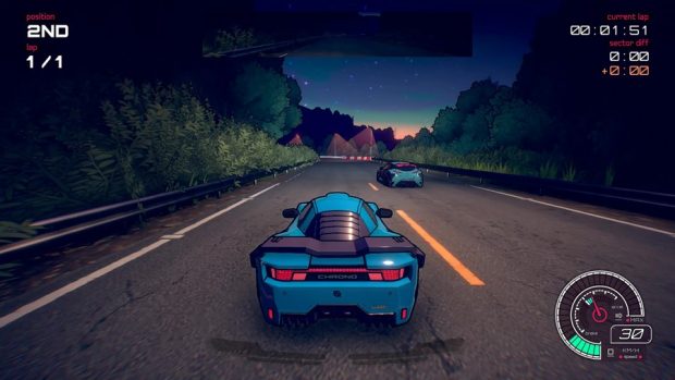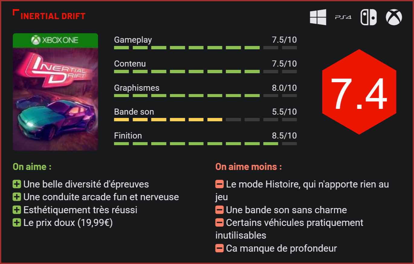 Après Horizon Chase et HotShot Racing, un autre jeu de course arcade débarque sur consoles. L’angle est cette fois un peu différent : oubliez les courses sur circuits, Inertial Drift s’intéresse à l’art du drift. S’inspirant assez ouvertement de la série de mangas Initial D, Inertial Drift propose aux joueurs de se lancer dans des courses de drift sur des tracés extrêmement stylés. Le jeu de course de Level 91 emprunte aux jeux de course arcade des années 90 leur style graphique rétro. Visuellement, le titre est très soigné, mais il s’en dégage des vibes très 90’s. Difficile de ne pas faire le parallèle avec un HotShot Racing ou un Horizon Chase. Inertial Drift joue clairement dans la même cour. Côté gameplay, le jeu est à la fois très accessible et très fun. Il se démarque toutefois des autres jeux de course par sa prise en main très particulière. Le stick gauche sert ici à diriger le véhicule, le stick droit à contrôler le drift, indispensable pour marquer des points et prendre correctement les tournants. Esthétiquement, le jeu est très soigné. Il faudra un petit temps d’adaptation pour se faire à cette prise en main très particulière. Une fois bien maîtrisée, le jeu se montre toutefois assez précis et fun. On notera cependant que la prise en main a tendance à changer radicalement d’un véhicule à l’autre. Certains d’entre eux sont très faciles à prendre en main, d’autres beaucoup moins. Et c’est sans doute le principal reproche que l’on adresse à Inertial Drift. Les développeurs auraient gagné à réduire les différences entre les types de bolides. De façon générale, on regrette également que la prise en main ne réserve pas plus de subtilités. C’est simple d’accès, un peu trop même. Ceci étant dit, on ne s’ennuie pas du tout et le jeu a un petit côté chill qu’on ne retrouve pas dans beaucoup de jeux de course… Côté contenu, il se montre étonnamment généreux avec un mode challenges, des Grand Prix, des courses libres, un mode Histoire, du multi en local et en ligne. Pour 19,99€. Il y a un nombre impressionnant de bolides à débloquer et une belle diversité de tracés. Il y a très clairement de quoi y passer une dizaine d’heures facilement. Ceci étant dit, tous les modes ne se valent pas. Le mode Histoire, très court, n’a par exemple pas beaucoup d’intérêt puisqu’il se résume à des successions de quelques défis entrecoupés par des dialogues complètement inintéressants. Il faudra pourtant y passer pour débloquer le contenu du jeu… Tout le gameplay du jeu se base sur l’art du drift. On apprécie en revanche la très belle diversité d’épreuves qui sont proposées. Inertial Drift ne se contente pas de faire succéder des courses. Le joueur devra battre des fantômes, réaliser le meilleur temps, gagner un duel, emmagasiner un max de points de drift… L’intérêt du jeu est sans cesse renouvelé si tant est que vous ne vous lassiez pas du concept forcément répétitif. Pour le reste, c’est plutôt fun à prendre en main. Les sensations de vitesse sont là, les décors sont extrêmement stylés et les visuels soignés à l’extrême. Il se dégage d’Inertial Drift un profond amour du rétrogaming. Là où le jeu déçoit en revanche, c’est au niveau de sa bande son. Les bruitages deviennent extrêmement vite agaçants, les musiques manquent de personnalité et on aura finalement tôt fait de couper le son. Pour un jeu vendu 19,99€, ce n’est pas bien grave, mais il faut avouer que cela retire un certain charme au jeu… Conclusion Jouant sur la fibre nostalgique des joueurs, Inertial Drift est une fantastique déclaration d’amour aux jeux de course arcade des années 90. Le jeu de Level 91 se démarque des autres jeux de course arcade par sa réalisation somptueuse et sa prise en main très particulière. Un stick sert à diriger le véhicule, le second à contrôler le drift. Cela nécessitera un petit temps d’adaptation… S’il manque un peu de profondeur, le gameplay n’en reste pas moins très fun. Paradoxalement, il ressort du jeu une curieuse sensation de chill avec ses décors poétiques. Comme ses cousins Horizon Chase et HotShot Racing, Inertial Drift surfe sur la vague des jeux de course arcade rétro avec brio. Il s’en démarque par sa réalisation somptueuse et son concept atypique. Tout le monde n’y accrochera pas forcément, mais le jeu a le mérite d’essayer quelque chose de différent. Avec son petit prix de vente, il ne devrait avoir aucun mal à convaincre les passionnés de sport automobile.