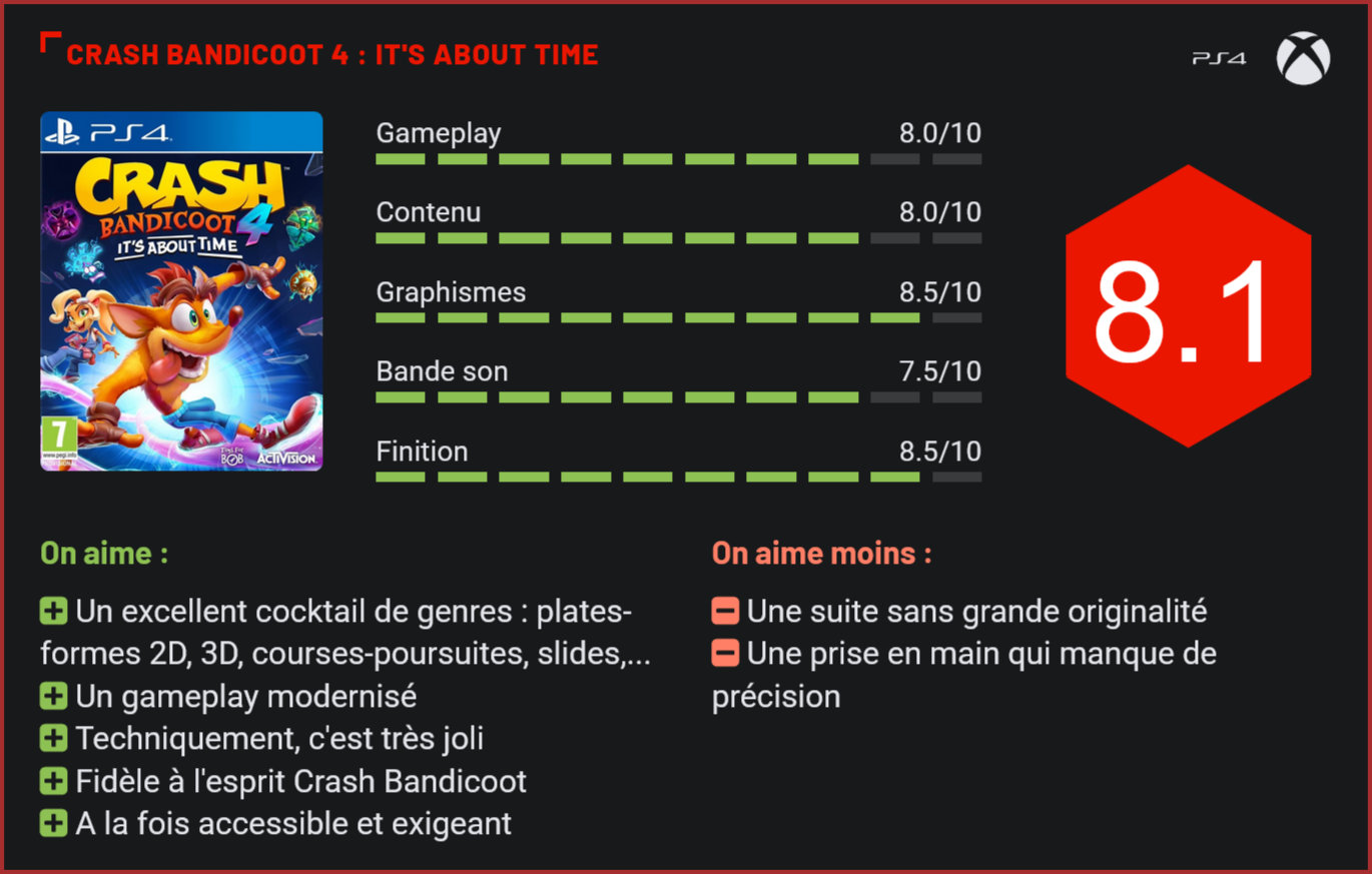 Vingt-deux ans après la sortie du troisième volet, Activision nous livre enfin le quatrième volet si fantasmé de sa série de jeux de plates-formes. Une suite qui ne manque pas de charmer petits et grands… Certes, Crash Bandicoot 3 : Warped avait bien eu droit à plusieurs suites, mais les épisodes en question n’avaient jamais atteint le niveau d’excellence de la trilogie originelle. Rien de surprenant dès lors à ce que l’éditeur ait décidé d’occulter les différentes sorties pour “réécrire” l’histoire de Crash avec la sortie d’une “véritable suite”, baptisée Crash Bandicoot 4 : It’s About Time. Le jeu exploite très bien les capacités des consoles actuelles. Confiée à Toys for Bob, le studio qui s’est chargé du remake de la trilogie Spyro, cette suite n’est donc pas l’oeuvre de l’équipe qui s’était occupée du remake des trois premiers Crash Bandicoot. Pas de panique toutefois, Toys for Bob est autant si pas plus qualifié que Vicarious Visions pour ce travail. Les développeurs avaient très tôt fait part de leur volonté de mettre tout leur coeur à l’ouvrage sur ce nouveau volet. Et dès les premières minutes, cela se ressent. Le célèbre marsupial est de retour avec toute sa joyeuse bande d’aventuriers. Pas le temps de tergiverser, nous voilà déjà embarqué dans le premier niveau! Si la structure des niveaux reste similaire à celle des anciens épisodes, avec des niveaux généralement découpés en 3 ou 4 séquences, Crash Bandicoot 4 parvient à innover avec quelques petites nouveautés. La principale nouveauté de cet univers, c’est la présence de masques qui permettent d’activer différentes capacités, et en l’occurrence de passer d’une dimension à l’autre pour faire apparaître et disparaître des éléments des décors. Un mur bloque votre passage? Changez de dimension et vous voilà libéré! Souvent, cette nouvelle mécanique de jeu est mixée avec des passages de plates-formes en 3D impliquant un bon timing pour faire apparaître et disparaître des caisses. Ce n’est pas forcément très original, mais cela suffit pour ajouter un peu de profondeur au gameplay. Les décors sont variés et colorés. Pour le reste, on retrouve tout ce qui a fait le succès de la série : des séquences de plates-formes en 2D et 3D, des niveaux cachés dans les niveaux, des courses-poursuites, des combats de boss, des secrets à découvrir, du scoring (avec même un mode Time Attack!) et des tas de pommes à récupérer dans chaque niveau. La structure du jeu est classique et les habitués ne seront pas décontenancés mais les niveaux sont variés, les séquences de jeu souvent très funs et bien rythmées et le level-design excellent. Par rapport à l’N’sane Trilogy, Crash 4 se présente comme un jeu plus moderne. Le gameplay est plus précis, le level-design mieux maîtrisé et la difficulté mieux dosée. Les habitués pourront y jouer avec un nombre de vies limité, les débutants pourront opter pour des checkpoints & vies illimitées. Crash 4 est à la fois exigeant et accessible. Le jeu se destine avant tout aux fans trentenaires du marsupial, mais pas que puisque le mode facile le rend accessible à un public plus jeune aussi. Pas forcément des enfants toutefois, le challenge restant assez “élevé” pour un jeu de plates-formes. S’il fait mouche, Crash 4 ne parvient toutefois jamais vraiment à surprendre. C’est la suite qu’on attendait. Un très bon quatrième volet, mais finalement sans grande surprise. S’il corrige certains défauts de la trilogie, il en conserve toutefois le plus vilain : sa prise en main reste dans l’ensemble peu précise. Les développeurs ont bien tenté d’apporter un peu de vent frais en proposant des tas de petites nouveautés, mais aucune de ces features ne parvient totalement à convaincre. On citera en vrac des niveaux bonus sans grande imagination dans lesquels on incarne d’autres personnages de la série, le mode Time Attack, sympa pour les puristes mais qui n’apporte en soi rien de vraiment révolutionnaire, un mode multijoueur en local au tour par tour dans lequel il faudra réaliser les meilleurs temps – amusant encore une fois mais pas forcément fendard -, et un mode miroir qui vient rallonger artificiellement la durée de vie. Des tas de bonnes idées, qui ne susciteront toutefois pas forcément l’émoi des fans. Les passages en 2D sont nombreux. Côté réalisation, Crash Bandicoot 4 : It’s About Time est en revanche une belle réussite. Le jeu est beau, voire très beau même, avec ses jolis effets visuels, ses décors colorés et son style cartoonesque. Le design des personnages a été légèrement modifié, mais le résultat est dans l’ensemble très convaincant. Sans être une claque graphique, le jeu exploite très bien les capacités des consoles actuelles. La bande son se révèle également convaincante, sans toutefois jamais réellement surprendre. On lui reprochera peut-être un certain manque d’ambition. Si le jeu n’est pas bien long (comptez 10h en ligne droite), les puristes y passeront sans doute beaucoup plus de temps entre les niveaux miroirs, le multijoueur et le time trial. Conclusion 22 ans après Crash 3, Activision nous livre enfin la suite tant attendue des aventures de notre marsupial préféré. S’il ne surprend jamais, Crash Bandicoot 4 : It’s About Time s’impose comme un excellent jeu de plates-formes, à la fois accessible et exigeant, fun et décalé. Le titre reste fidèle à l’ADN de la série, avec ses décors colorés, son univers décalé, son ton humoristique et son gameplay varié. Les développeurs sont toutefois parvenus à moderniser les rouages. Le résultat? L’un des jeux de plates-formes les plus funs de ces dernières années, qui plaira tant aux plus jeunes qu’aux trentenaires. Crash 4 est joli, fun et décomplexé, mais il n’innove pas forcément beaucoup. Les nouveautés sont