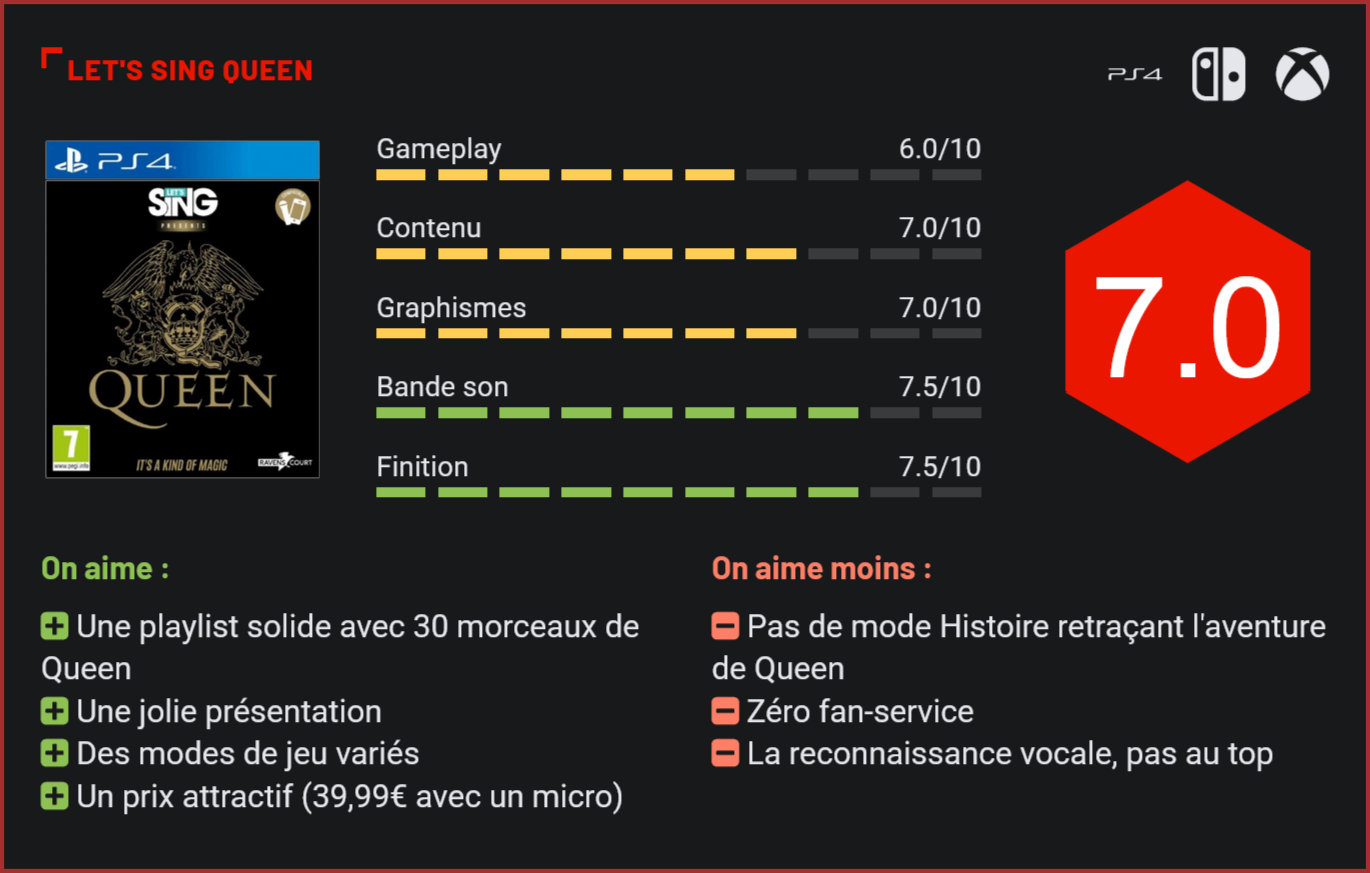 En attendant la cuvée 2021 du jeu de karaoké, les amateurs du genre pourront s’occuper avec Let’s Sing Queen, un spin-off entièrement dédié au célèbre groupe de rock des années 80. On ne change pas une recette qui marche. Voxler et Ravenscourt l’ont bien compris avec Let’s Sing, leur série de jeux de karaoké, déclinée à toutes les sauces. Cette année, les amateurs du genre pourront découvrir un épisode entièrement dédié au légendaire groupe de rock Queen. Qui dit spin-off aurait bien entendu suggéré que le studio mette les petits plats dans les grands pour combler les fans. Il faudra toutefois se contenter d’un simple skin de Let’s Sing 2020 ici puisque cet épisode ne propose aucun contenu supplémentaire en-dehors de sa bande son exclusive. N’espérez pas retrouver de concerts, de vidéos ou même de biographie. Voxler s’est contenté du minimum syndical. Les fans purs et durs de Queen seront donc un peu déçus. Ceci étant dit, le jeu compense ce petit défaut par une playlist séduisante et un prix attractif. Comptez 39,99€ pour le jeu + le micro. La playlist complète de cet épisode rassemble 30 morceaux de Queen. Tous les classiques sont de la partie, de Bohemian Rhapsody à We Will Rock You, en passant par Another One Bites The Dust, I Want To Break Free ou We Are The Champions. On retrouve également quelques morceaux un peu moins connus. Tous les classiques sont de la partie. La playlist du jeu est donc solide. Certes, on serait en droit de se demander pourquoi au juste Queen a droit à son propre épisode, alors que Michael Jackson, Nirvana ou David Bowie n’y ont pas eu droit. Voxler aurait très bien pu proposer le jeu sous la forme d’un add-on payant pour une ancienne version du jeu. La facture reste toutefois très correcte au vu du contenu. Il n’y a donc pas lieu à se plaindre… Côté contenus à proprement parler, on retrouve une belle diversité de modes de jeu. Le mode Classique, dans lequel on joue en solo ou à plusieurs : l’objectif est d’engranger un max de points en chantant le mieux possible. Les adeptes de duos pourront se tourner vers le “feat.”. Le mode World Contest permet quant à lui d’affronter d’autres joueurs en ligne et de grimper dans les classements. La communauté étant toute petite, il ne sera pas évident de trouver des parties, mais la présence dudit mode reste un plus. Dans le mode Mix Tape 2.0, il faudra enchainer des extraits de chansons, mixés de façon aléatoire. C’est plutôt bien fichu et assez fun si l’on cherche à s’amuser quelques minutes entre amis. Le mode Let’s Party va plus loin en proposant à deux équipes de max 4 joueurs de s’affronter en 1 contre 1 à tour de rôle à travers des séries de défis délirants. Un concept amusant en groupe, et qui fonctionne dans l’ensemble très bien. On reprochera à Voxler de ne pas avoir été plus loin – comprenez par là proposer un mode Histoire, dans lequel on aurait pu revivre les dates clés de la carrière de Queen à travers des défis. La charge de travail aurait toutefois été beaucoup plus importante pour le studio et le prix de cette édition aurait pu en être impacté… On retrouve tous les clips emblématiques de Queen. Les habitués de la série ne seront donc pas surpris ni par le contenu ni par la présentation. Cette édition spéciale du jeu n’est ni plus ni moins qu’un skin du Let’s Sing 2020 que nous avions testé l’an passé. Il conserve ses qualités (des modes de jeu variés, une jolie présentation,…), mais aussi ses défauts. Dont un en particulier qui ressort du lot : la reconnaissance vocale n’est toujours pas au point. Ca fonctionne “plus ou moins” avec le micro ou le smartphone, mais même avec un participant doué, il faudra adapter sa voix aux résultats. Si vous ne prêtez pas trop attention au score, ce n’est pas fort gênant. Si en revanche vous voulez décrocher l’Or sur tous les morceaux, vous serez tenté de jouer parfois de façon peu naturelle. La qualité du micro qui accompagne le jeu est minimaliste. On est très loin ici des micros d’un Lips ou d’un Singstar. Le prix est également un cran en-dessous… Autre petit regret pour les puristes : il sera impossible d’écouter son morceau une fois la partie terminée. Une option d’écoute supprimant la voix de Freddie Mercury et la remplaçant par celle du joueur aurait pourtant été un très gros plus pour certains joueurs… Conclusion S’il manque un peu le coche auprès des fans puisqu’il ne propose aucun contenu inédit ni mode Histoire qui aurait permis d’explorer la timeline du groupe, Let’s Sing Queen reste un jeu de karaoké très séduisant. La playlist du jeu est solide avec pas moins de 30 morceaux, dont tous les classiques du groupe, de “We will rock you” à “Bohemian Rhapsody”. La présentation est irréprochable et les modes de jeu nombreux. Le jeu est de surcroit vendu à un prix attractif, en bundle avec un micro. Pour y jouer, deux options s’offrent à vous : utiliser le micro USB qui est livré avec ou une application dédiée sur votre smartphone. La reconnaissance vocale n’est pas fantastique mais l’expérience reste toutefois solide. Pour un peu plus de diversité au niveau de la playlist, attendez calmement Let’s Sing 2021.