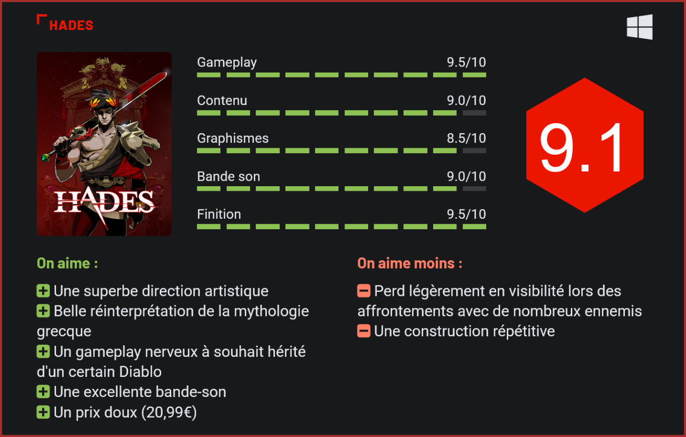 Lancé en accès anticipé il y a bientôt deux ans sur l’Epic Store, Hades débarque enfin en version définitive sur PC et Nintendo Switch. Le titre annonçait déjà de très bonnes choses, mais qu’en est-il à sa sortie? Les jeux qui ont fait de la mythologie leur trame principale ont le vent en poupe depuis quelques années. Après Assassin’s Creed Odyssey et God of War qui faisaient respectivement la part belle aux mythologies grecques et nordiques, c’est au tour d’Hades de revisiter les mythes olympiens. Un jeu aux accents très japonisants, développés par des Américains et contant des récits grecs : un mélange qui pourrait surprendre et qui pourtant fait mouche. Evoquons tout d’abord le scénario qu’est celui d’Hades. Zagreus, fils du maître des Enfers, tente d’échapper au joug de son père afin de rejoindre le reste de sa famille qui réside sur le Mont Olympe. Malheureusement, le prince devra parcourir de très nombreuses chambres dans le Tartare et affronter les âmes déchues mises en travers de son chemin par son père. Seul problème : le niveau de ses ennemis se retrouve très vite plus élevé que prévu, et Zagreus se retrouvera vite mis à mal. Il devra alors repasser par l’entrée des Enfers où l’attendra son père. Dans son périple, Zagreus rencontrera de nombreuses divinités grecques, à l’image de Zeus, Artémis ou Aphrodite, mais également certains des plus mythiques héros hellènes. Achille restera d’ailleurs dans le hall d’entrée des Enfers et vous soutiendra psychologiquement dans votre périple, tandis que vous croiserez Sisyphe, au détour d’une chambre, qui s’octroie une pause dans sa dure labeur. Le lore de la mythologie est parfaitement respecté, avec une jolie réinterprétation visuelle des différents dieux et héros. Enfers oblige, il est presque impossible d’en échapper. Afin d’empêcher les âmes tourmentées de remonter à la surface, Hades a mis en place un gigantesque labyrinthe au sein de son royaume. Divisé en paliers, ce labyrinthe est formé de chambres en perpétuel mouvement et changement, et ce afin d’empêcher tout individu de cartographier les lieux et de facilement en sortir. Un scénario idéal pour le style roguelike, où la mort fait partie intégrante du jeu. Zagreus étant par ailleurs un dieu, il ne mourra vraiment jamais et reviendra de manière perpétuelle à l’entrée des Enfers. Une construction qui peut par ailleurs paraître répétitive, tant le joueur verra régulièrement les mêmes lieux et personnages. Néanmoins, on sait ce que les mécaniques du roguelike incombent. Les niveaux sont renouvelés constamment, au même titre que les ennemis. La répétitivité passe ici au second plan, tant le joueur ne s’ennuiera pas un instant. Le jeu propose une très jolie révision de la mythologie greco-romaine. Précisons d’ailleurs qu’Hades n’est pas réellement un roguelike. En effet, on évoquera plutôt ici un roguelite, où la progression n’est pas totalement perdue après la mort. Là où un roguelike ramènera le joueur à son point départ en ayant perdu définitivement ses améliorations, un roguelite n’abandonne pas totalement le joueur. Ainsi, les différents bonus et armes acquis durant votre progression restent vôtres, afin de faciliter la progression dans les différents niveaux. Outre des personnages fort charismatiques et très réussis, Hades offre de sublimes environnements. Parcourir les différentes chambres du Tartare s’avère étonnamment agréable, tant les couleurs sont vives et claires et qu’elles tranchent avec l’ambiance telle qu’on la connaît aux Enfers. Les environnements parviennent sans mal à se réinventer, sans jamais lasser le joueur, même après de nombreuses morts, notamment grâce à un bestiaire très conséquent. Zagreus croisera sur son chemin de très nombreux ennemis. Inspirés des mythes grecs, ces ennemis, à la puissance et aux pouvoirs variés, apporteront un réel défi. Les Mufles, par exemple, sont de “grosses dames” qui fonceront vers vous et vous infligeront de lourds dégâts. Les Skullomats envoient pour leur part quantité de crânes qui vous pourchasseront inlassablement. De plus, changer de palier viendra à renouveler intégralement le bestiaire, ce qui offre une très belle rejouabilité. Chaque dieu olympien vous confèrera bonus et bienfaits durant votre périple. Pour vous accompagner dans votre quête, les dieux vous accosteront afin de vous conférer bonus et autres bienfaits. Il faudra évidemment choisir judicieusement les bienfaits que les divinités vous octroieront, car cela a une très forte incidence sur la suite de votre parcours. A certains moments, deux dieux vous proposeront des bonus, avec le risque de subir le courroux du dieu dont vous avez refusé les bienfaits. Ces bienfaits seront d’une importance capitale lors de votre progression, au même titre que les différentes armes. Si celles-ci sont peu nombreuses, elles parviennent très bien à elles-seules à renouveler le gameplay. L’épée est évidemment plus rapide à manier que la lance ou le bouclier, mais est également moins impactante dans ses coups. Malgré une mise en scène très soignée des affrontements, on regrettera un certain manque de visibilité par moments. Un gameplay nerveux, précis, addictif et qui varie en fonction de l’arme équipée et des bienfaits obtenus. Une recette qui marche et qui a fait ses lettres de noblesse sur un certain Diablo. Les combats s’enchaînent à un rythme effréné sans jamais lasser le joueur. Sur le champ de bataille, l’affrontement avec les ennemis est véritablement jouissif. Néanmoins, on regrettera une perte de visibilité une fois que le champ de bataille est surpeuplé et que les sorts et coups s’enchaînent. Si ça n’impacte en rien le plaisir du joueur, ça ne peut qu’être dérangeant, notamment lorsque les heures de jeu s’enchaînent. Enfin, d
