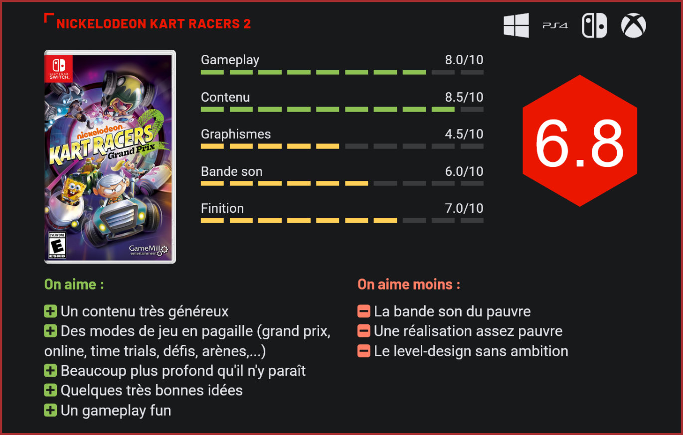 Les Mariokart-likes sont nombreux. Peu toutefois parviennent à s’imposer comme des alternatives viables à Mariokart. Après un premier volet décevant, GameMill et MaximumGames repartent à la charge avec un nouveau Nickelodeon Karts Racers, qui pourrait cette fois bien trouver son public. Ne tergiversons pas, inutile d’attendre ce Nickelodeon Karts Racers 2 un jeu à gros budget. Sa réalisation n’est pas du tout à la hauteur d’un Mariokart. Techniquement, on est très loin d’exploiter le potentiel des consoles actuelles : les décors sont souvent vides, manquent d’inspiration, les effets visuels sont minimalistes et on a clairement l’impression de jouer à un jeu d’il y a six ans. Toutefois, ce serait une grossière erreur de s’arrêter là. Car si oui, Nickelodeon Karts Racers 2 n’est pas un joli jeu, il n’en reste pas moins fun et prenant. La réalisation du jeu est correcte, mais les niveaux sont désespérément vides. La première chose qui marquera le joueur, c’est l’abondance du contenu. On retrouve ici du multijoueur en ligne, du local, un mode Grand Prix dans lequel on prendra part à une dizaine de compétitions, du Time Trial, des Défis, des combats en Arènes,… Bref, il n’y a vraiment pas de quoi s’ennuyer, d’autant plus que chaque mode de jeu présente un réel intérêt. Dans les défis par exemple, vous serez amenés à réaliser de petites missions pour débloquer des contenus du jeu. Le mode Grand Prix propose une succession de quatre tracés avec à chaque tour un certain nombre de points attribués à chaque joueur selon sa position finale. Une victoire permet là aussi de débloquer quantités de contenus en tous genres. Si, de prime abord, on a affaire à un simple Mariokart-like, Nickelodeon Karts Racers 2 est en réalité beaucoup plus riche qu’il n’y paraît. La prise en main est fun et immédiate mais le jeu présente son lot de spécificités. Par exemple, il sera ici indispensable de maîtriser l’art du drift. Lorsque son drift est assez long, on bénéficie en effet d’un coup d’accélérateur. Autre spécificité du jeu : chaque coureur a ses propres caractéristiques. Comprenez par là qu’un Bob l’Eponge sera peut-être plus compétent dans le drift et l’accélération qu’un Michelangelo qui sera plus rapide et plus facile à contrôler. Là où le concept se révèle très séduisant, c’est justement dans le fait qu’il est possible d’affecter ces capacités en modifiant son kart avec divers éléments, pour en améliorer la tenue de route par exemple. Kart Racers 2 introduit également un concept d’équipe avec des personnages secondaires qui attribuent diverses compétences spéciales et perks. Le bouton Y permettra d’activer ladite compétence, qui variera selon l’accompagnant sélectionné. Il sera possible d’activer un boost, de ralentir les ennemis à proximité et bien plus encore. Le casting réunit une belle brochette de stars du petit écran. Les surprises ne s’arrêtent pas là. Kart Racers 2 est étonnamment chargé en features de tous genres. Le joueur récupérera par exemple des tokens qui lui permettront de débloquer différents éléments pour son kart. Une grosse partie du contenu du jeu est bloqué à la base : il faudra donc beaucoup jouer pour débloquer tous les personnages, défis et aides du jeu. Le casting du jeu est également bien fourni avec la présence d’une ribambelle de personnages issus des shows de Nickelodeon. Bob l’éponge, Avatar, Les Razmokets, Chien & Chat, les Tortues Ninjas, tous se sont donné rendez-vous. On regrette en revanche qu’aucune musique officielle ni voix ne soit de la partie. A ce niveau, le jeu manque cruellement de personnalité. Le jeu est rapide, fun, et reprend dans l’ensemble la formule d’un Mariokart avec des tracés qui recèlent de passages secrets, des power-ups en pagaille, et plein de pièges qui viennent vous mettre des bâtons dans les roues. On lui reprochera toutefois un level-design globalement peu inspiré. Là encore, ça sent le budget serré. Paradoxalement, on retrouve toutefois près de 30 tracés différents. Beaucoup de personnages sont à débloquer. S’il souffre encore de quelques vilains défauts, Kart Racers 2 est donc un jeu de course très fun, en particulier à plusieurs. Le jeu n’est pas très joli, mais il est agréable à parcourir et l’abondance de contenu en fait une valeur sûre pour les enfants. A 39,99€, la formule mérite le détour. Conclusion S’il n’est pas au même niveau qu’un Mariokart, Nickelodeon Kart Racers 2 n’en reste pas moins un jeu de karts très fun, qui réunit une belle brochette de personnages cultes d’animés et a le mérite de proposer un contenu très généreux. A côté de ses nombreux Grand Prix, on retrouve du multi en ligne et en local, des Défis qui permettent de débloquer du contenu, des combats en arènes et du Time Trial. Le titre de GameMill se révèle beaucoup plus riche qu’il n’y paraît avec son système de drifts, ses crew members qui permettent d’attribuer des perks et ses karts upgradables. Très clairement, il y a de quoi s’y amuser durant des heures, si l’on ferme les yeux sur sa réalisation graphique très minimaliste et sa bande son très pauvre. A 39,99€, Nickelodeon Kart Racers 2 est un petit plaisir qu’on ne se refuse pas si on n’a pas touché à un jeu de karts depuis longtemps!