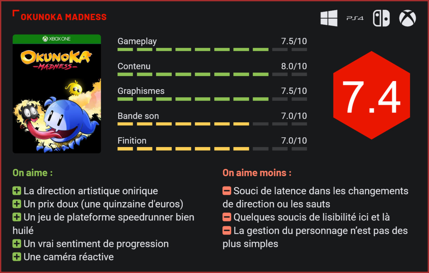 Après une première apparition sur Nintendo Switch en 2018, le jeu de plateforme masochiste OkunoKA débarque sur PC et consoles de salon dans une version améliorée, Madness. De quoi faire durer la torture. Malgré son apparence de platformer coloré, OkunoKA Madness n’est pas un jeu qui s’adresse aux plus jeunes. Tout le concept du titre repose sur la frustration. Sous ses faux airs d’univers enfantin et jovial se cache en réalité un titre qui mettra à rude épreuve les nerfs des joueurs, voire leur santé mentale – ainsi que leur manette ou clavier. Les graphismes sont très colorés. Le titre de Caracal Games est donc – vous l’aurez compris – un jeu de plateforme. Le joueur devra passer la centaine de niveaux qui se dresseront devant lui pour déjouer les plans d’Os qui souhaite anéantir le monde des âmes. Tout au long de ce périple, le joueur contrôlera KA, une étrange créature. Une histoire qui n’a en réalité aucun réel intérêt si ce n’est d’offrir un cadre à l’aventure. Évidemment, la difficulté du jeu ne repose pas sur le fait d’atteindre les différentes plateformes – même si cela s’avère déjà bien compliqué dans certains cas, mais on y reviendra. De nombreux obstacles, ennemis et boss se dresseront sur la route de notre cher Ka, histoire de lui compliquer un peu plus la tâche. Dans les faits, OkunoKA Madness ressemble à n’importe quel autre jeu de plateforme exigeant. On retrouve d’ailleurs le principe de collecte de divers objets – des esprits secondaires à collecter, placés dans des endroits difficiles d’accès –, ainsi que des passages secrets. Globalement, les niveaux sont d’ailleurs plutôt bien pensés. Mais la particularité d’OkunoKA Madness repose sur sa difficulté. Conçu pour les speedrunners, le titre de Caracal Games exigera une bonne dose de rapidité d’exécution de la part des joueurs, voire de bons réflexes. Et cela pourrait ne pas être suffisant tant la gestion de KA est complexe. Les obstacles sont nombreux et les plateformes pas toujours faciles à atteindre. L’inertie dans le jeu semble en effet très bizarre. Une fois lancée, la créature semble glisser sans retenue, les sauts remettent en cause toutes les lois de la physique et le temps de réponse de KA lors d’un changement de direction est plutôt déconcertant. Maitriser la bestiole sera véritablement un défi pour les joueurs et certains pourraient même abonner – on vous comprend – tellement KA répond à une physique qui lui est propre. Mais les challenges ne s’arrêtent pas là puisque les difficultés se multiplient au fil des niveaux, arborant de nouveaux pièges ou obstacles en tout genre. Et à la moindre égratignure, c’est retour à la case départ et sans détour ! Un die & retry des plus frustrants. Au fur et à mesure de sa progression, Ka acquerra de nouvelles compétences, notamment la maîtrise les éléments (feu, glace, électricité) ce qui lui permettra de contrôler de plateformes correspondantes à ces éléments. Il faudra donc prendre en compte plusieurs éléments (saut, gestion des plateformes, obstacles) pour voir le bout des niveaux ce qui demandera une bonne dose de concentration, de réflexes et de maîtrise de ses nerfs. Ceux qui n’auraient pas encore abandonné pourront tomber dans des failles, sorte de niveau bonus, à travers lesquelles les joueurs pourront tenter de récupérer des esprits supplémentaires, le tout avec seulement 3 vies. Collecter ces esprits permettra au joueur de débloquer de nouveaux personnages jouables. Avec plus d’une centaine de niveaux et une difficulté grandissante, et ce, même si elle est déjà présente dès les premiers instants, OkunoKA Madness divertira les adeptes du speedruns durant une dizaine d’heures. Quant aux joueurs moins aguerris ou moins habitués à ce type de jeux très exigeants, le jeu pourra durer une éternité. Le jeu profite d’une jolie direction artistique, mais la lisibilité laisse parfois à désirer. Enfin, ceux qui passeront beaucoup de temps dans chaque niveau – malgré le chrono qui tourne – pourront admirer les décors très colorés d’OkunoKA Madness. La direction artistique y est très particulière, on se croirait à certains moments être tombés dans le rêve d’une personne sous influence. Les différents mondes proposent chacun leur propre identité ce qui est évidemment une bonne chose. On regrette cependant le manque de distinction qu’il peut y avoir entre les décors et les plateformes en tant que tel, ce qui peut engendrer un souci de lisibilité, mais après une ou deux morts, on sait où est coin. On notera également la présence d’une ambiance musicale en totale adéquation avec le concept du jeu et le côté speedrunner qui peut, elle aussi, frustrer à force de l’entendre. Conclusion Sorti en 2018 sur Switch, OkunoKA s’offre un second souffle sur PC, PS4 et Xbox One, mais aussi sur Switch, avec une version améliorée, Madness, comprenant quelques nouveautés. Les amateurs de jeux de plateformes exigeants et de speedruns trouveront aisément leur compte avec ce jeu signé Caracal Games. Ici, le scénario ne sert véritablement qu’à encadrer la centaine de niveaux plus durs les uns que les autres. Obstacles en tous genres, boss, vitesse, les difficultés seront nombreuses pour traverser les différents niveaux. D’autant plus que notre héros semble répondre à une physique bien à lui. Sa gestion demandera en effet un temps d’adaptation aux joueurs puisque celui-ci réagit plus mal aux changements de direction et s’accroche tout aussi mal aux murs. Venir à bout de l’aventure demandera moins d’une dizaine d’heures pour les adeptes de ce type de jeux, alors que les autres prendront beaucoup plus de temps. Vendu une quinzaine d’euros, le titre a le mérite de bénéficier d’une réalisation soignée et de proposer une expérience de jeu très différente des au