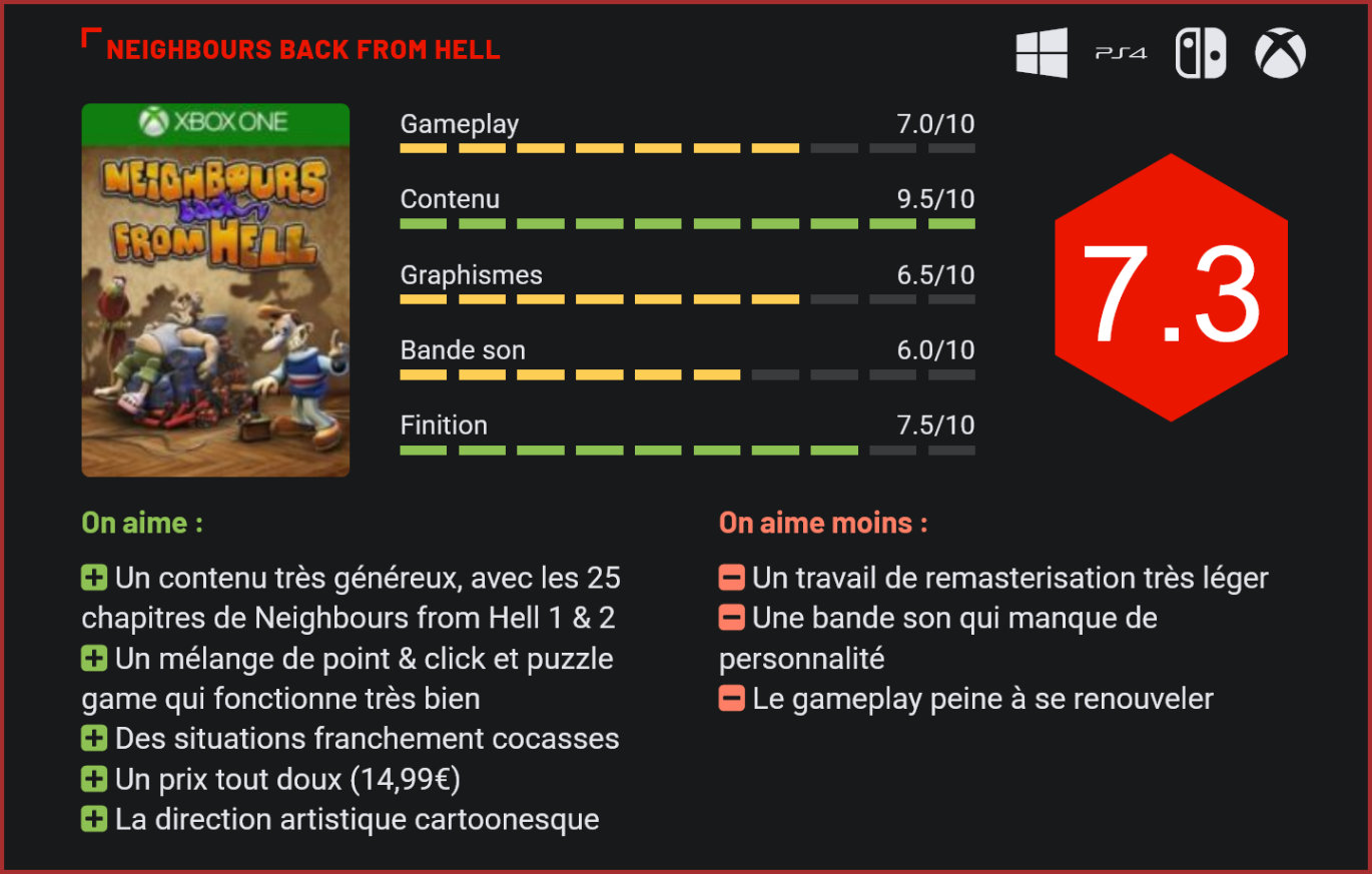 Sortis au début des années 2000, les deux épisodes de la série “Neighbours from Hell” ont droit près de 20 ans plus tard à un remaster sur les consoles de dernière génération et sur PC. Une bonne raison de s’y replonger? Relativement méconnue du grand public, la série “Neighbours from hell”, traduite en français “Un voisin d’enfer”, n’avait pas rencontré un énorme succès en son temps. Il était toutefois parvenu à se forger une petite fan-base avec son concept atypique. Quelque part à mi-chemin entre un point & click et un puzzle-game, le titre nous propose d’incarner un habitant de la banlieue en colère contre son voisin malpoli. L’objectif est clair : lui pourrir la vie en installant des pièges dans toute son habitation… Accessoirement, en participant à un show télévisé. Il faut bien l’avouer, ce voisin a tout pour agacer. Neighbours back from Hell rassemble dans une compilation les deux premiers épisodes de la série, sortis à l’époque sur PC, PS2 et Xbox. Si vous étiez passés complètement à côté – ce qui serait somme toute logique puisqu’ils n’avaient pas beaucoup fait parler d’eux -, sachez qu’il s’agit pourtant là de deux titres très sympathiques, qui méritent le détour pour le concept unique. Neighbours from Hell se joue comme un point and click, ou presque, puisqu’on dirige le personnage au pad et on interagit avec divers objets des décors avec un bouton. Le gameplay reste très simple puisqu’il est en grande partie basé sur l’observation du “voisin”, qui se déplace dans les quelques pièces de l’habitation sous votre regard sournois. En mémorisant ses déplacements, vous saurez où et quand frapper en allant scier son fauteuil par exemple lorsqu’il va faire sa gym ou regarder la voisine avec ses jumelles de pervers, en lui versant du laxatif dans ses bières ou en glissant des oeufs dans son micro-ondes. Neighbours back from hell est un jeu simple d’accès, au concept rigolo, idéal pour des courtes séquences de jeu. Chaque “mission” est composée d’une série d’objectifs à réaliser le plus vite possible, en évitant si possible de se faire prendre. Le jeu est donc très axé infiltration puisqu’il faudra sans cesse éviter le voisin en passant d’une pièce à l’autre ou en se planquant dans une armoire. Les niveaux sont nombreux et plutôt variés. Rigolo bien qu’assez malaisant, le concept reste très séduisant et malgré les apparences, le jeu propose une solide durée de vie avec ses 25 chapitres, tous composés d’une demi-douzaine de missions. Le gameplay peine en revanche à se renouveler sur la longueur… Ceci étant dit, les niveaux sont suffisamment variés pour vous tenir scotché à votre pad. Et pour un peu moins de 15€, difficile de trouver à se plaindre. En presque 20 ans, les deux jeux ont bien sûr vieilli, mais pas atrocement. Les deux titres restent agréables à la vue, en grande partie de par leur direction artistique cartoonesque qui rappelle celle d’un Leisure Suit Larry. Les graphismes ont été un peu retravaillés et s’affichent désormais en Full HD. Les animations paraissent également plus fluides. Ceci étant dit, le travail de remasterisation reste très léger. Notre plus gros regret concerne la bande sonore. Le titre ne disposait pas de doublages à l’époque : il faudra se contenter aujourd’hui encore de quelques couinements rappelant les jeux de Rare sur Nintendo 64. Les quelques musiques et bruitages qui sont de la partie restent quant à eux très banaux. Alors oui, très clairement, les développeurs auraient pu en faire davantage sur ce jeu, mais au prix auquel il est proposé, ce Neighbours back from hell reste dans l’ensemble une bonne affaire. D’autant plus que le principal intérêt ici est de rendre à nouveau disponible une pépite méconnue pour ceux qui seraient passés à côté… Conclusion Cette compilation qui regroupe les deux volets de la série “Neighbours from Hell” n’apporte certes que peu de nouveautés par rapport aux deux opus originaux, mais a le mérite de se présenter comme une jolie séance de rattrapage pour les nombreux joueurs qui étaient passés à côté de ces deux pépites au début des années 2000. Mélange improbable de point & click, de jeu d’infiltration et de puzzle-game, Neighbours back from Hell propose aux joueurs d’incarner un voisin en colère qui décide de se venger de ses voisins un peu trop bruyants. Décomplexé, fun et complètement décalé, Neighbours back from Hell est une véritable bouffée d’air frais au milieu d’un océan de platitudes. Avec ses charmes so 90’s, le titre édité par HandyGames pourrait bien trouver son public, 20 ans plus tard. D’autant plus qu’il est proposé à un tout petit prix. Il faudra en revanche fermer les yeux sur un gameplay qui a un peu vieilli…