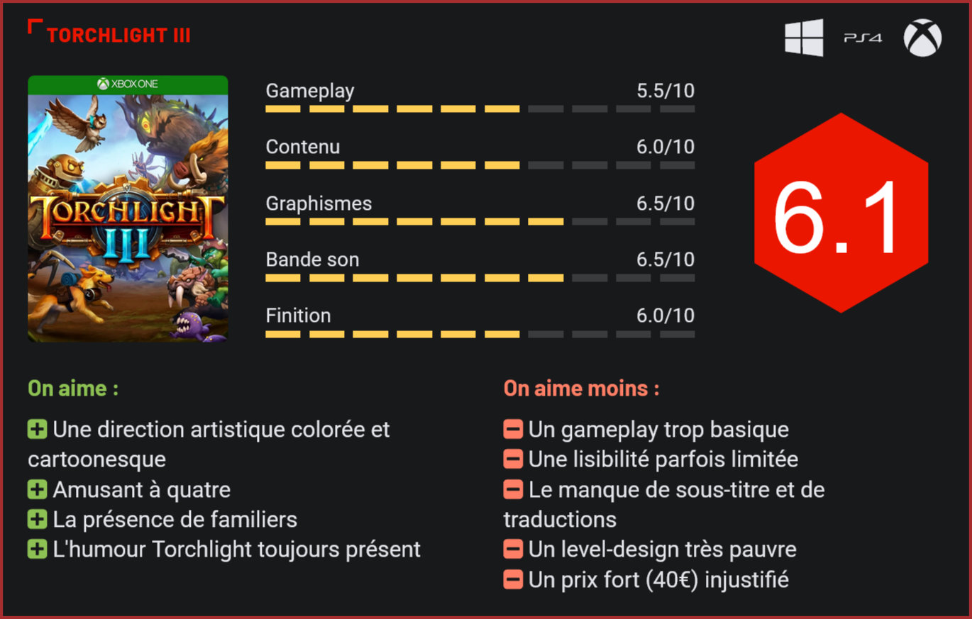 Huit ans après Torchlight II, le studio américain Echtra Games livre enfin le troisième volet de la saga. Le moins que l’on puisse dir, c’est que le développement de Torchlight III n’a pas été de tout repos. Annoncé en août 2018, Torchlight III – anciennement baptisé Frontiers – était initialement attendu pour novembre 2019. Or, ce n’est finalement qu’au mois d’octobre 2020 que le jeu est sorti dans sa version finale, un changement de stratégie des développeurs, un changement de studio – Runic a en effet mis la clé sous la porte – et un early access de plusieurs mois plutôt compliqué. Au cours du développement du jeu, le studio Echtra Games, fondé par des anciens de Runic, avait par ailleurs indiqué avoir abandonné ses ambitions de faire de ce troisième volet un MMORPG au profit d’un titre fidèle aux deux premiers Torchlight. Ce nouveau hack’n’slash prend donc racines sur les bases solides de Torchlight I et II, sortis en 2009 et 2012. Les deux premiers volets de la saga avaient en effet rencontré un joli succès. Le scénario n’est clairement pas au centre de l’aventure. Torchlight III est un hack’n’slash pur et dur qui rappelle énormément des licences telles que Diablo ou Path of Exile – les développeurs ne se sont jamais cachés de s’en être inspirées. Le jeu prend vie dans un univers high-fantasy des plus colorés dans lequel le joueur devra évidemment combattre les forces du mal. Le scénario est loin d’être au centre de l’aventure, il est en effet totalement anecdotique et c’est bien dommage. On aurait tout de même préféré une histoire un peu plus conséquence et originale ou tout du moins plus présente dans le jeu. Ici, on se retrouve simplement à exécuter les missions données par les PNJ sans se poser de questions… Passons cette déception pour nous concentrer sur les personnages. Les développeurs ont opté pour de nouvelles classes, comme ce fut le cas avec Torchlight III. Les joueurs vont donc pouvoir choisir un nouveau personnage parmi le Tireur, le Mage, le Forgé ou le Ferrailleur. Une sélection éclectique qui a le mérite de sortir de l’ordinaire – en dehors du mage, bien entendu. Le Forgé est certainement celui qui sort le plus de l’ordinaire puisqu’il s’agit d’une sorte de mi-chauffage d’antan mi-robot au style speampunk. Le résultat est vraiment sympa, le personnage fonctionne plutôt bien – comme les autres –, mais celui apporte vraiment une originalité au titre. On a un peu l’impression de jouer avec l’un des personnages de la Belle et la Bête, mais version steampunk et combative. La jauge de mana a laissé place à un système de pression qui, une fois rempli, empêche le Forgé de faire certaines attaques. Ce dernier peut tout de même relâcher la pression grâce à une attaque puissante. Mais l’originalité du titre ne s’arrête pas là. Le personnage du Ferrailleur se défend plutôt bien, lui qui peut faire apparaitre un train et des rails pour attaquer ses ennemis. Un concept pour le moins étonnant qui se démarque plus par son originalité qu’autre chose. On notera également que les joueurs pourront de nouveau personnaliser leur héros/héroïne, mais encore une fois, les possibilités sont tellement limitées qu’on se demande si cela sert vraiment à quelque chose. De plus, le fait de ne pas pouvoir faire tourner le personnage sur lui-même est assez ennuyant. Enfin, de toute manière, sur le terrain, les personnages restent plutôt classiques dans leur manière d’attaquer puisque leurs attaques se font plutôt à distance. On regrette ainsi qu’il n’y ait pas de paladin ou de barbare pour aller plutôt au corps à corps avec les ennemis. D’ailleurs, au final, quatre choix de personnages, ce n’est tout de même pas beaucoup. Runic en proposait plus dans les précédents volets, de même que pour les familiers. Oui, les joueurs pourront une nouvelle fois compter sur un familier pour les aider dans leur mission. Là encore, le choix de base est plutôt limité par rapport à Torchlight I et II, mais les propositions sont tout de même originales. On pourra ainsi se balader avec un Alpaga à ses côtés, plutôt classe. Le joueur pourra également choisir entre un hibou ou un chien. Il pourra également en débloquer par la suite. Bien qu’assez classique, le jeu propose tout de même quelques idées originales, notamment avec les personnages du Forgé et du Ferrailleur. Pour ce qui est du gameplay en tant que tel, Torchlight III reprend des éléments de nombreux genres. On se retrouve ainsi face à un hack’n’slash, un dungeon crawler – dans la plus pure tradition de Diablo -, de l’action-aventure et du RPG. Le tout fonctionne parfaitement bien et le jeu propose quelques bonnes idées. Tout d’abord, la prise en mains est très facile. On comprend rapidement comment le tout fonctionne, d’ailleurs on pourrait se dire que c’est un peu trop simple – nous n’avons testé que le mode normal, mais tout de même. De manière générale, l’expérience de jeu est fort classique, voire beaucoup trop. On se laisse porter par les différentes missions plutôt courtes qui prennent souvent la forme de quêtes Fedex. On va à un point A tuer tous les monstres ou récupérer tel ou tel objet et on revient à la base livrer notre paquet. C’est aussi simple que ça. Chaque mission manque de substance – comme le scénario – et ne sert que de prétexte à l’exploration de la carte et aux massacres des ennemis. Or, l’exploration des différentes zones et autres donjons ne sera pas particulièrement réjouissante. Le level-design est en effet ce qui fait défaut au jeu puisqu’il n’est qu’une succession de zones de taille moyenne et labyrinthiques. Ajoutez à cela des couloirs peu visibles et une carte peu lisible et vous vous retrouvez assez souvent à tourner en rond et à vous demander comment atteindre votre objectif.