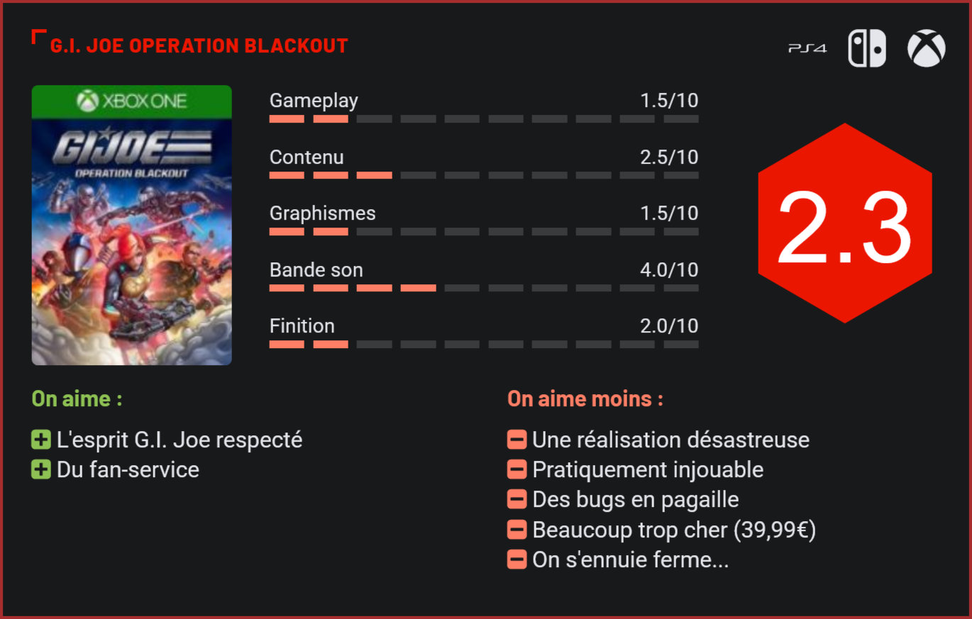 Annoncé il y a quelques mois seulement, G.I. Joe Operation Blackout n’aura pas beaucoup fait parler de lui jusqu’à sa sortie. Le titre de Gamemill est, sans surprise, l’une des plus grosses déceptions de cette fin d’année. La malédiction des jeux à licence a encore frappé. Et cette fois, c’est au tour des fans de la licence G.I. Joe d’en faire les frais. Maximum Games a confié au studio Gamemill le développement d’un third-person shooter dans l’univers de G.I. Joe. Annoncé il y a quelques mois, le projet n’a que très peu fait parler de lui jusqu’à sa sortie, en ce mois d’octobre. Un indice qui aurait déjà dû vous mettre la puce à l’oreille si vous attendiez le jeu. Sans grande surprise, le résultat est désastreux. Operation Blackout est tout simplement l’un des plus mauvais jeux de cette année et très certainement aussi l’une des pires adaptations de licence en jeu vidéo. Operation Blackout aurait très bien pu tourner sur les consoles de la précédente génération. Le jeu de Gamemill se positionne comme un shooter à la troisième personne. Il a toutefois été pensé pour être joué en coop. En solo, ce compagnon est remplacé par une IA au comportement désastreux. La sauce aurait encore pu prendre si le jeu était fun. Malheureusement, les niveaux ne font preuve d’aucune imagination. On avance en ligne droite tout en canardant tout ce qui se présente devant nous, on active une console, on ouvre une porte et occasionnellement on prend le contrôle d’une tourelle pour canarder des avions qui nous foncent dessus en ligne droite. Durant les séquences de shoot, les ennemis courent dans tous les sens sans jamais penser à prendre couverture ou faire preuve de la moindre initiative. Ils s’arrêtent régulièrement pour que vous puissiez les canarder joyeusement. Vous l’aurez compris, l’IA est désastreuse. Ceci étant dit, même en l’état, il aurait pu se positionner comme un shooter décomplexé. L’ennui, c’est que le jeu n’est pas fun pour deux sous. Les commandes sont imprécises et si la palette des commandes est assez large, on finit par vite par se contenter de foncer sur ses adversaires pour s’en débarrasser au corps à corps, vu la précision des tirs. Les combats de boss sont encore pire puisqu’il est impossible d’éviter leurs tirs, même avec du skill. Certains d’entre eux vous fonceront dessus sans jamais s’arrêter de vous canarder. Inutile de le préciser : le jeu est très frustrant et pas forcément très gai à parcourir. Le plus souvent, courir en ligne droite en matraquant le bouton de frappe au corps à corps reste la technique la plus efficace pour progresser rapidement. En s’appliquant, on arrive à maîtriser les commandes, mais celles-ci restent imprécises et surtout, le jeu n’est pas du tout agréable à prendre en main avec sa caméra non-stabilisée qui donne très vite des nausées. En terme d’expérience utilisateur, on frôle le désastre. Le jeu a été pensé pour être joué en coop. Techniquement, le titre fait très clairement partie des jeux les moins réussis de cette génération, avec un moteur graphique très pauvre, des effets visuels risibles et des animations d’un autre âge. La bande son est correcte, mais les quelques doublages et musiques qui nous accompagnent dans notre périple n’ont rien d’époustouflant et trahissent surtout un budget très serré. On le sent très bien, le jeu a été développé en quelques mois par une toute petite équipe et avec un budget hyper-limité. Esthétiquement très pauvre, bugué jusqu’à l’os, et souffrant d’une prise en main médiocre, G.I. Joe est l’archétype de l’adaptation ratée en jeu vidéo. Même en coop, le titre ne parvient pas à se montrer fun. On s’y ennuie ferme et très motivés seront ceux qui en verront le bout. Ceci étant dit, tout n’est pas à jeter non plus. Operation Blackout reste fidèle à l’univers de G.I. Joe et joue brillamment la carte du fan-service avec des skins à débloquer en solo, des tas de collectibles, de jolies cinématiques et des tas de personnages à incarner. Dommage que tout cela se retrouve dans un jeu d’une qualité aussi médiocre, de surcroit vendu à un tarif scandaleusement élevé. Il faudra en effet débourser 39,99€ pour faire l’acquisition du jeu. Inutile de le préciser : il y a beaucoup d’autres jeux beaucoup plus sympas à découvrir en ce moment… Conclusion Comme c’est souvent le cas avec les adaptations de films ou de comics en jeu vidéo, G.I. Joe Operation Blackout transpire l’adaptation bâclée. Le jeu a clairement été développé en quelques mois avec un budget très serré. S’il reste fidèle à l’univers des G.I. Joe et qu’il joue joliment la carte du fan-service avec ses nombreux collectibles à collecter, Operation Blackout est un piètre TPS. Le jeu est terriblement mou, l’IA désastreuse et les commandes très imprécises. Progresser à travers les niveaux du jeu est un véritable supplice. Esthétiquement, on est très loin aussi d’un jeu triple-A. G.I. Joe est même très loin d’exploiter tout le potentiel des consoles de la précédente génération. Pauvre graphiquement, pas passionnant pour deux sous et pratiquement injouable, G.I. Joe est l’archétype de l’adaptation ratée, de surcroit vendue presque plein tarif (39,99€). Inutile de le préciser, à moins d’être un fan absolu de la franchise, mieux vaut l’éviter.