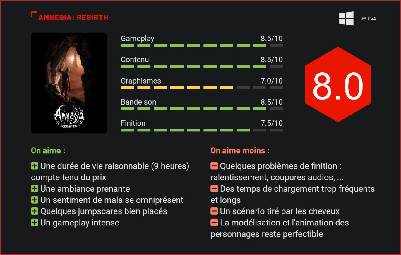 Dix ans après The Dark Descent, Frictional Games s’attaque à nouveau au jeu d’horreur avec un nouveau titre estampillé Amnesia. Une nouvelle aventure plus profonde est proposée, avec un enjeu toujours aussi important : votre survie … Les adeptes de jeux indépendants doivent très probablement avoir déjà entendu parler de Frictional Games. Ce studio suédois, spécialiste des survival-horror, a développé certains des titres indépendants les plus acclamés par la presse, comme les séries Penumbra et Amnesia. Deux franchises très proches l’une de l’autre, avec des gameplay sensiblement identiques. Il s’agira dans les deux de survivre, avec une vue à la première personne et une interaction complète avec les objets de l’environnement. La franchise Amnesia se base sur la perte de mémoires temporaire du personnage principal. Le premier épisode, Dark Descent, contait l’histoire de Daniel, jeune homme amnésique dont ne sait presque rien au début du jeu. La suite de cet épisode, Rebirth, se base sur les mêmes prémices pour son scénario. Un scénario qui démarre d’ailleurs sur les chapeaux de roue. A l’image d’un Uncharted 3 ou d’un film d’Indiana Jones, le joueur est dès le début victime d’un accident d’avion et se retrouve seul dans le désert au beau milieu des années 30. Ses compagnons de route ont disparu, et Tasi Trianon est prête à tout pour retrouver Salim, le père de l’enfant qu’elle porte. Car oui, votre héroïne est enceinte. Malgré le bébé qu’elle porte, Tasi va vivre de nombreux évènements surnaturels susceptibles de mettre en danger la vie de son bébé. Elle est en effet victime d’hallucinations et d’autres flashbacks tandis qu’une force inconnue semble vivre en son sein. Cette force la ronge de l’intérieur et entraîne des visions chez Tasi qui fera de nombreux allers-retours entre le monde des humains et une sorte de monde lugubre, refuge d’âmes perdues. Si la campagne commence très bien, elle nous perd malheureusement trop vite. A travers plusieurs documents parsemés ici-et-là dans l’environnement, Tasi recouvrera petit à petit la mémoire, mais on regrettera qu’elle ne laisse trop vite le spectateur sur le carreau. Les quelques flashbacks qui rythmeront la partie expliquent certains mystères sur l’histoire de Tasi, mais cela reste bien trop flou. L’héroïne aura de nombreuses visions, quelques fois vraiment loufoques et incompréhensibles. On se rappellera par exemple d’une vision qu’a Tasi, dans laquelle elle est de retour à Paris, dans la chambre de son nouveau-né. Soudain, les murs autour d’elle s’écroule et, à l’image d’un Death Stranding, on se retrouve face-à-face avec un fœtus de taille géante. Une scène très intrigante, qui laisse pantois le joueur et le laisse face à de nombreuses interrogations. Celles-ci ne seront résolues que bien plus tard dans l’aventure. Amnesia : Rebirth offre une ambiance très malsaine où le malaise est omniprésent. Dans sa quête à la poursuite de ses compagnons de route, Tasi se retrouvera vite confrontée à ses plus grandes peurs. Parmi celles-ci : l’obscurité et les scènes morbides. Tout le gameplay du titre repose d’ailleurs sur cet axe. Il faudra à tout prix garder Tasi et son bébé sereins, en restant autant que possible dans la lumière et loin des monstres qui la traquent. Le stress s’emparera très vite de vous, et rester trop longtemps dans la pénombre pourrait s’avérer fatal pour vous et votre nourrisson. Il sera alors capital d’économiser vos ressources, à commencer par vos allumettes et l’huile de votre lampe. Celles-ci vous serviront à éclairer votre chemin et ainsi rester autant que possible dans la lumière. Le système de jeu est quant à lui directement inspiré de son prédécesseur et des autres productions de Frictional Games. Ainsi, il est possible d’interagir avec presque tous les éléments du décor. Si la grande majorité de ceux-ci ne vous seront d’aucune utilité, il faudra en revanche prêter attention à ceux qui pourraient vous être utile dans la résolution des énigmes. Celles-ci sont très nombreuses et assez variées. Néanmoins, elles tendent à se répéter au fil de l’aventure, au point de parfois laisser le joueur. Le rythme de l’aventure est pour sa part très bien maîtrisé. Si au début celui-ci peut paraître assez soutenu et plutôt lent, il s’avère que cela colle très bien à l’ambiance générale du titre. Vous allez beaucoup explorer, tourner en rond voire revenir sur vos pas. En revanche, certaines scènes de fuite existent, pour notamment accélérer le rythme de l’aventure. Si celles-ci paraissent très scriptées, il n’empêche qu’elles sont très bien fichues, avec un réel stress qui pèse sur le joueur. Comme tout bon survival horror qui se respecte, Amnesia: Rebirth se veut très stressant mais aussi assez effrayant. Le monstre vous traquera sans cesse, et les différentes rencontres que vous aurez avec seront très bien amenées, sans être prévisibles comme on peut le voir sur certaines productions d’horreur. Si le titre est effrayant et apporte de très bons jumpscares, c’est notamment grâce à l’ambiance malsaine et à l’obscurité qui vous entoure. Dès le début, la grotte où vous atterrissez en plein milieu du désert vous plonge dans le stress, avec l’impression constante que l’on vous observe. Cela est également aidé par une excellente bande-sonore. Le gameplay se base sur vos peurs et notamment sur ce monstre qui vous traquera sans cesse. Difficile également d’évoquer l’excellente réalisation artistique de cet Amnesia. Comme évoqué plus haut, le joueur se retrouvera directement plongé dans les années 1930, au beau milieu d’un désert africain ou moyen-oriental. Les décors sont franchement très bien amenés et plutôt dépaysants, notamment dans la variété des environnements que d
