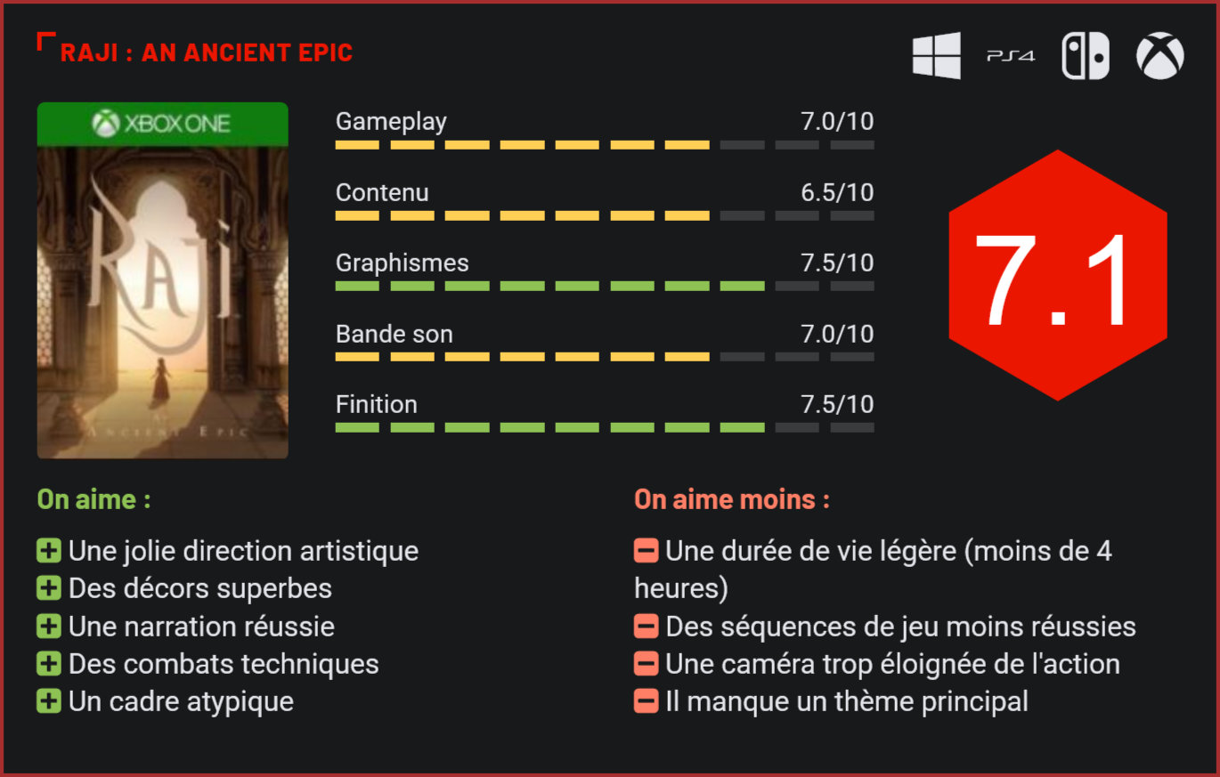 Premier projet du petit studio indien Nodding Heads Games, Raji : An Ancient Epic nous propose de partir à la découverte d’un mythe du continent asiatique. L’histoire de Raji nous emmène plusieurs milliers d’années dans le passé, à une époque où les dieux et les démons se livrent une guerre sans merci sur Terre. Dans la peau d’une jeune fille baptisée Raji, le joueur devra tenter de sauver son jeune frère, Golu, kidnappé par une horde de démons. Dans sa quête, la jeune femme sera épaulée par les divinités, qui lui confèrent des capacités uniques. La direction artistique du jeu est superbe. Ce qui frappe d’entrée de jeu dans Raji, c’est la direction artistique superbe de ce projet, qui s’empare brillamment de la culture indienne et nous propose voyager à travers des paysages superbes. Le scénario est mis en scène à travers de courtes cinématiques animées, absolument superbes. Ingame, le jeu se présente comme un mix relativement improbable de jeu de plates-formes et de hack & slash. La vue très éloignée permet d’apprécier les superbes panoramas du jeu. Mais ne vous y trompez pas, sous ses airs de jeu d’aventure à la Trine se cache en réalité un hack & slash brutal. Entre les séquences de plates-formes et les séquences narratives, le joueur devra affronter une armée de créatures maléfiques dans de petites zones de jeu. Le jeu prend alors une direction très surprenante, se présentant comme une sorte de God of War à la sauce indienne. Raji est une guerrière prodigieuse, capable de se projeter dans les airs et de marcher sur les murs pour éviter les coups de ses adversaires. Les combats dans Raji, s’apparentent à de formidables ballets aériens. D’une pression de bouton, le joueur peut passer du Trishul, son arme principale, au Sharanga, un arc d’une précision étonnante, que l’on utilisera principalement pour affaiblir les ennemis à distance avant de se lancer dans la mêlée. Le cocktail de genres surprend. Raji parvient en effet à mixer plusieurs séquences dans un même niveau, avec des combats intenses, de la plate-forme, de l’exploration, des séquences narratives et des combats de boss. Tous ne sont toutefois pas du même niveau. Si les combats sont plutôt efficaces, les séquences de plates-formes manquent cruellement de cachet et le manque de précision des commandes font qu’on chute régulièrement… Les combats de boss manquent également de challenge. Ceci étant dit, le voyage n’en reste pas moins captivant grâce à la narration très réussie, ce plaisir de la découverte, des décors sublimes et des affrontements nerveux. A défaut d’être un grand jeu, Raji est un très bon divertissement et indiscutablement une très belle découverte. Rares sont en effet les jeux à nous proposer de partir à la découverte d’une autre culture… Les combats sont d’une rare intensité. Clairement, le jeu de Nodding Heads Games aurait pu être bien meilleur. La caméra a tendance à être par exemple beaucoup trop éloignée de l’action. Cela permet de profiter pleinement des très jolis décors, mais d’un autre côté, on a parfois du mal à s’y retrouver et niveau immersion, on a déjà vu beaucoup mieux. Les séquences de plates-formes manquent également cruellement d’inspiration. 3 ou 4 sauts en ligne droite, et c’est bouclé. Ce sera pourtant souvent suffisant pour vous faire chuter jusqu’à votre mort… les contrôles manquant cruellement de précision lors de ces séquences. Des petits défauts qui viennent sensiblement entacher l’expérience, sans toutefois faire de Raji un mauvais jeu. Dans l’ensemble, on fera les mêmes reproches à la réalisation du titre, globalement réussie, et qui parvient à développer sa propre identité, mais qui manque de ce côté grandiose qui aurait fait de Raji un incontournable. Le jeu est joli, ses décors sont superbes, mais ils manquent de vie, ils souvent très vides et niveau mise en scène, le jeu est minimaliste. La bande son est du même acabit : les musiques accompagnent agréablement l’action, les doublages en anglais sont d’excellente facture, mais le titre manque d’un thème épique et encore une fois de vie lors des séquences de jeu. A travers l’aventure, le joueur découvrira la culture indienne, ses divinités, ses légendes. Pour un premier essai, Raji : An Ancient Epic est donc plutôt une belle réussite. Tant sur le plan narratif qu’au niveau de son gameplay ou de sa réalisation. Le titre est également proposé à un tarif attractif (entre 20 et 30€, selon la plate-forme). Attention toutefois, sa durée de vie est très légère. Ne comptez pas plus de 4 heures, en prenant votre temps. Et il ne s’agit pas forcément du type de jeu sur lequel on reviendra… Conclusion Raji : An Ancient Epic nous propose de partir à la découverte d’une légende indienne à travers une aventure palpitante, mêlant exploration, combats et plates-formes. Si le jeu est inégal, il propose une expérience unique et n’hésite pas à briser les codes du genre. Visuellement, Raji est une très jolie réussite. Les décors du jeu sont superbes et la direction artistique très inspirée. Le titre s’empare brillamment aussi de la culture indienne, qu’il nous fait découvrir à travers son récit. Sur le plan ludique, le constat est un peu plus nuancé. Les séquences de combat surprennent par leur intensité. La narration est brillante. En revanche, les séquences de plates-forme souffrent d’un level-design plat et d’un manque de précision des commandes. La caméra a également tendance à s’éloigner un peu trop de l’action. Niveau immersion, on a déjà vu beaucoup mieux. En revanche, les plans très larges permettent de parfaitement profiter des superbes panoramas du jeu. Raji : An Ancient Epic est une formidable invitation au voyage et à la découverte de la culture indienne. Le titre de Nodding Heads Games est cert