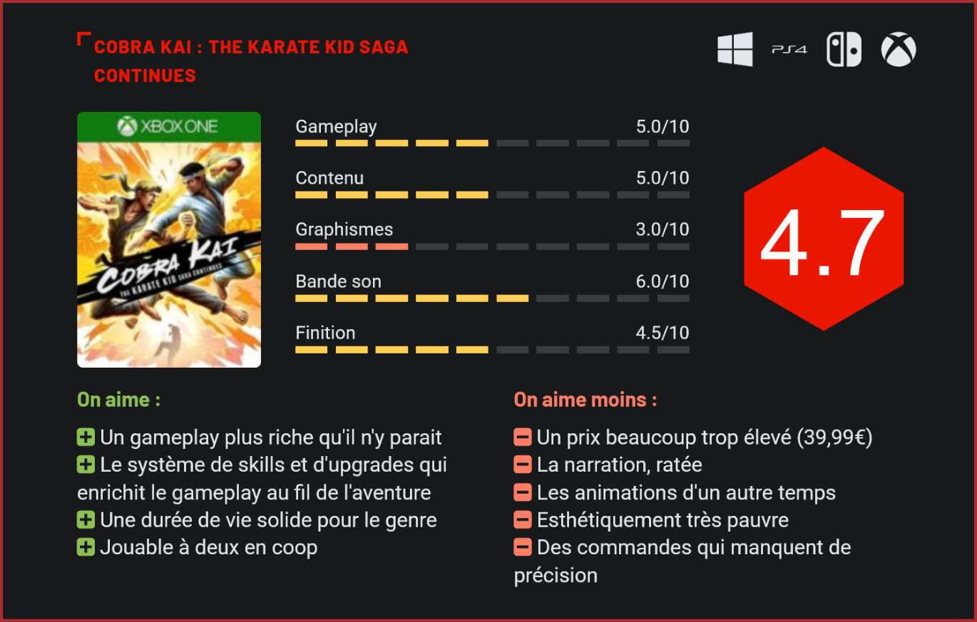 Surfant sur le succès de la série qui cartonne sur Netflix, GameMill Entertainment nous livre une adaptation de Cobra Kai en jeu vidéo. Vu l’ADN du studio, tout nous incitait à la prudence avec cette nouvelle adaptation. Si GameMill Entertainment a quelques petites réussites à son actif, comme le sympathique Nickelodeon Kart Racers 2, le studio est également l’auteur de quelques ratés, comme le très médiocre G.I. Joe : Operation Blackout, tout fraichement sorti. Plus inquiétant, il s’agissait du troisième projet du studio à voir le jour en cette fin d’année. Or, on le sait, mener de front trois projets dans le gaming relève de l’exploit. Et puis, bien sûr, il y avait l’annonce très tardive du jeu, présenté quelques semaines seulement avant sa sortie – ce qui n’est jamais très bon signe. On ne va pas vous le cacher, Cobra Kai : The Karate Kid Saga Continues est loin d’être une franche réussite, mais les fans de la franchise pourraient toutefois bien y trouver leur compte. Le jeu prend la forme d’un beat them all old-school, façon Streets of Rage. Car on le sent, les développeurs de Cobra Kai ont tenu à rendre un joli hommage à l’univers de la saga tout en jouant sur la fibre nostalgique des gamers. Ils ont ainsi choisi d’opter pour un beat them all old-school, dans la plus pure tradition du genre. Cobra Kai marche ainsi sur les traces de pointures comme Golden Axe et Streets of Rage. A leur différence toutefois, le jeu est entièrement en 3D – ce qui est probablement le choix le plus douteux pour cette adaptation. Car très clairement, les beat them all 3D n’ont pas le charme de leurs ancêtres. Et surtout, on sent que les développeurs ont travaillé avec des moyens extrêmement limités. Esthétiquement, le jeu n’est pas très beau. Toutefois, c’est surtout au niveau des animations que ça bloque, avec des mouvements hachés et un petit temps de latence entre l’entrée d’une commande et le coup porté à l’écran. La patte graphique du jeu n’est pourtant pas vilaine et quelques jolis effets de mise en scène sont même présents, lors des attaques spéciales notamment. Côté prise en main, c’est la douche froide la première heure de jeu. Lors du premier niveau, on n’a le choix qu’entre deux boutons de frappe et un de saut. La bonne nouvelle, c’est que le joueur débloquera progressivement skills et coups spéciaux à travers un vaste arbre de compétences. Chacune d’elle pourra être débloquée avec la monnaie virtuelle récupérée dans le jeu. Le concept est bien pensé, dans la mesure où on sent réellement son personnage évoluer au fil des niveaux. L’ennui, c’est qu’en début d’aventure, le jeu n’est pas très intéressant. Sur la durée en revanche, le gameplay gagne en profondeur et le titre montre un réel potentiel. D’autant plus qu’il est jouable à deux, en coop. Quelques jolis effets visuels sont présents lors des attaques spéciales. Côté durée de vie, l’expérience est plutôt solide. Le jeu propose en tout 28 niveaux, dont certains sont assez longs. Comptez en moyenne une grosse dizaine de minutes par niveau. Pour le genre, le contenu est donc très généreux. D’autant plus que les à-côtés sont nombreux avec les skills à débloquer et les défis à boucler. S’il se révèle plus riche qu’on attendait, Cobra Kai souffre d’un manque de précision des commandes et de finition dans l’ensemble. Le personnage se déplace beaucoup trop lentement à l’écran, la latence entre la commande et l’action conduit trop souvent à des coups donnés dans le vide et lors des passages trop musclés, le jeu a tendance à devenir vite très bordélique. On est très loin de la technicité et du rythme très soutenu d’un Streets of Rage. Plus triste encore, les combats de boss sont complètement bâclés et ne font qu’accentuer les défauts du jeu, avec des personnages qui se déplacent à l’écran de façon robotique, déclenchant régulièrement des super-attaques dans le vide. Et puis bien sûr, il y a la question du prix, scandaleusement élevé pour ce type de production. Cobra Kai est typiquement le genre de petit jeu sympa auquel on aurait dit oui à 15€. Mais à 39,99€, difficile de craquer sans y penser à deux fois, surtout à une période aussi chargée en sorties. Involontairement, le jeu s’enterre dans une niche. Seuls les fans purs et durs de la série y trouveront leur compte à ce prix. Le jeu est jouable à deux, en coop. On notera au passage que si le jeu transpire le fan-service avec des tas de collectibles à débloquer et une ambiance fidèle à la série, la mise en scène sous forme de bande-dessinée n’est pas une franche réussite. On s’ennuie souvent beaucoup devant ces planches sans vie – au point d’en venir très rapidement à zapper systématiquement chacune d’elles. C’est dommage, car en soi, le scénario n’était pas complètement inintéressant, d’autant plus que le jeu nous donne le choix de l’explorer à travers les yeux du clan Cobra Kai ou de l’école Miyagi-Do. Côté bande sonore, le résultat est convaincant. On retrouve les voix officielles de William Zabka et Ralph Macchio et quelques morceaux emblématiques du show. Ca fait le travail, à défaut de surprendre. Conclusion Fidèle à l’esprit Karate Kid, cette adaptation très libre de la série se destine avant tout aux fans purs et durs du show. Bourré de bonnes intentions, le jeu de GameMill manque toutefois clairement d’ambition. Les développeurs nous livrent un beat them all old-school à la proposition très séduisante, avec un gameplay qui s’enrichit au cours de l’aventure et un contenu généreux. Le titre marche sur les traces d’un Streets of Rage, mais n’en a toutefois pas l’allure. Les développeurs ont opté pour un univers 3D qui sied plutôt mal au genre. Esthétiquement assez pauvre, le titre souffre surtout d’animations