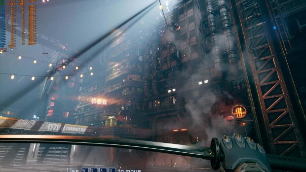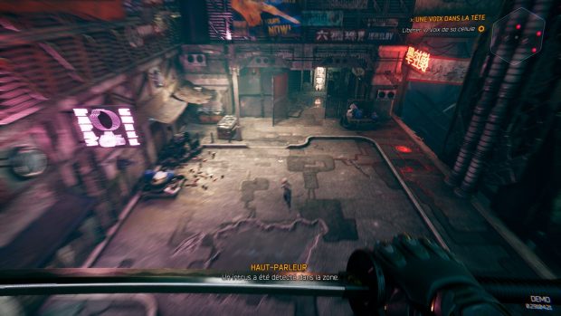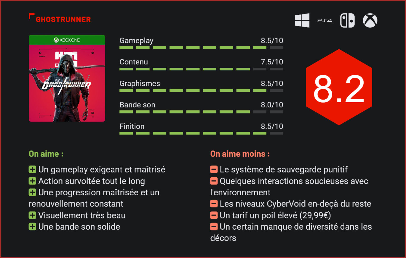 Le studio polonais One More Level livre avec Ghostrunner son premier jeu, un titre ambitieux et exigeant, qui s’impose comme l’une des sensations “indé” de cette fin d’année. Ghostrunner nous plonge dans un univers cyberpunk futuriste. Dans cette réalité, le seul rempart qu’il reste à l’Homme est une tour gigantesque à travers laquelle les derniers humains se battent pour survivre. Comme souvent dans les histoires dystopiques, cette tour incarne la hiérarchie de la société, tenue d’une main de fer par le Maître des Clefs. Cette organisation hiérarchisée ne s’est pas mise en place sans incident. On le découvre d’ailleurs à travers une cinématique à travers laquelle, notre héros, engagé dans la rébellion, est jeté du haut de la tour. Amnésique, notre personnage se réveille et est guidé par une voix mystérieuse qui lui demande de venir la libérer et de reprendre son combat contre le Maître des Clefs. Une quête qui va le pousser à traverser de rudes épreuves. Les soldats, menaces et obstacles en tous genres seront nombreux à se dresser sur sa route. Voilà le scénario de base que développe Ghostrunner. Une histoire qui est loin d’être originale et pourtant, cela ne l’empêche pas de transporter le joueur. On se laisse totalement embarquer dans la quête de notre héros souhaitant renverser le pouvoir en place. On pourrait tout de même émettre une petite critique quant à la manière dont le scénario est dressé. One More Level a en effet fait le choix de nous poser les bases de son jeu à travers des dialogues in-game qui apparaîtront sous la forme de sous-titres durant des séquences d’action. Pas toujours évident de suivre le fil si vous n’êtes pas un parfait anglophone. L’environnement est très joli et très travaillé et le devient de plus en plus au fil des niveaux. Une chose est sûre, Ghostrunner ne fait pas dans les fioritures. On met tout de suite les pieds dans le plat, quitte à en perdre les pédales. Le premier niveau de ce jeu de parkour punitif sert de tutoriel. Celui-ci est toutefois loin d’être représentatif du reste de l’aventure. Les indications sont en effet peu nombreuses et particulièrement peu explicites. Au final, on se retrouve à tâtonner avec le peu d’informations que l’on a reçu pour tenter de progresser dans le jeu. Comme nous l’avons dit, Ghostunner est un jeu de parkour à la manière d’un Mirror’s Edge, mais dans une version beaucoup plus frénétique et punitive. Le jeu joue la carte du « one shot, one kill » et ça fait mal. Le contexte est également très particulier, en raison de son univers, mais aussi de la mission de notre héros. Pour progresser, il faudra donc courir, sauter, enchaîner les plateformes et trancher nos ennemis à coup de katana à un rythme particulièrement soutenu. Le mot d’ordre dans Ghostrunner, c’est la frénésie. Tout va vite, que ça soit sauter sur les murs pour atteindre la plateforme suivante, éviter les balles adverses, massacrer ses ennemis ou encore mourir. On se retrouve donc ainsi à recommencer les parcours des dizaines de fois pour comprendre comment enchaîner la séquence correctement ou trouver la parade pour massacrer les ennemis tout en glissant sur les murs. L’expérience die & retry est particulièrement soutenue ici et la pression n’est relâchée à aucun moment. Les amateurs de ce genre de jeu y trouveront forcément leur compte. Pour les autres, il faudra faire preuve de patience et de retenue. Officiellement, il faudra moins d’une dizaine d’heures pour finir la vingtaine de niveaux de Ghostrunner, mais dans les faits, trouver la manière de traverser chaque séquence allongera bien la durée de vie du titre. Au fur et à mesure que notre héros gravit les étages, la difficulté se fera grandissante de manière parfaitement maîtrisée. Les bidasses sont rapidement remplacés par des unités d’élite aux capacités propres. Pour un premier jeu, le studio polonais fait preuve d’une parfaite maitrise à ce niveau. Progresser demandera une excellente maîtrise des touches au joueur, car il ne suffira pas de sauter d’un mur à l’autre, il faudra également éviter les balles qui fusent dans tous les sens. Pour cela, le joueur pourrait compter sur sa capacité à ralentir le temps qui lui permettra de straffer pour éviter la balle, mais aussi pour se retrouver rapidement à proximité de son adversaire pour le trancher en deux. Cette même compétence lui permettra également de sauter plus loin, d’aller plus vite ou tout simplement d’atteindre une plateforme particulièrement mal placée, mais là encore, il lui faudra apprendre à la maîtriser ce qui lui coûtera de nombreuses morts. Fort heureusement, la réapparition de notre héros se fera particulièrement vite, de quoi enchaîner les tentatives rapidement. La progression dans Ghostrunner se fait à la fois à l’horizontal et à la verticale. Au fil de la progression, le joueur pourra débloquer de nouvelles compétences lors de passages dans le CyberVoid – on y reviendra. Il pourra ainsi utiliser un grappin pour progresser dans les niveaux de la Tour, mais aussi se téléporter rapidement derrière un ennemi pour le transpercer. Le jeu impose en effet un rythme effréné d’esquives et d’attaques pour venir à bout des ennemis. Les nouvelles compétences telles que la vague d’énergie horizontale qui découpe plusieurs assaillants d’un coup seront donc les bienvenues. On notera également l’apparition de nouvelles interactions avec l’environnement, elles aussi bienvenues puisque les premiers niveaux seront assez pauvres sur ce point. Au bout d’un moment, le joueur pourra réaliser des hyper-sauts, lancer des shurikens pour désactiver des verrouillages électroniques ou encore se suspendre à des rails pour glisser à toute vitesse. Il faudra malheureusement patienter jusqu’à la seconde moitié du jeu pour profiter de