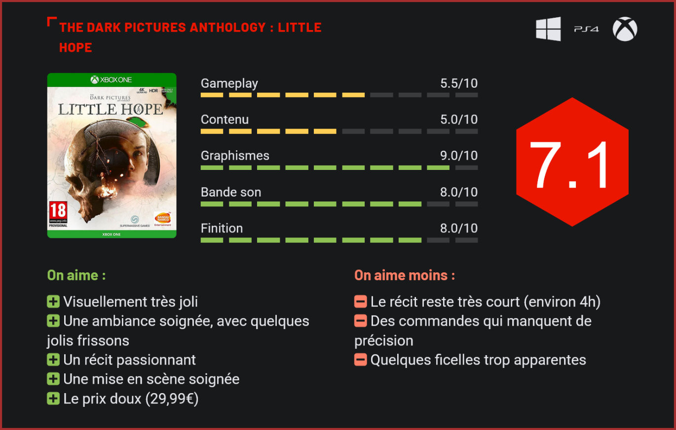Après un premier épisode décevant, The Dark Pictures Anthology nous revient avec un second chapitre baptisé “Little Hope”, qui troque les eaux du Pacifique pour un contexte beaucoup plus sombre puisque son intrigue nous emmène dans un petit village de la Nouvelle Angleterre. Les créateurs d’Until Dawn nous avaient livré en 2019 un nouveau jeu narratif au concept très séduisant. Premier chapitre d’une “anthologie de l’horreur”, Man of Medan avait toutefois eu beaucoup de mal à convaincre, la faute en grande partie à ses dialogues mal écrits et son scénario mal fignolé. Qu’à cela ne tienne, le studio revient à la charge un an plus tard avec Little Hope, le second épisode de sa série. Le jeu réserve son lot de passages effrayants. Pour ce second volet, les développeurs nous proposent une nouvelle histoire effrayante, toujours racontée par un narrateur qui donnera quelques indices sur le déroulement du scénario et évaluera les prestations du joueur entre chaque chapitre. Le contexte est ici très différent. Exit les eaux agitées du Pacifique et direction la Nouvelle Angleterre pour une histoire beaucoup plus sombre mais plus maîtrisée aussi que celle narrée dans Man of Medan. La séquence d’introduction du jeu donne le ton. Le joueur est le spectateur d’un drame familial qui pose le contexte. Le jeu est sombre, sanglant et surtout le casting qui nous est présenté ici est beaucoup plus séduisant que dans le premier chapitre. Exit les personnages hyper-stéréotypés et sensiblement agaçants de Man of Medan. Les six rôles principaux de Little Hope se révèlent beaucoup moins creux. On notera d’ailleurs que Supermassive Games a débauché quelques véritables acteurs pour les rôles principaux. On retrouve notamment l’excellent Will Poutler (Bandersnatch) dans le casting. Et il s’agit là d’ailleurs de l’une des principales évolutions de cette suite, qui affiche d’entrée de jeu un casting beaucoup plus intéressant que son ancêtre mais également un scénario plus riche et plus profond… Le narrateur intervient à la fin de chaque chapitre du jeu en commentant les décisions du joueur. Passé la séquence d’introduction, on se rend compte que Little Hope laisse plus de place à l’interprétation de son scénario que Man of Medan. Le joueur se retrouve au commande des cinq membres de la famille qui sont morts lors de la séquence d’introduction. A notre grande surprise, ceux-ci ont des identités différentes. Ils sont tous survivants d’un accident de la route. Ils choisissent logiquement de se diriger vers le village le plus proche pour tenter de contacter les secours et retrouver le chauffeur du bus qui a disparu. Mais le petit village de Little Hope est un patelin abandonné au beau milieu de la brume. Pas une âme à l’horizon. Nos survivants ne semblent toutefois pas seuls… Sorcellerie, esprits et paranoïa mènent le récit. Scénaristiquement, Little Hope se révèle beaucoup plus riche que Man of Medan mais également plus prenant. La narration est plus efficace, le récit est porté par un casting de haute volée, les temps morts sont rares et surtout les frissons sont beaucoup plus nombreux. Certes, les ficelles pourront paraître assez apparentes dans ce récit, avec quelques jump scares qu’on sent venir à des kilomètres, mais la recette fonctionne dans l’ensemble très bien. On a véritablement l’impression d’être assis face à un film fantastique. Esthétiquement, Little Hope est également une très belle réussite, tant dans sa direction artistique inspirée que dans ses modélisations soignées des décors, personnages et objets. L’atmosphère du jeu est lourde, les angles de caméras bien sentis et on se sent véritablement plongé dans un récit anxiogène. Pas de doute, Supermassive Games connait ses classiques. Les choix n’ont finalement que peu d’incidence sur le récit. Côté gameplay, le studio suédois reprend la formule du premier volet pratiquement à l’identique en mêlant cinématiques, choix narratifs (qui se limitent à deux options, ayant une incidence minimaliste sur le récit), de courtes séquences d’exploration (durant lesquelles on se contentera de trouver quelques documents pour en apprendre un peu plus sur le récit), et QTE. La bonne nouvelle, c’est que les quick time events ont été revus. Désormais, impossible de ne pas comprendre ce que l’on attend de nous. Il faudra appuyer le plus rapidement possible sur la touche qui apparaît à l’écran. Le joueur est averti au préalable de cette séquence de jeu par une alerte visuelle. Ca fonctionne, même si on regrette que ces séquences soient peu nombreuses et que les combinaisons de boutons ne soient guère compliquées. Les séquences de combat sont un peu moins réussies avec des passages au cours desquels il faudra cibler précisément la zone du corps d’un adversaire pour le frapper avant la fin du décompte. Ca fonctionne, mais le manque de précision des commandes fait qu’il est possible de rater son coup assez facilement… Durant les séquences d’exploration, le joueur sera libre d’évoluer à l’écran dans des décors soignés pour profiter des jolis panoramas et découvrir quelques notes qui lui en apprendront plus sur le récit. Une partie walking simulator qui fonctionne plutôt bien niveau ambiance mais qui manque cruellement de profondeur puisque rien, absolument rien ne se passera à l’écran durant ces séquences. Les personnages centraux sont beaucoup plus intéressants que dans Man of Medan. Le concept fonctionne donc, mais la recette ne fera clairement pas l’unanimité. Supermassive Games peut très clairement améliorer la formule. En l’état, on a plus souvent l’impression d’être simple spectateur d’un très bon film fantastique que joueur. Il n’empêche que le récit est beaucoup plus intéressant à suivre que par le passé. Côté durée de vie, il 