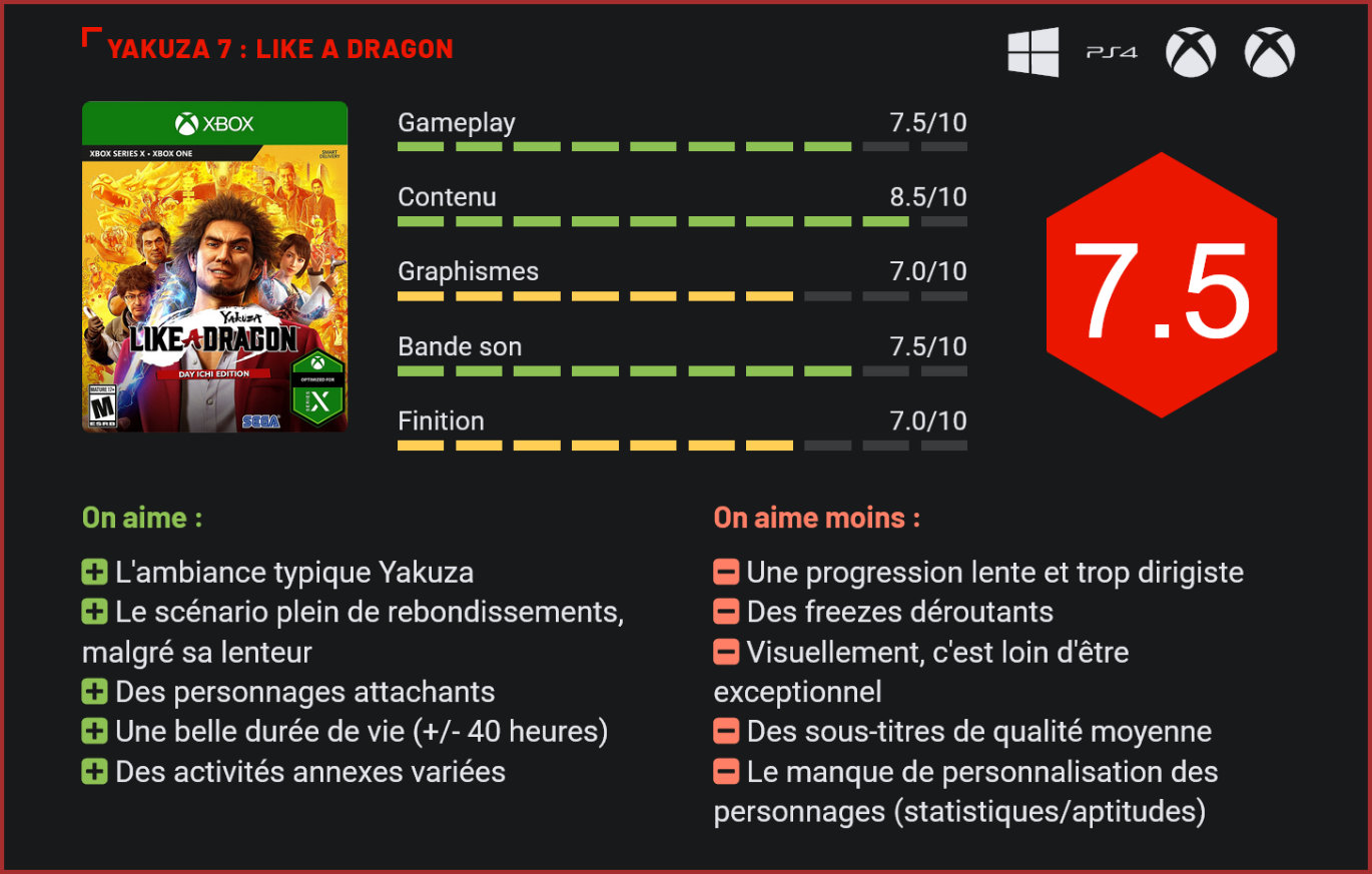 Si l’histoire du Dragon de Dojima s’est conclue dans Yakuza 6, le studio Ryu ga Gotoku n’a pas fini d’exploiter la saga des Yakuza. Pour ce septième épisode, le studio nous propose une refonte complète du concept. Quatre ans après la sortie de Yakuza 6, titre qui clôturait l’arc narratif du Yakuza repenti Kazuma Kiryu alias le Dragon de Dojima, et trois ans après le remake du second volet, Sega nous livre un septième épisode. S’il n’est plus question de Kiryu, Yakuza : Like a Dragon reprend malgré tout les bases de la franchise tout en introduisant quelques nouveautés. Dans ce septième volet, les fans de la saga feront la connaissance d’Ichiban Kasuga, apprenti Yakuza membre de la famille Arawaka. Pour prouver sa valeur et son honneur, le jeune Ichiban accepte de purger une peine d’emprisonnement pour un crime qu’il n’a pas commis, pensant ainsi être accueilli comme un héros à sa sortie de prison, 18 ans plus tard. Malheureusement, cela ne se passe pas comme prévu puisqu’il découvre que son sacrifice ne lui a servi à rien, pire, qu’il a été trahi par son ex-mentor, Masami Arakawa. Abandonné par ceux qu’il pensait être sa seule famille, Ichiban va alors se démener pour savoir ce qu’il s’est passé durant son absence et tenter de comprendre pourquoi il a été trahi malgré son sacrifice. Voilà les bases du scénario de Yakuza : Like a Dragon. Si le titre introduit un tout nouveau personnage et un nouvel environnement – le quartier de Yokohama –, le jeu exploite des thématiques déjà bien exploitées dans les précédents volets ; l’univers des Yakuzas, les trahisons, l’honneur, etc. Cependant, à l’image du nouveau héros, le ton de Like a Dragon se veut quelque peu plus léger que celui des précédents volets, ce qui n’est pas une mauvaise chose, cela marque d’ailleurs la scission avec Kiryu. Outre les thématiques abordées, on retrouve le même rythme que dans les précédents volets. Le jeu prend son temps pour poser les bases et introduire son nouveau personnage central. Une introduction particulièrement longue puisqu’il faudra en effet patienter plusieurs heures avant de véritablement découvrir le nerf de l’histoire de Yakuza : Like a Dragon, mais aussi profiter de toute la richesse du jeu au niveau du gameplay. Le fait est qu’on s’ennuie beaucoup durant la première partie du jeu, d’autant plus que celui-ci se veut très dirigiste. Au final, on se retrouve à enchainer les cinématiques et les combats sans saveur (ni aucune chance d’échec) durant un bon moment. Fort heureusement, quand l’histoire commence vraiment, on se laisse porter par la mésaventure d’Ichiban qui devient plus attachant et plus profond comme personnage. Yakuza : Like a Dragon introduit un tout nouveau héros qui se retrouvera rapidement dans les ennuis. Yakuza : Like a Dragon n’introduit pas seulement un nouveau personnage, mais aussi et surtout un nouveau gameplay. Le jeu repose en effet désormais sur des combats au tour par tour. C’est véritablement là où se situe la nouveauté de cet épisode. Les précédents volets de la saga se rangeaient plutôt du côté beat them up en temps réel. Ce choix de gameplay s’emboite plutôt bien dans l’aventure Yakuza : Like a Dragon et dans sa progression qui nous pousse à nous confronter régulièrement à des malfrats dans la rue. Une fois le combat lancé, le joueur peut choisir d’attaquer, d’utiliser des objets, de parer une attaque ou de réaliser une action spéciale qui exige des points de mana via une interface d’action qui rappelle assez fort celle de Persona 5. Le tout fonctionne plutôt bien, même si, comme nous l’avons déjà dit, il faudra attendre un certain temps pour que les combats deviennent vraiment plaisants. Dans la première partie du jeu, les affrontements sont en effet peu intéressants, de même que les ennemis qui sont loin d’être redoutables. Quant aux attaques spéciales, elles ne le sont pas vraiment… Ce n’est finalement que lorsque l’intrigue à proprement parler commence que les combats dévoilent tout leur potentiel. C’est ainsi qu’au bout de quelques heures de jeu, Ichiban Kasuga sera épaulé par d’autres personnages lors des combats. Le joueur devra donc jongler entre ses hommes pour venir à bout des ennemis. Les adeptes des jeux au tour par tour ne seront pas perdus, l’expérience de Yakuza 7 reste assez classique, mais le jeu parvient malgré tout à se démarquer en reprenant des éléments caractéristiques de la saga des Yakuza. Le joueur pourra ainsi compter sur les QTE censées renforcer les attaques, mais surtout sur la possibilité de se servir des décors pour mettre K.O. ses ennemis. On pourra ainsi lancer un vélo à la figure d’un adversaire, comme dans les précédents volets. On retrouvera également la violence et les attaques plutôt spectaculaires caractéristiques de la saga ce qui est évidemment une très bonne chose. La nouvelle orientation de la saga avec des combats au tour par tour fonctionne plutôt bien. À chaque victoire, nos héros gagneront de l’expérience qui leur feront monter de niveau et augmenteront leurs statistiques (attaque, défense, magie, soin, etc.). À la manière d’un RPG, le joueur pourra faire évoluer ses personnages et leur affubler des armes et de l’équipement pour les rendre plus performants au combat, mais aussi dans leur boulot. Il est en effet question de choisir un job, une spécialisation qui se traduira par certaines aptitudes, mais dans les faits, l’amélioration de nos personnages se fera sans nous. L’évolution des statistiques et l’apparition de nouvelles compétences se font en effet automatiquement à chaque niveau. C’est plutôt dommage. On aurait préféré que le studio pousse cet aspect à fond et nous laisse gérer nous-mêmes l’évolution de nos personnes, mais cela aurait peut-être trop dénaturé la série. Malgré ce