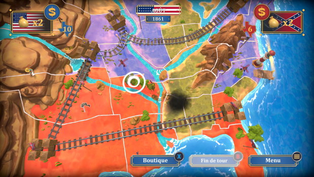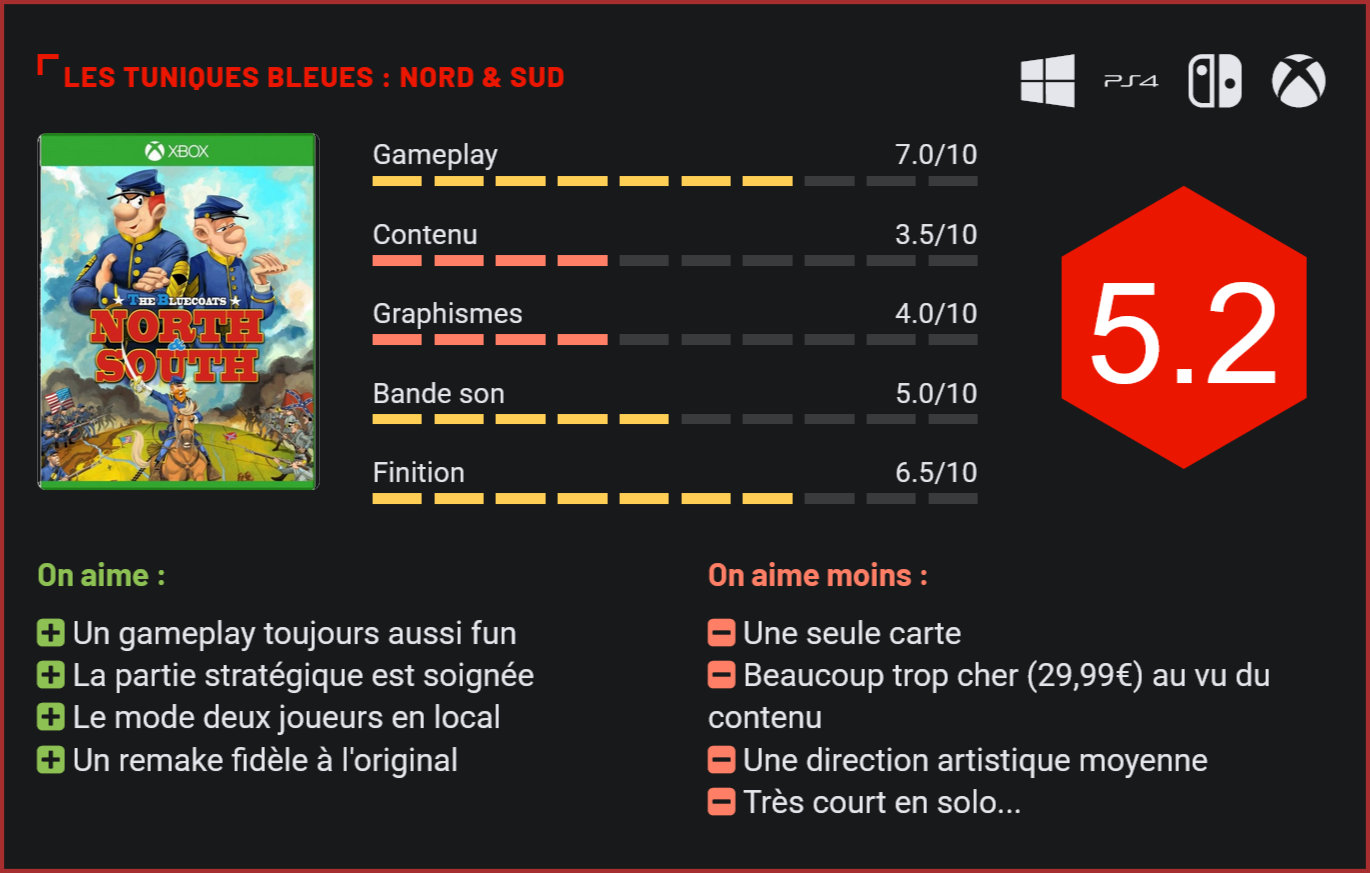 Remake d’un classique du jeu de stratégie, Les Tuniques Bleues : Nord & Sud surfe sur la vague nostalgique pour tenter de reconquérir les fans de la célèbre bande dessinée. Avec un succès modéré. L’éditeur français Microids s’est récemment lancé dans une vague de remasters et remakes en tous genres. Après nous avoir livré les remakes des deux premiers Astérix & Obélix et en attendant le remake du jeu XIII, l’éditeur s’attaque à un autre monument de la bande dessinée francophone : Les Tuniques Bleues. Le jeu prend la forme d’un jeu de stratégie au tour par tour captivant. Sorti en 1989 sur Commodore et Atari ST, le jeu North & South, adapté de la célèbre bande-dessinée éditée par Dupuis, avait connu un certain succès, au moins d’avoir droit à un premier remake il y a quelques années. L’éditeur français Microïds l’a tout naturellement repéré et s’est dit qu’il serait bon de nous livrer un nouveau remake en 2020. Un choix audacieux en cette période très chargée en sorties… Microïds a assez logiquement choisi de jouer sur la carte nostalgique des joueurs en livrant un titre d’une grande fidélité au matériau de base. Notons-le d’entrée de jeu également : la démarche est radicalement différente du remake de XIII puisque le titre qui nous est aujourd’hui proposé conserve quelques éléments du jeu originel mais rajoute également quelques petites nouveautés. Certaines séquences se jouent désormais entièrement à la première personne. Dans les faits, le titre prend toujours la forme d’un jeu de stratégie au tour par tour dans lequel les armées confédérées et nordistes s’affrontent sur une carte des Etats-Unis remise au goût du jour. Nord & Sud se joue comme une partie de Risk. Chaque joueur décide les territoires qu’il va envahir au cours de son tour, appelle des renforts s’il dispose de suffisamment de crédits, et tente de prendre plusieurs lieux stratégiques. Malgré les apparences, le titre est plus stratégique qu’il n’y paraît. Car d’une part, il faut gérer les affrontements et le positionnement de ses troupes à l’écran, et de l’autre mener des objectifs sur le long terme pour venir à bout des forces adverses. Pour remporter la partie, il faudra donc capturer des forteresses qui permettront d’obtenir des crédits supplémentaires à la fin de chaque tour, s’emparer d’un phare et couper les routes de ravitaillement de son adversaire. Les parties peuvent dès lors s’éterniser, si le joueur que vous affrontez fait preuve de stratégie. Les batailles prennent la forme de mini-jeux. La plupart des actions sur le plateau de jeu donneront lieu à des mini-jeux. Lors des combats sur l’échiquier, le joueur devra prendre les commandes de plusieurs régiments de fantassins, canons et de cavaliers qu’il ne pourra diriger qu’un à un. On passe d’un à l’autre en temps réel d’un clic de la gâchette. L’objectif est simple : éliminer l’adversaire en ayant le moins de pertes possibles. La cavalerie est de loin l’unité la plus efficace car elle est capable de se déplacer très vite, mais les fantassins représentent une belle ligne de protection et sont capables d’éliminer leurs ennemis à distance. Le canon servira lui à faire de lourds dégâts dans les rangs adverses. Gérer tout ce petit monde en temps réel n’est pas évident, mais les parties sont intenses et fondamentalement très funs. Parmi les autres séquences de jeu, on en retrouve deux qui se déroulent à la première personne. L’objectif est simple : protéger ou attaquer un train en éliminant tous ses ennemis ou prendre ou défendre une place forte en éliminant de nouveau tous ses ennemis. Pas de respawn possible, vous n’avez ici qu’une seule vie. Si les ennemis ne sont pas très doués, leur nombre joue en votre défaveur. Un peu moins réussies, ces séquences de jeu restent toutefois assez funs, en particulier à deux joueurs. Le jeu propose également un mode versus à deux joueurs. L’ajout de ce mode multijoueur à deux, uniquement en écran splitté, est plutôt une bonne chose. Car pour peu que votre adversaire soit un minimum doué, les parties peuvent vite devenir très funs. Cela permet aussi de compenser le contenu assez léger du jeu, qui ne propose que quatre missions principales en solo et une seule carte – ce qui est somme toute logique puisque c’était le cas sur l’original, mais on aurait aimé plus de diversité, d’autant plus que ladite carte est assez petite. Esthétiquement, le jeu prend un look beaucoup plus cartoonesque que ses ancêtres et si la palette des couleurs est plutôt fidèle à la bande dessinée, on regrette que les modélisations soient aussi grossières et que la direction artistique ne soit pas des plus inspirées. Nord & Sud n’est pas un jeu moche mais pour 30€, on est loin d’avoir l’impression d’avoir fait une bonne affaire. Et c’est finalement là le plus gros défaut de ce titre, qui aurait été une bonne surprise à 10€, mais qui n’offre juste pas assez de contenu pour justifier son tarif de 30€… A ce prix, seuls les fans de la franchise et les joueurs nostalgiques fonceront tête baissée. Pour les autres, mieux vaut probablement attendre une petite baisse de prix. Dommage, car il y avait là un réel potentiel. Conclusion S’il reste fidèle à l’original, ce remake du jeu North & South de 1989 se révèle étonnamment avare en contenu, avec une seule carte et quatre missions seulement au programme. A 10€, cela serait passé comme une lettre à la poste. A 30€, difficile de justifier un tarif aussi élevé avec un contenu aussi léger… Le jeu de stratégie au tour par tour de Microïds est pourtant un titre très fun à jouer ou à deux, en local. La partie stratégique est beaucoup plus profonde qu’elle n’y paraît, les mini-jeux sont funs et la prise en main réussie. Il faudra ici s’emparer d
