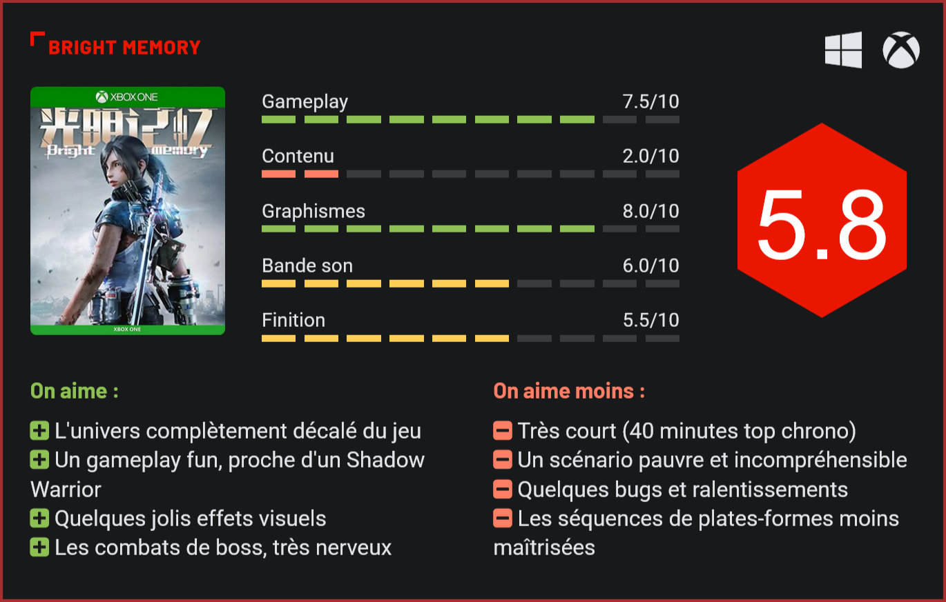Création d’un seul homme, Bright Memory nous en avait mis plein les yeux lors de sa présentation officielle. En attendant la sortie du jeu complet, son créateur propose d’en découvrir le prologue, vendu séparément au tarif de 7,99€. Bright Memory Infinite fait partie des titres next-gen les plus attendus. Le jeu de Zeng “FYQD” Xiancheng nous en avait mis plein les yeux lors de la première conférence Xbox. Son créateur avait alors annoncé qu’il proposerait un premier aperçu du jeu sous la forme d’une grosse démo payante, qui serait en réalité le prologue de l’aventure. L’avantage, c’est que ladite démo est disponible dès le lancement de la nouvelle console de Microsoft et nous permet ainsi d’avoir un petit aperçu des capacités de la machine. Car très clairement, Bright Memory est une jolie démo technique des capacités des consoles next-gen. Le jeu alterne gunfights et séquences de plates-formes. En attendant la sortie de Bright Memory Infinite, le “jeu complet”, on a donc la possibilité de parcourir une grosse démo d’environ 40 minutes, qui nous donne déjà un bel aperçu du jeu. Bright Memory alterne séquences de gunfights à la Shadow Warrior, combats de boss à la Doom et courtes séquences de plates-formes à un rythme impressionnant. On ne comprend pas grand chose de ce qui se passe à l’écran puisqu’on voit apparaître coup sur coup morts-vivants, loups, militaires armés jusqu’aux dents, créatures ailées et boss titanesques, sans aucune explication narrative. Très clairement, le jeu est avare en explications. Sa mise en scène est très décousue également. On espère que dans le jeu complet, on comprendra davantage l’intrigue. Ce qui semble clair ici, c’est que l’on incarne une sorte de Lara des temps modernes, armée jusqu’aux dents, qui se bat tant à distance avec ses quelques armes de poing (mitrailleuse, shotgun et revolver) qu’au corps à corps avec ses coups de katana et ses quelques attaques spéciales (EMP,…). Le scénario est très maladroitement mis en scène. Pad en main, c’est plutôt nerveux voire carrément intense. Le gameplay joue également la carte du scoring puisque les combos rapportent des points qui permettent de faire grimper votre note jusqu’au triple-S. La plupart se déroulent ici dans des petites arènes qui sont généralement limitées par des obstacles, on est face à une structure très archaïque du FPS. Bright Memory n’en reste pas moins très fun. Le personnage est capable d’esquiver les attaques de ses adversaires avec un bouton de straffe. Elle frappe également juste avec son katana. Le feeling, arme en main, est également très bon. C’est toutefois lors des combats de boss, très intenses, que Bright Memory montre tout son potentiel. Dans le prologue, il n’y en a que deux. Le jeu final devrait nous en réserver bien davantage. Les séquences de plates-formes et quelques énigmes rencontrées ne présentent en revanche pas le jeu sous son meilleur jour. Le gameplay y est relativement pauvre et beaucoup moins maîtrisé que dans un Doom Eternal notamment. On combat des boss titanesques. Finalement très proche d’un Doom, avec un soupçon de Shadow Warrior, Bright Memory est plutôt une bonne surprise, malheureusement de très courte durée puisqu’il ne faudra pas plus de 40 minutes pour en venir à bout. On y retourne volontiers une ou deux fois, et compte tenu du prix (7,99€), le contenu est très correct, mais très clairement il s’agit d’une démo payante. Esthétiquement, le jeu est plutôt joli sans nous en mettre plein les yeux. Les effets visuels sont stylés, les décors superbes et le jeu exploite plutôt bien certains effets artistiques, mais lorsqu’on enlève tous ces artifices, le titre n’est pas forcément une claque graphique. Son créateur a en revanche un sacré talent pour être parvenu à développer pratiquement seul un titre esthétiquement aussi réussi. Il est possible d’acquérir certaines compétences spéciales. Carton rouge en revanche au niveau de la finition, avec des menus qui n’ont clairement pas été pensés pour être utilisés au pad (on y dirige un… curseur!), quelques vilains ralentissements ingame et quelques jolis bugs également. Très clairement, le jeu a été porté sur console sans grande attention. Côté bande son, pas grand chose à signaler. Les bruitages sont corrects, mais les morceaux et les doublages passent complètement au second plan. Ca sent la petite production. On espère de tout coeur que le jeu Infinite ira beaucoup plus loin… Conclusion Drôle d’idée que celle de Playism de proposer un aperçu payant de son ambitieux FPS sur PC et Xbox Series. Vendu 7,99€, ce prologue s’expédie en moins de 40 minutes. L’expérience est courte mais plutôt intense. Bright Memory se situe quelque part à mi-chemin entre un Doom et un Shadow Warrior. Il s’agit d’un FPS futuriste gore et très nerveux, dans lequel le joueur affrontera des boss titanesques et un bestiaire assez varié. Visuellement, le jeu donne un bel aperçu des capacités des consoles next-gen. L’expérience est toutefois de très courte durée et le background très mal amené. Le scénario est absolument incompréhensible ici. Très clairement, il y a du potentiel pour le jeu complet, Bright Memory Infinite. En l’état toutefois, il n’y a pas grand chose à ronger sur cet os que le studio chinois nous jette. Dommage car il n’y a vraiment pas grand chose à explorer pour le moment sur next-gen…