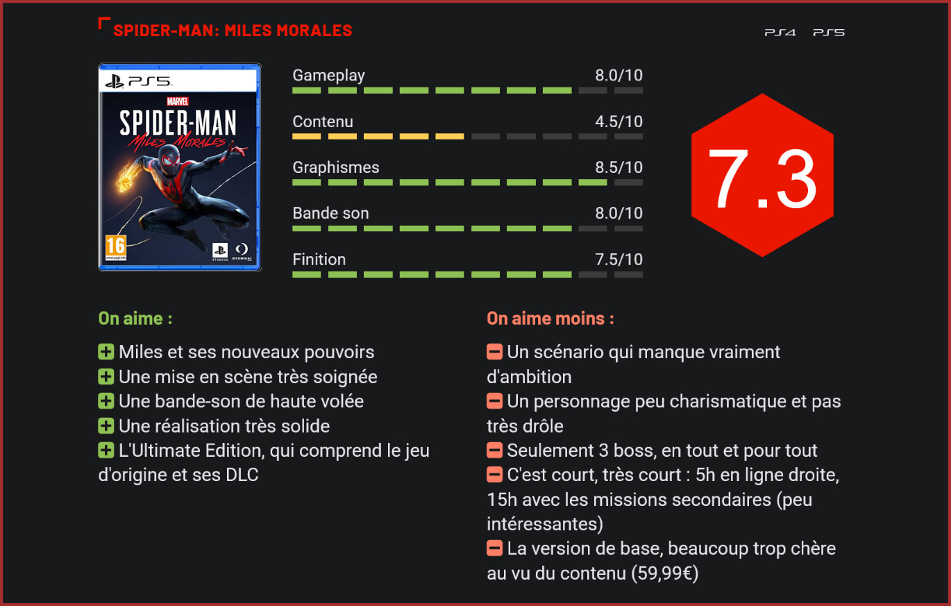 Pour accompagner le lancement de sa nouvelle PlayStation 5, Sony a choisi de faire de la suite de son jeu Spiderman la star de son line-up. Un choix qui n’est en soi pas très surprenant au vu du succès rencontré par le premier volet… Parmi les premiers jeux PS5 présentés, Spider-Man: Miles Morales était l’un des titres les plus impressionnants présentés par Sony jusqu’à ce jour et incontestablement un titre majeur du line-up de la PlayStation 5. Présenté dès son annonce comme un spin-off du premier volet, le jeu nous place dans la peau d’un second Spider-Man, allié de l’incontournable Peter Parker. Le studio Insomniac avait toutefois tenu à rassurer les fans : Spider-Man: Miles Morales ne serait pas une simple extension mais un jeu complet, facturé d’ailleurs au prix plein (59,99€). La réalité est toutefois sensiblement différente. Car si le titre est stand-alone (il ne nécessite pas l’original pour être lancé), son contenu est beaucoup plus léger que celui du jeu originel. Comptez 5 à 6h pour finir l’aventure en ligne droite et jusqu’à 15h pour boucler toutes les missions secondaires. Des missions secondaires qui ne sont malheureusement guère plus passionnantes que dans le premier volet puisqu’il sera question de retrouver des collectibles ou d’empêcher des crimes. Les combats sont extrêmement intenses. On ne va pas vous le cacher, au niveau de son contenu, ce second volet ressemble plus à un grosse extension qu’à une véritable suite. Insomniac ne s’est d’ailleurs pas gêné pour recycler le contenu du premier volet. Ne vous attendez pas à de nouveaux environnements dans cette suite, on restera à New-York. Un très fin tapis de neige vient toutefois couvrir les décors du jeu. Si l’aventure n’en reste pas moins plaisante, on ne peut s’empêcher de penser qu’Insomniac s’est contenté du minimum syndical. On dénombre seulement trois boss en tout et pour tout, six ou sept ennemis différents et une quinzaine de missions principales. La bonne nouvelle, c’est que l’aventure se laisse déguster avec plaisir. La mise en scène du jeu est digne d’une grosse production hollywoodienne et à ce titre parfaitement maîtrisée. Le scénario du jeu nous place dans la peau de Miles Morales, le nouvel allié de Peter Parker, déjà croisé dans le premier jeu Spiderman, qui hérite de certains pouvoirs de Peter, tout en développant ses propres capacités. De ce point de vue là, Miles Morales est une très belle réussite : le personnage se dirige comme Spiderman, mais dispose de pouvoirs électrisants qui ajoutent une nouvelle dimension au gameplay puisqu’il est désormais possible de charger ses coups avant de les porter, pour briser notamment la garde d’un adversaire. Au fil de l’aventure, Miles découvrira également de nouveaux pouvoirs, comme l’invisibilité, qui lui permettra de jouer davantage la carte de l’infiltration, ou l’attaque de zone, qui lui permettra de faire le ménage autour de lui en effectuant une attaque au sol. Les ennemis manquent clairement de diversité… Le gameplay du jeu s’inscrit dans la lignée du précédent volet et reste à ce titre la plus belle réussite d’Insomniac. Les séquences de survol de Manhattan sont grisantes, les sensations lors des plongeons de Spidey incroyables, les combats extrêmement dynamiques, nerveux et techniques, et les séquences d’infiltration tout autant réussies. Lors de certaines missions, le joueur aura d’ailleurs le choix de son approche : il pourra opter pour une approche frontale pour des affrontements dantesques ou une approche infiltration, auquel cas il devra éliminer chaque ennemi sans être repéré. Les deux approches ont le mérite d’être aussi fun l’une que l’autre. Si le jeu est extrêmement scripté et dirigiste dans son scénario, il prend place dans un monde ouverte qui laisse une certaine liberté au joueur mais qui manque cruellement de profondeur. On retrouve là un peu le symptôme d’un Mafia : un jeu à l’univers grandiose malheureusement totalement sous-exploité. Certaines séquences de jeu sont dignes d’un film à gros budget. L’open-world de Spider-Man: Miles Morales est plein de vie. Les quartiers de Manhattan sont remplis de passants, des pigeons survolent régulièrement la foule, au loin, on peut apercevoir des avions dans le ciel. Les couchers de soleil couplés au ray-tracing et à la fine couche de neige donnent à la ville une allure de carte postale. C’est beau, très beau même, au point qu’on en vient à se demander pourquoi le studio n’a pas fait plus d’efforts pour exploiter davantage cet univers. L’intrigue principale du jeu manque d’ailleurs elle aussi cruellement d’ambition, avec un scénario hyper-local, une menace minimaliste et un casting finalement très léger, qui gravite uniquement autour des proches de Miles Morales. Ce dernier se révèle également moins drôle mais également moins charmant que Peter Parker. Rien de très surprenant puisqu’on n’a finalement pas vraiment droit à une véritable introduction au personnage. Les séquences de jeu les plus impressionnantes sont totalement scriptées. Autre vilain défaut du jeu : ses combats de boss, non seulement peu nombreux (4 dont une redite) mais pas tous très maîtrisés. La séquence d’intro face à Rhino vous en mettra plein les yeux, mais les autres affrontements de boss manquent cruellement de saveur et de subtilité. De surcroit, on a trop souvent l’impression que ces boss ne sont finalement que des variantes des bidasses qu’on a affronté durant toute l’aventure… Très clairement, Miles Morales aurait dû être vendu au prix d’une extension – à 20 ou 30€, mais certainement pas 59,99€. L’édition spéciale à 79,99€, qui comprend ce nouvel épisode, le remaster du premier et ses extensions est à l’inverse plutôt une bonne affaire pour ceux qui étaient passés à côté