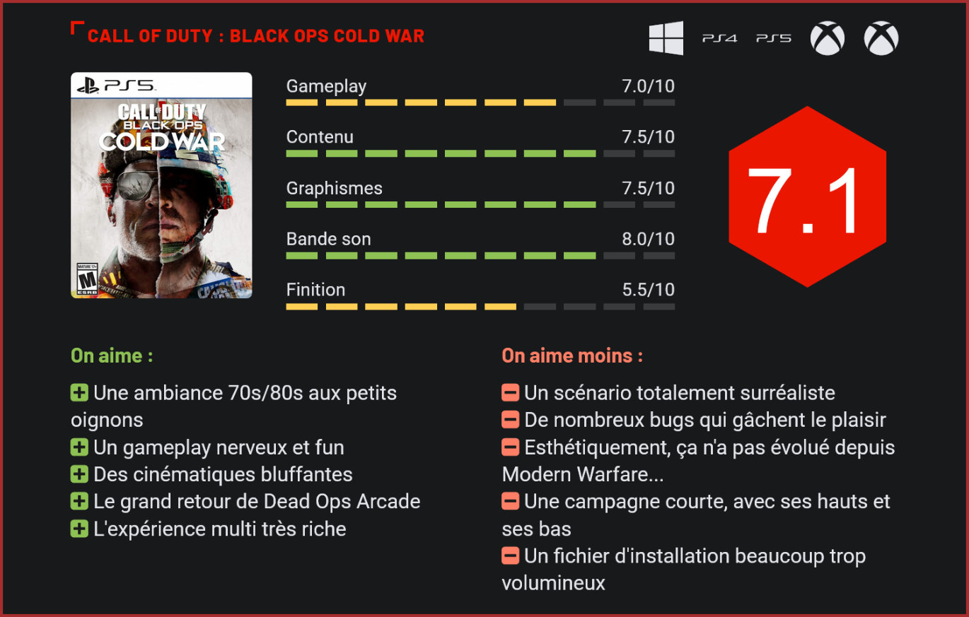 Après s’être intéressé à la Seconde Guerre mondiale, Call of Duty nous propose de nous plonger en pleine Guerre Froide. Un retour aux sources plein de promesses, avec notamment l’arrivée d’une version next-gen, attendue au tournant. On ne présente plus la franchise désormais culte des Call of Duty. Forte de plus de 320 millions d’exemplaires vendus, la franchise est devenue une incontournable dans le monde des FPS. La sortie d’un nouvel épisode reste un évènement en soi. Avec seulement quatre titres sortis, la sous-série des Black Ops est pourtant parvenue à fédérer une communauté de fans. Guerre Froide oblige, on retrouve ses principaux protagonistes dans les années 80, dont Ronald Reagan et Mikhail Gorbatchev. Le développement de ce Cold War, annoncé il y a seulement trois mois, fut pourtant chaotique. De nombreuses dissensions entre Sledgehammer et Raven Software vinrent mettre du plomb dans l’aile du projet. Treyarch prit finalement en main le développement du multijoueur tandis que le studio Raven se vit confier la finalisation du mode solo… Un Cold War résolument plus nostalgique et qui renoue avec ses premiers amours et notamment le premier Black Ops. Nous replongeons donc en pleine Guerre Froide, avec des haltes en URSS, aux États-Unis, mais aussi à Cuba et chez les Viet-Congs, Guerre du Viêt Nam oblige. Vous l’aurez compris, le scénario de Cold War et celui du premier Black Ops sont intimement lié, avec la présence de quelques protagonistes emblématiques qui avaient fait les beaux jours du premier opus. Plusieurs passages du jeu se déroulent au Viêt-Nam. Nombreux sont ceux qui se rappellent de l’interminable menace nucléaire qui pesait sur le monde dans la seconde moitié du XXe siècle et de l’opposition farouche entre le Bloc de L’Est et celui de l’Ouest. Force est de constater que Cold War en reprend les principaux codes. Au programme : une bombe nucléaire, un espion russe du KGB et des héros américains prêts à sauver le monde des ogives nucléaires soviétiques. Non, ce scénario n’est pas celui d’un blockbuster américain de la fin des années 1980 mais bien celui de Call of Duty : Black Ops Cold War. Vous incarnerez Bell et aiderez les agents Mason, Woods et Adler à traquer Perseus, un agent soviétique prêt à tout pour saper la puissance de l’Occident. Le scénario du jeu a beau être simple, il fonctionne en grande partie grâce à la mise en scène très stylée du jeu, son ambiance rétro et ses protagonistes principaux. On se sent véritablement plongé au coeur du complot. On notera d’ailleurs que pour la première fois dans un Call of Duty, le joueur pourra récupérer des éléments qui lui permettront de mener son enquête et qui influenceront le récit. Niveau immersion, on est plongé dedans et cette approche unique confère à ce Cold War une identité qui lui est propre. Ne nous voilons toutefois pas la face, si la narration est réussie, le scénario n’est pas des plus passionnants et toutes les idées ne fonctionnent pas forcément. De façon générale, le récit a tendance à être trop dramatique et surréaliste, avec, vous vous en doutez, beaucoup de patriotisme américain. Cela aurait pu passer comme une lettre à la poste si Raven avait pris le soin d’être un minimum fidèle à l’Histoire. L’ennui, c’est que la lecture se fait ici à sens unique. On est proche d’une propagande pure et dure. La guerre menée par les Américains paraîtrait d’ailleurs presque trop propre dans ce Cold War. Comme on l’a toutefois dit, cet épisode introduit quelque très bonnes idées. Le joueur gagne ainsi plus de contrôle sur le déroulement de son aventure. Plusieurs choix s’offriront ainsi à vous, comme la manière d’interroger un individu ou les phrases que vous formulerez dans un dialogue. Il vous sera en effet possible d’interagir avec les PNJ autour de vous, notamment dans votre base secrète. Ce sera là que vous interagirez avec les membres de votre équipe, afin par exemple d’en apprendre plus sur eux et leur passé. La campagne veut désormais plus impliquer le joueur, en lui faisant notamment personnaliser son personnage. Certaines missions vous permettront aussi d’adopter plusieurs approches différentes. C’est le cas notamment de cette mission dans laquelle vous incarnez un agent double russe infiltré au sein de la Loubianka, le bâtiment du KGB. Vous devrez alors récupérer la clé d’un bunker top-secret d’entre les mains d’un général russe et aurez alors plusieurs moyens pour parvenir à vos fins. Il sera ainsi possible d’empoisonner ce général, de le discréditer voire de le faire assassiner par un prisonnier. Le concept est intéressant, même si dans la pratique, on a souvent l’impression d’être sur un rail. N’espérez pourtant pas ici un open-world. La planque ne vous servira par ailleurs pas uniquement à papoter avec vos comparses. Elle sera également utile afin de planifier vos missions. Sur un grand tableau seront regroupés de nombreux documents, que vous pouvez évidemment lire afin d’en apprendre plus sur l’histoire, mais qui serviront aussi de “preuves” pour vos missions secondaires. A la trame principale viennent s’ajouter deux missions secondaires dont l’intérêt réside principalement dans la manière dont vous y aurez accès. Alors que l’une vous demandera de décrypter une disquette en déchiffrant toute une série de nombres, l’autre nécessitera de retrouver trois agents renégats en analysant plusieurs preuves. L’intérêt des missions à proprement parler reste quant à lui plutôt anecdotique, mais elles ont le mérite d’exister et de légèrement prolonger une durée de vie malheureusement trop courte. Niveau décors, il y a beaucoup de diversité dans la campagne solo. En effet, à peine nous avons eu le temps de savourer cette campagne et de nous mettre dans le bain que nous approchons dé